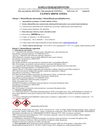 KARTA CHARAKTERYSTYKI Sporządzona zgodnie z Rozporządzeniem WE Nr 1907/2006 (REACH) oraz z Rozporządzeniem Komisji (UE) 453/2010 Data sporządzenia: 08.03.2010 r. Data aktualizacji: 03.09.2014 r. Ilość stron: 1/6 wersja:2.0 CLINEX SHINE STEEL Sekcja 1. Identyfikacja mieszaniny i identyfikacja przedsiębiorstwa. 1.1 Identyfikator produktu: CLINEX SHINE STEEL 1.2 Istotne zidentyfikowane zastosowania substancji lub mieszaniny oraz zastosowania odradzane: 1.2.1 Zastosowania zidentyfikowane: Preparat do czyszczenia i nabłyszczania stali nierdzewnej 1.2.2 Zastosowania odradzane: Nie określono 1.3 Dane dotyczące dostawcy karty charakterystyki: 1.3.1Dystrybutor: AMTRA Sp. z o. o. 1.3.2 Adres: ul. Schonów 3, 41-200 Sosnowiec 1.3.3 Telefon/Fax: +48 32 2944100 / + 48 32 2944139 1.3.4 Adres email osoby odpowiedzialnej za kartę charakterystyki: [email protected] 1.4 Numer telefonu alarmowego: +48 32 294 41 30 (w godzinach 800- 1600), 112 ( ogólny telefon alarmowy),998 Sekcja 2. Identyfikacja zagrożeń. 2.1 Klasyfikacja mieszaniny: 2.1.1. Zagrożenia dla człowieka: Produkt został sklasyfikowany jako niebezpieczny Klasyfikacja wg Rozporządzenia 1272/2008/WE (CLP) Asp.Tox.1- Zagrożenie spowodowane aspiracją, kategoria 1 H304-Połknięcie i dostanie się przez drogi oddechowe może grozić śmiercią Klasyfikacja wg Dyrektywy 1999/45/WE Xn- Produkt szkodliwy R65-Działa szkodliwie; może powodować uszkodzenie płuc w przypadku połknięcia. R66- Powtarzające się narażenie może powodować wysuszanie lub pękanie skóry 2.1.2 Zagrożenie dla środowiska: Produkt jest klasyfikowany jako niebezpieczny dla środowiska. Klasyfikacja wg Rozporządzenia 1272/2008/WE (CLP) Aquatic Chronic 4- Stwarzające zagrożenie dla środowiska wodnego, kategoria przewlekła, kategoria 4 H413-Może powodować długotrwałe szkodliwe skutki dla organizmów wodnych Klasyfikacja wg Dyrektywy 1999/45/WE R53-Może powodować długo utrzymujące się niekorzystne zmiany w środowisku wodnym. 2.1.3 Zagrożenia wynikające z właściwości fizycznych i chemicznych: Klasyfikacja wg Rozporządzenia 1272/2008/WE (CLP) Flam. Liq.3-Substancja ciekła łatwopalna, kategoria 3 H226- Łatwopalna ciecz i pary EUH066-Powtarzające się narażenie może powodować wysuszanie lub pękanie skóry Klasyfikacja wg Dyrektywy 1999/45/WE R10-Produkt łatwopalny R66- Powtarzające się narażenie może powodować wysuszanie lub pękanie skóry 2.2. Elementy oznakowania: 2.2.1 Oznaczenie literowe i określenie niebezpieczeństwa: H226- Łatwopalna ciecz i pary. H304-Połknięcie i dostanie się przez drogi oddechowe może grozić śmiercią. H413-Może powodować długotrwałe szkodliwe skutki dla organizmów wodnych. 2.2.2 Nazwy niebezpiecznych składników umieszczone na etykiecie: węglowodory, C11-C12, izoalkany aromatyczne < 2% 2.2.3 Symbol zagrożenia: NIEBEZPIECZEŃSTWO 2.2.4Warunki bezpiecznego stosowania: P210- Przechowywać z dala od źródeł ciepła/iskrzenia/otwartego ognia/ gorących powierzchni. Palenie wzbronione. P273- Unikać uwolnienia do środowiska. P301+P310- W PRZYPADKU POŁKNIĘCIA: Natychmiast skontaktować się z OŚRODKIEM ZATRUĆ/ lekarzem. P331- NIE wywoływać wymiotów. P405- Przechowywać pod zamknięciem. P501- Zawartość/ pojemnik usuwać do usuwać do punktów zbiórki odpadów niebezpiecznych lub specjalnych. 2.2.4Dodatkowe informacje: EUH066-Powtarzające się narażenie może powodować wysuszanie lub pękanie skóry Zawiera d-Limonen (Limonene). Może powodować wystąpienie reakcji alergicznej. Produkt przeznaczony wyłącznie do użytku zawodowego. 2.3 Inne zagrożenia: Brak informacji na temat spełniania kryteriów PBT lub vPvB zgodnie z załącznikiem XIII Rozporządzenia Komisji (UE) Nr 253/2011 z dnia 15 marca 2011r. Badania nie zostały przeprowadzone. KARTA CHARAKTERYSTYKI Sporządzona zgodnie z Rozporządzeniem WE Nr 1907/2006 (REACH) oraz z Rozporządzeniem Komisji (UE) 453/2010 Data sporządzenia: 08.03.2010 r. Data aktualizacji: 03.09.2014 r. Ilość stron: 2/6 wersja:2.0 CLINEX SHINE STEEL Sekcja3.Skład i informacje o składnikach 3.1 Substancje: Nie dotyczy 3.2 Mieszaniny: Nazwa chemiczna składnika Zakres stężeń Numer CAS Numer WE Węglowodory, C11-C12, izoalkany aromatyczne <2% Nr rejestracji: 0121194472146-39-0001 64%-65% 64741-65-7 918-167-1 Klasyfikacja wg 67/548/EWG Xn, R65, R66, R53 Klasyfikacja wg 1272/2008/WE Flam. Liq..3; H226 Asp. Tox.1; H304 Aquatic Chronic.4; H413, EUH 066 SEKCJA 4. ŚRODKI PIERWSZEJ POMOCY 4.1 Opis środków pierwszej pomocy: 4.1.1 Połknięcie: W razie połknięcia przepłukać jamę ustną, wyjąć protezy dentystyczne jeśli są. Przetransportować do najbliższej placówki medycznej celem podjęcia leczenia. Pokazać opakowanie lub etykietę. Jeśli wystąpią spontanicznie wymioty, trzymać głowę poniżej bioder. Nie wywoływać wymiotów. 4.1.2. Zatrucie inhalacyjne: Wynieść poszkodowanego z miejsca narażenia i zapewnić dostęp świeżego powietrza oraz spokój i odpoczynek. W przypadku dolegliwości (kaszel, wymioty, zawroty głowy, świszczący oddech) zapewnić pomoc lekarską. Nieprzytomnego ułożyć w pozycji bocznej. 4.1.3. Skażenie skóry: Zdjąć skażoną odzież. Skórę zmyć ciepłą wodą z mydłem. W razie wystąpienia podrażnienia skóry skontaktować się z lekarzem. 4.1.4.Skażenie oczu: Jeżeli poszkodowany nosi szkła kontaktowe niezwłocznie je wyjąć. Dokładnie przemyć oczy dużą ilością wody, wywijając powieki. Zapewnić pomoc okulisty. Uwaga: osoby narażone na skażenie oczu powinny być pouczone o konieczności i sposobie natychmiastowego płukania oczu 4.2 Najważniejsze ostre i opóźnione objawy oraz skutki narażenia: Zapalenie skóry może obejmować wrażenie pieczenia lub suchy/popękany wygląd skóry. Podrażnienie skóry może wrażenie pieczenia, zaczerwienienia, obrzęk lub pęcherze. Inne objawy centralnego układu nerwowego mogą obejmować ból głowy, nudności i brak koordynacji. 