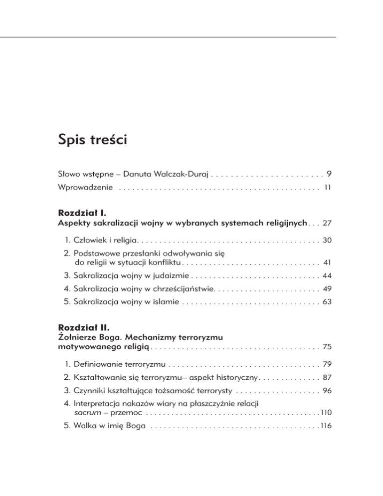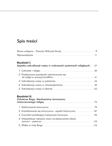 Spis treści Słowo wstępne – Danuta Walczak-Duraj . . . . . . . . . . . . . . . . . . . . . . . 9 Wprowadzenie . . . . . . . . . . . . . . . . . . . . . . . . . . . . . . . . . . . . . . . . . . . . . 11 Rozdział I. Aspekty sakralizacji wojny w wybranych systemach religijnych . . . 27 1. Człowiek i religia . . . . . . . . . . . . . . . . . . . . . . . . . . . . . . . . . . . . . . . . . 30 2. Podstawowe przesłanki odwoływania się do religii w sytuacji konfliktu . . . . . . . . . . . . . . . . . . . . . . . . . . . . . . . 41 3. Sakralizacja wojny w judaizmie . . . . . . . . . . . . . . . . . . . . . . . . . . . . . 44 4. Sakralizacja wojny w chrześcijaństwie. . . . . . . . . . . . . . . . . . . . . . . . 49 5. Sakralizacja wojny w islamie . . . . . . . . . . . . . . . . . . . . . . . . . . . . . . . 63 Rozdział II. Żołnierze Boga. Mechanizmy terroryzmu motywowanego religią . . . . . . . . . . . . . . . . . . . . . . . . . . . . . . . . . . . . . . 75 1. Definiowanie terroryzmu . . . . . . . . . . . . . . . . . . . . . . . . . . . . . . . . . . 79 2. Kształtowanie się terroryzmu– aspekt historyczny . . . . . . . . . . . . . . 87 3. Czynniki kształtujące tożsamość terrorysty . . . . . . . . . . . . . . . . . . . 96 4. Interpretacja nakazów wiary na płaszczyźnie relacji sacrum – przemoc . . . . . . . . . . . . . . . . . . . . . . . . . . . . . . . . . . . . . . . . .110 5. Walka w imię Boga . . . . . . . . . . . . . . . . . . . . . . . . . . . . . . . . . . . . . .116 Rozdział III. Główne doktryny dżihadyzmu w świetle rozwoju myśli fundamentalistycznej . . . . . . . . . . . . . . . . . . . . . . . . . . . . . . . . . 129 1. Specyfika fundamentalizmu religijnego . . . . . . . . . . . . . . . . . . . . . 136 2. Oddziaływanie myśli fundamentalistycznej na doktryny dżihadyzmu 142 3. Podstawowe doktryny dżihadyzmu . . . . . . . . . . . . . . . . . . . . . . . . 165 4. Między fundamentalizmem a dżihadyzmem . . . . . . . . . . . . . . . . . 191 Rozdział IV. Dżihadystyczny terroryzm Al-Kaidy . . . . . . . . . . . . . . . . . . . . . . . . . . 201 1. Geneza i rozwój Al-Kaidy . . . . . . . . . . . . . . . . . . . . . . . . . . . . . . . . . 204 2. Infrastruktura terrorystyczna w Afganistanie . . . . . . . . . . . . . . . . . .219 3. Mechanizmy oddziaływania idei dżihadyzmu na muzułmanów w Europie . . . . . . . . . . . . . . . . . . . . . . . . . . . . . . . 228 4. Iracki front dżihadu . . . . . . . . . . . . . . . . . . . . . . . . . . . . . . . . . . . . . 247 5. Al-Kaida jako symbol dżihadystycznego terroryzmu . . . . . . . . . . 251 Rozdział V. Socjologiczna analiza oświadczeń islamistów . . . . . . . . . . . . . . . . . 265 1. Oświadczenie Osamy ibn Ladena z 6 października 2001, będące komentarzem do zamachu z dnia 11 września 2001 r. . . . 267 2. Oświadczenie Osamy ibn Ladena i Sulejmana Abu Gaita z dnia 9 października 2001 r. . . . . . . . . . 274 3. Oświadczenie Osamy ibn Ladena, Aymana al-Zawahiri, Abu Jasira Rifa’i Ahmada Taha, Mir Hamzaha, Fazlura Rahmana „Dżihad przeciw Żydom i krzyżowcom” z 23 lutego 1998 r. . . . 282 4. Oświadczenie Osamy ibn Ladena dla katarskiej telewizji Al-Dżazira z 23 września 2001 r. . . . . . . . . . . . . . . . . . . . . . . . 291 5. Oświadczenie Osamy ibn Ladena z 12 listopada 2002 r., skierowane do obywateli Australii . . . . . . . . . . . . . . . . . . . . . . . . . . 296 6. Oświadczenie Osamy ibn Ladena z 18 października 2003 r., adresowane do mieszkańców USA . . . . . . . . . . . . . . . . . . . . . . . . 303 7. Oświadczenie Osamy ibn Ladena z 19 października 2003 r., skierowane do mieszkańców Iraku . . . . . . . . . . . . . . . . . . . . . . . . . 309 8. Oświadczenie Osamy ibn Ladena z 15 kwietnia 2004 r., adresowane do państw Europy . . . . . . . . . . . . . . . . . . . . . . . . . . . . .317 9. Oświadczenie związanych z Al-Kaidą Brygad Abu Hafs al Masri z 11 marca 2004 r. . . . . . . . . . . . . . . . . . . . . . . 325 10. List pozostawiony przez porywaczy samolotów 11 września 2001 r. . . . . . . . . . . . . . . . . . . . . . . . . . . . . . . . . . . . . . 332 Wnioski . . . . . . . . . . . . . . . . . . . . . . . . . . . . . . . . . . . . . . . . . . . . . . . . . . . 340 Zakończenie . . . . . . . . . . . . . . . . . . . . . . . . . . . . . . . . . . . . . . . . . . . . . . 344 Aneks I . . . . . . . . . . . . . . . . . . . . . . . . . . . . . . . . . . . . . . . . . . . . . . . . . . 355 Aneks II . . . . . . . . . . . . . . . . . . . . . . . . . . . . . . . . . . . . . . . . . . . . . . . . . . 377 1. Bin Laden’s statement, October 06, 2001 . . . . . . . . . . . . . . . . . . . 378 2. Osama bin Laden and Sulaiman Abu Ghaith’s statement October 09, 2001. . . . . . . . . . . . . . . . . . . . . . . . . . . . . . 379 3. World Islamic Front Statement February 23, 1998. “Jihad Against Jews and Crusaders”. . . . . . . . . . . . . . . . . . . 380 4. Bin Laden’s statement September 23, 2001 . . . . . . . . . . . . . . . . . 383 5. Bin Laden‘s message November 12, 2002 . . . . . . . . . . . . . . . . . . 384 6. Bin Laden’s message to US October 18, 2003 . . . . . . . . . . . . . . . 386 7. Bin Laden’s message to Iraqis October 19, 2003 . . . . . . . . . . . . . 388 8. Bin Laden’s truce offer to Europe April 15, 2004 . . . . . . . . . . . . . 391 9. The ‘Al-Qaida’ Madrid Statement March 11, 2004 . . . . . . . . . . . . 395 10. Letter Left by Hijackers September 29, 2001. . . . . . . . . . . . . . . . . 396 From God to Terror. The Role of Religion in the Jihadism Ideology Examplified by the Al Qaeda (Summary) . . . . . . . . . . . . . . . . 402 Bibliografia. . . . . . . . . . . . . . . . . . . . . . . . . . . . . . . . . . . . . . . . . . . . . . . . 405 Indeks nazwisk. . . . . . . . . . . . . . . . . . . . . . . . . . . . . . . . . . . . . . . . . . . . . .415