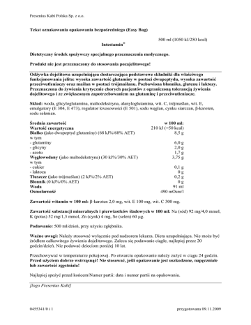 Fresenius Kabi Polska Sp. z o.o. Tekst oznakowania opakowania bezpośredniego (Easy Bag) 500 ml (1050 kJ/250 kcal) Intestamin® Dietetyczny środek spożywczy specjalnego przeznaczenia medycznego. Produkt nie jest przeznaczony do stosowania pozajelitowego! Odżywka dojelitowa uzupełniająca dostarczająca podstawowe składniki dla właściwego funkcjonowania jelita: wysoka zawartość glutaminy w postaci dwupeptydu, wysoka zawartość przeciwutleniaczy oraz maślan w postaci trójmaślanu. Pozbawiona błonnika, glutenu i laktozy. Przeznaczona do żywienia krytycznie chorych pacjentów z ograniczoną tolerancją żywienia dojelitowego i ze zwiększonym zapotrzebowaniem na glutaminę i przeciwutleniacze. Skład: woda, glicyloglutamina, maltodekstryna, alanyloglutamina, wit. C, trójmaślan, wit. E, emulgatory (E 304, E 473), regulator kwasowości (E 501), sodu węglan, cynku siarczan, β-karoten, sodu selenian. Średnia zawartość Wartość energetyczna Białko (jako dwupeptyd glutaminy) (68 kJ%/68% AET) w tym - glutaminy - glicyny - azotu Węglowodany (jako maltodekstryna) (30 kJ%/30% AET) w tym - cukier - laktoza Tłuszcze (jako trójmaślan) (2 kJ%/2% AET) Błonnik (0 kJ%/0% AET) Woda Osmolarność w 100 ml: 210 kJ (=50 kcal) 8,5 g 6,0 g 2,0 g 1,7 g 3,75 g 0,1 g 0g 0,2 g 0g 91 ml 490 mOsm/l Zawartość witamin w 100 ml: β-karoten 2,0 mg, wit. E 100 mg, wit. C 300 mg. Zawartość substancji mineralnych i pierwiastków śladowych w 100 ml: Na (sód) 92 mg/4,0 mmol, K (potas) 52 mg/1,3 mmol, Zn (cynk) 4 mg, Se (selen) 60 µg. Podawanie: 500 ml/dzień, przy użyciu zgłębnika. Ważne uwagi: Należy stosować wyłącznie pod nadzorem lekarza. Dieta uzupełniająca. Nie może być źródłem całkowitego żywienia dojelitowego. Zaleca się podawanie ciągłe, najlepiej przez 20 godzin/dzień. Nie podawać dzieciom poniżej 10 lat. Przechowywać w temperaturze pokojowej. Po otwarciu opakowanie należy zużyć w ciągu 24 godzin. Przed użyciem dobrze wstrząsnąć! Nie stosować, jeśli opakowanie jest uszkodzone, napęczniałe lub zawartość zgęstniała! Najlepiej spożyć przed końcem/Numer partii: data i numer partii na opakowaniu. [logo Fresenius Kabi] 0455341/0 i 1 przygotowana 09.11.2009 Fresenius Kabi Polska Sp. z o.o. Producent: Fresenius Kabi Deutschland GmbH D-61346 Bad Homburg, Niemcy Dystrybutor: Fresenius Kabi Polska Sp. z o.o. ul. Hrubieszowska 2 01-209 Warszawa 0455341/0 0455341/1 0455341/0 i 1 przygotowana 09.11.2009