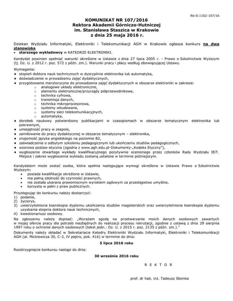 KOMUNIKAT NR 107/2016 Rektora Akademii Górniczo-Hutniczej im. Stanisława Staszica w Krakowie z dnia 25 maja 2016 r. Rb-D.1102-107/16 Dziekan Wydziału Informatyki, Elektroniki i Telekomunikacji AGH w Krakowie ogłasza konkurs na dwa stanowiska starszego wykładowcy w KATEDRZE ELEKTRONIKI. Kandydat powinien spełniać warunki określone w Ustawie z dnia 27 lipca 2005 r. - Prawo o Szkolnictwie Wyższym (tj. Dz. U. z 2012 r. poz. 572 z późn. zm.). Warunki pracy i płacy według obowiązującej Ustawy. Wymagania: stopień doktora nauk technicznych w dyscyplinie elektronika lub automatyka, doświadczenie w prowadzeniu zajęć dydaktycznych, przygotowanie merytoryczne do prowadzenia zajęć dydaktycznych w obszarze elektroniki w zakresie: o analogowe układy elektroniczne, o elementy elektroniczne/przyrządy półprzewodnikowe, o technika cyfrowa, o transmisja danych, o technika mikroprocesorowa, o systemy wbudowane, o systemy sieci telekomunikacyjnych, o automatyka, dorobek naukowy potwierdzony publikacjami w czasopismach w obszarze tematycznym elektronika lub pokrewnym, umiejętność pracy w zespole, zamiłowanie do pracy dydaktycznej w obszarze tematycznym – elektronika, znajomość języka angielskiego na poziomie B2, zaświadczenie o odbytym szkoleniu pedagogicznym lub ukończeniu studiów pedagogicznych, wzorowa postaw etyczna (zgodna z www.agh.edu.pl-Dokumenty-„Kodeks Etyczny”), wygłoszenie otwartego wykłady kwalifikacyjnego pozytywnie ocenionego przez członków Rady Wydziału IEiT. Miejsce i zakres wygłoszenia wykładu zostaną ustalone w terminie późniejszym. Kandydatem może zostać osoba, która spełnia następujące wymogi określone w Ustawie Prawo o Szkolnictwie Wyższym: posiada kwalifikacje określone w Ustawie, ma pełną zdolność do czynności prawnych, nie została ukarana prawomocnym wyrokiem sądowym za przestępstwo umyślne, korzysta w pełni z praw publicznych. Przystępując do konkursu należy dostarczyć: 1) podanie, 2) życiorys, 3) uwierzytelniona kserokopia dyplomu ukończenia studiów magisterskich oraz uwierzytelniona kserokopia dyplomu uzyskania stopnia doktora nauk technicznych, 4) kwestionariusz osobowy. Na zgłoszeniu należy dopisać: „Wyrażam zgodę na przetwarzanie moich danych osobowych zawartych w mojej ofercie pracy dla potrzeb niezbędnych do realizacji procesu rekrutacji, zgodnie z ustawą z dnia 29 sierpnia 1997 roku o ochronie danych osobowych (tekst jedn.: Dz. U. z 2015 r. poz. 2135 z późn. zm.).” Dokumenty należy składać w Sekretariacie Katedry Elektroniki Wydziału Informatyki, Elektroniki i Telekomunikacji AGH (al. Mickiewicza 30, C-3, IV piętro, pok. 416) w terminie do dnia: 5 lipca 2016 roku Rozstrzygnięcie konkursu nastąpi do dnia: 30 września 2016 roku R E K T O R prof. dr hab. inż. Tadeusz Słomka