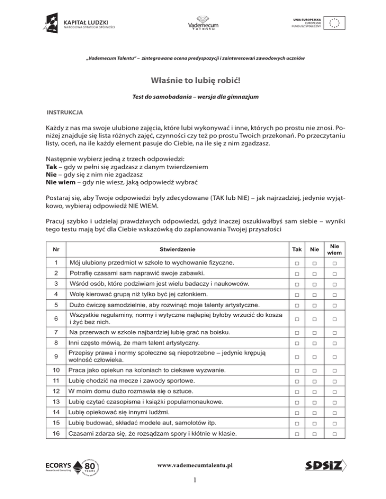 „Vademecum Talentu” – zintegrowana ocena predyspozycji i zainteresowań zawodowych uczniów Właśnie to lubię robić! Test do samobadania – wersja dla gimnazjum INSTRUKCJA Każdy z nas ma swoje ulubione zajęcia, które lubi wykonywać i inne, których po prostu nie znosi. Poniżej znajduje się lista różnych zajęć, czynności czy też po prostu Twoich przekonań. Po przeczytaniu listy, oceń, na ile każdy element pasuje do Ciebie, na ile się z nim zgadzasz. Następnie wybierz jedną z trzech odpowiedzi: Tak – gdy w pełni się zgadzasz z danym twierdzeniem Nie – gdy się z nim nie zgadzasz Nie wiem – gdy nie wiesz, jaką odpowiedź wybrać Postaraj się, aby Twoje odpowiedzi były zdecydowane (TAK lub NIE) – jak najrzadziej, jedynie wyjątkowo, wybieraj odpowiedź NIE WIEM. Pracuj szybko i udzielaj prawdziwych odpowiedzi, gdyż inaczej oszukiwałbyś sam siebie – wyniki tego testu mają być dla Ciebie wskazówką do zaplanowania Twojej przyszłości Nr Stwierdzenie Tak Nie Nie wiem □ □ □ □ □ □ □ □ □ □ 1 Mój ulubiony przedmiot w szkole to wychowanie fizyczne. 2 Potrafię czasami sam naprawić swoje zabawki. 3 Wśród osób, które podziwiam jest wielu badaczy i naukowców. 4 Wolę kierować grupą niż tylko być jej członkiem. 5 Dużo ćwiczę samodzielnie, aby rozwinąć moje talenty artystyczne. □ □ □ □ □ 6 Wszystkie regulaminy, normy i wytyczne najlepiej byłoby wrzucić do kosza i żyć bez nich. □ □ □ 7 Na przerwach w szkole najbardziej lubię grać na boisku. 8 Inni często mówią, że mam talent artystyczny. □ □ □ □ □ □ 9 Przepisy prawa i normy społeczne są niepotrzebne – jedynie krępują wolność człowieka. □ □ □ 10 Praca jako opiekun na koloniach to ciekawe wyzwanie. 11 Lubię chodzić na mecze i zawody sportowe. 12 W moim domu dużo rozmawia się o sztuce. 13 Lubię czytać czasopisma i książki popularnonaukowe. 14 Lubię opiekować się innymi ludźmi. 15 Lubię budować, składać modele aut, samolotów itp. 16 Czasami zdarza się, że rozsądzam spory i kłótnie w klasie. □ □ □ □ □ □ □ □ □ □ □ □ □ □ □ □ □ □ □ □ □ 1 Często opiekuję się innymi dziećmi. □ □ □ □ □ □ □ □ □ □ □ □ □ □ □ □ □ □ □ □ □ □ □ □ □ □ □ □ □ □ □ □ □ □ □ □ □ □ □ □ □ □ □ □ □ □ □ □ 33 Lubię przeglądać encyklopedie, informatory oraz inne wydawnictwa zawierające ciekawe informacje, fakty, dane itp. □ □ □ 34 Chciałbym/chciałabym zostać badaczem, naukowcem i nauczycielem akademickim. □ □ □ 35 W przyszłości widzę siebie najlepiej, jako osobę zarządzającą zespołem ludzi. □ □ □ 36 Zdobyłem już swoje pierwsze medale i wyróżnienia sportowe. 37 Pomoc innym i opieka nad innymi to bardzo ciekawe zajęcie. 38 Praca każdego rzemieślnika to dobry i ciekawy zawód. 39 Bez norm i zasad zapanowałyby na świecie chaos i bałagan. 40 Nauczyciele często proszą mnie o wykonanie czegoś w imieniu klasy. □ □ □ □ □ □ □ □ □ □ □ □ □ □ □ 41 Naprawdę warto poświęcić się sztuce i odnieść sukces w zawodzie artystycznym. □ □ □ 42 Lubię korzystać z Internetu, aby zbierać potrzebne mi informacje. □ □ □ 43 Zawody związane ze sportem, zdrowiem fizycznym i dobrą kondycją to bardzo ciekawa praca. □ □ □ 44 Budowanie modeli to nudne zajęcie. 45 Praca jako wolontariusz to bardzo ciekawe zajęcie. □ □ □ □ □ □ 46 Zdecydowanie lepiej się czuję, gdy dookoła panuje porządek, niż gdy jest bałagan. □ □ □ 47 W życiu trzeba przestrzegać norm społecznych. 48 Chciałbym/chciałabym zostać zawodowym sportowcem lub trenerem. □ □ □ □ □ □ 49 Projektowanie i budowa prototypów przedmiotów, maszyn lub urządzeń to ciekawe zajęcie. □ □ □ 17 Nie lubię sportu – zdecydowanie wolę inne zajęcia. 18 Lubię uczyć młodsze dzieci (rodzeństwo) zasad i reguł życia w grupie. 19 Lubię zabawy w budowanie szałasów. 20 Kiedy bawię się z rówieśnikami często to ja wymyślam zajęcia i kieruję nimi. 21 Lubię prowadzić prezentację (lekcję) na wcześniej zadany temat. 22 Chciałbym/chciałabym kiedyś być wychowawcą innych młodych ludzi. 23 Praca naukowca i badacza to bardzo ciekawe zajęcie. 24 Chodzę na dodatkowe treningi w mojej ulubionej dyscyplinie sportu. 25 Bardzo lubię zajęcia techniczne w szkole. 26 Być liderem i szefem zespołu –.to jest to! 27 Mój ulubiony letni wypoczynek to obóz sportowy. 28 Lubię rozkręcać różne urządzenia i badać jak są zbudowane. 29 Biblioteka to bardzo ciekawe miejsce, lubię w nim przebywać. 30 Lubię planować i zajęcia dla całej klasy bądź dla paczki moich znajomych. 31 Myślę o sobie, że mam artystyczną duszę. 32 2 Znam na pamięć skład i wyniki mojej ulubionej drużyny sportowej. □ □ □ □ □ □ 52 Chodzę na dodatkowe zajęcia związane ze sztuką (muzyka, plastyka lub inne). □ □ □ 53 Zawód nauczyciela-wychowawcy to trudna, ale ciekawa praca. □ □ □ 54 Staram się nie opuszczać żadnych ważnych wydarzeń sportowych w telewizji. □ □ □ 55 W szkole najbardziej lubię samodzielne eksperymenty i doświadczenia. 56 Klocki Lego i podobne zabawki konstrukcyjne zawsze były moimi ulubionymi. 57 Lubię, gdy zawsze panują jasne i określone reguły. □ □ □ □ □ □ □ □ □ 50 Potrafię zaplanować i poprowadzić ciekawą zabawę w klasie. 51 Obliczanie wyników Najpierw kolejno sprawdź stwierdzenia o numerach 6, 9, 17, i 44. Jeśli podaną odpowiedzią dla któregoś z nich jest NIE, to w poniższej tabeli wpisz w odpowiednie kwadraty oznaczone numerem pytania cyfrę „1”, tzn. jeden punkt za każdą odpowiedź NIE przy numerze danego stwierdzenia. Następnie sprawdź wszystkie pozostałe stwierdzenia. Tylko dla odpowiedzi TAK wpisz w odpowiednie kwadraty oznaczone numerem pytania cy