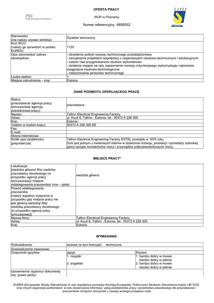 OFERTA PRACY WUP w Poznaniu Numer referencyjny: 4895052 Stanowisko: (nie należy używać skrótów) Kod ISCO: (należy go sprawdzić w portalu EURES) Opis stanowiska/ zakres obowiązków: Liczba etatów: Miejsce zatrudnienia – kraj: Dyrektor techniczny 1120 - określenie polityki rozwoju technicznego przedsiębiorstwa - zarządzanie projektami współpracy z organizacjami naukowo-technicznymi i edukacyjnymi - nadzór nad przygotowaniem studium wykonalności - działania mające na celu zapewnienie rozwoju inżynieryjnego wykorzystując najnowsze osiągnięcia naukowo-technologiczne - nadzorowanie personelu technicznego 1 Estonia DANE PODMIOTU OFERUJĄCEGO PRACĘ Status: (pracodawca/ agencja pracy tymczasowej/ agencja pośrednictwa pracy) Nazwa: Adres: Kraj: Telefon (z kodem kraju): Fax: E-mail: Strona internetowa: Krótki opis działalności gospodarczeji: pracodawca Tallinn Electrical Engineering Factory ul. Kuuli 6, Tallinn , Estonia, tel.: 00372 6 228 300 Estonia 00372 6 228 300 EE Tallinn Electrical Engineering Factory ESTEL powstało w 1870 roku. Dziś jest jednym z światowych liderów w dziedzinie rozwoju, produkcji i sprzedaży szerokiej gamy sprzętu konwertorów mocy i przyrządów półprzewodnikowych mocy. MIEJSCE PRACYii Lokalizacja: [siedziba główna/ filia/ siedziba pracodawcy docelowego (w przypadku agencji pracy tymczasowej)/ miejsce oddelegowania pracownika/ inne – jakie] Powód oddelegowania pracownika: [należy wypełnić wyłącznie w przypadku gdy miejsce pracy nie jest główną siedzibą/ filią/ siedzibą pracodawcy docelowego (w przypadku agencji pracy tymczasowej)] Nazwa firmy: Adres: Kraj: siedziba główna Tallinn Electrical Engineering Factory ul. Kuuli 6, Tallinn , Estonia, tel.: 00372 6 228 300 Estonia WYMAGANIA Wykształcenie: Doświadczenie zawodowe: Znajomość języków: wyższe (w tym licencjat) Język 1. rosyjski 2. angielski techniczne Poziom 1. bardzo dobry w mowie bardzo dobry w piśmie 2. bardzo dobry w mowie bardzo dobry w piśmie Uprawnienia/ dyplomy/ dokumenty (np. prawo jazdy): EURES (Europejskie Służby Zatrudnienia) to sieć współpracy pomiędzy Komisją Europejską, Publicznymi Służbami Zatrudnienia krajów UE/ EOG oraz innych organizacji partnerskich, w celu dostarczania informacji, usług pośrednictwa pracy i poradnictwa zawodowego dla pracodawców i pracowników chcących skorzystać z zasady wolnego przepływu osób Inne istotne wymagania: Doświadczenie zawodowe w zarządzaniu pracą inżynierów nie może być mniejsze niż 5 lat. Obsługa komputera: MS Office, AutoCad i Invertor Umiejętności społeczne, pracy w zespole, odporność na stres; Umiejętności podejmowania decyzji; Mobilność i gotowość do podróży służbowych; WYNAGRODZENIE I WARUNKI ZATRUDNIENIA Wysokość pensji brutto: Wysokość pensji netto: Waluta, w jakiej wypłacana jest pensja: Rodzaj stawki wynagrodzenia: (godzinowa/ tygodniowa/ miesięczna/ roczna/ inna) Premie: Dodatkowe świadczenia (zakwaterowanie, wyżywienie, koszty związane ze zmianą miejsca zamieszkania, koszty podróży itp.): Nazwa firmy, z którą zostanie podpisana umowa: Rodzaj umowy: (umowa o pracę, umowa zlecenia, wolontariat, praktyka zawodowa/ staż, praca zdalna, agencja pracy tymczasowej, inne): Wymiar czasu pracy (praca na pełen etat/ część etatu): Czas trwania umowy: (nieokreślony/ określony) 2.500,00 Liczba godzin tygodniowo: Zmiany i praca w dni wolne: Data rozpoczęcia: Inne informacje: 40,00 2015-10-01 Mobilność i gotowość do podróży służbowych; Euro Czasowy ze stawką miesięczną brak danych Brak danych Tallinn Electrical Engineering Factory umowa o pracę Umowa o pracę na pełny etat nieokreślony Data wygaśnięcia umowy (w przypadku umowy na czas określony): SPOSÓB SKŁADANIA WNIOSKU Wymagane dokumenty (list motywacyjny, CV itp.): Język, w którym muszą być sporządzone przedkładane dokumenty: Do kogo należy wysłać dokumenty: (do pracodawcy/ doradcy EURES) Gdzie należy wysłać dokumenty: (adres, adres e-mail, nr faksu z kodem kraju itp.) Dane teleadresowe doradcy EURES lub przedstawiciela pracodawcy: (nazwisko, adres, telefon, fax, e-mail itp.) CV + list motywacyjny angielski do doradcy EURES z WUP email [email protected] DODATKOWE INFORMACJE W tytule maila proszę wpisać numer referencyjny oferty EURES oraz kraj. Oferta ważna do 30.09.2015 WAŻNOŚĆ 2015-08-06 Data publikacji: Termin przedkładania podań o pracę / 2015-09-30 zakończenia ważności oferty: Uprzejmie informujemy, że skontaktujemy się wyłącznie z wybranymi kandydatami. UWAGA: 1. Umowa z zagranicznym pracodawcą jest zawierana, co do zasady, zgodnie z prawem kraju zatrudnienia. Oznacza to, że wszystkie roszczenia odnośnie warunków, które obejmuje umowa, można kierować wyłącznie do odpowiedniego sądu w kraju zatrudnienia. EURES (Europejskie Służby Zatrudnienia) to sieć współpracy pomiędzy Komisją Europejską, Publicznymi Służbami Zatrudnienia krajów UE/ EOG oraz innych organizacji partnerskich, w celu dostarczania informacji, usług pośrednictwa pracy i poradnictwa zawodowego dla pracodawców i pracowników chcących skorzystać z zasady wolnego przepływu osób Publiczne służby zatrudnienia (EURES) nie mogą pośredniczyć ani reprezentować pracownika w sądzie kraju zatrudnienia w przypadku sporu z pracodawcą. 2. Publiczne służby zatrudnienia (EURES) dokładają wszelkich starań, aby zapewnić rzetelność i wiarygodność ofert pracy zgłoszonych w lokalnym urzędzie pracy. Należy wyjaśnić, że oferta pracy została zgłoszona przez stronę trzecią i EURES nie odpowiada za ewentualne rozbieżności między warunkami pracy określonymi w ofercie pracy i warunkami oferowanymi przez potencjalnego pracodawcę. 3. Publiczne służby zatrudnienia (EURES) informują, że będą zbierać, przetwarzać i przekazywać potencjalnym pracodawcom zgodnie z przepisami dotyczącymi ochrony danych osobowych wszystkie dane osobowe dostarczone p