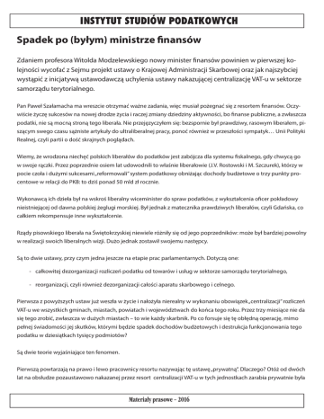 INSTYTUT STUDIÓW PODATKOWYCH Spadek po (byłym) ministrze finansów Zdaniem profesora Witolda Modzelewskiego nowy minister finansów powinien w pierwszej kolejności wycofać z Sejmu projekt ustawy o Krajowej Administracji Skarbowej oraz jak najszybciej wystąpić z inicjatywą ustawodawczą uchylenia ustawy nakazującej centralizację VAT-u w sektorze samorządu terytorialnego. Pan Paweł Szałamacha ma wreszcie otrzymać ważne zadania, więc musiał pożegnać się z resortem finansów. Oczywiście życzę sukcesów na nowej drodze życia i raczej zmiany dziedziny aktywności, bo finanse publiczne, a zwłaszcza podatki, nie są mocną stroną tego liberała. Nie przejęzyczyłem się: bezspornie był prawdziwy, rasowym liberałem, piszącym swego czasu sążniste artykuły do ultraliberalnej pracy, ponoć również w przeszłości sympatyk… Unii Polityki Realnej, czyli partii o dość skrajnych poglądach. Wiemy, że wrodzona niechęć polskich liberałów do podatków jest zabójcza dla systemu fiskalnego, gdy chwycą go w swoje rączki. Przez poprzednie osiem lat udowodnili to właśnie liberałowie (J.V. Rostowski i M. Szczurek), którzy w pocie czoła i dużymi sukcesami „reformowali” system podatkowy obniżając dochody budżetowe o trzy punkty procentowe w relacji do PKB: to dziś ponad 50 mld zł rocznie. Wykonawcą ich dzieła był na wskroś liberalny wiceminister do spraw podatków, z wykształcenia oficer pokładowy nieistniejącej od dawna polskiej żeglugi morskiej. Był jednak z matecznika prawdziwych liberałów, czyli Gdańska, co całkiem rekompensuje inne wykształcenie. Rządy pisowskiego liberała na Świętokrzyskiej niewiele różniły się od jego poprzedników: może był bardziej powolny w realizacji swoich liberalnych wizji. Dużo jednak zostawił swojemu następcy. Są to dwie ustawy, przy czym jedna jeszcze na etapie prac parlamentarnych. Dotyczą one: - całkowitej dezorganizacji rozliczeń podatku od towarów i usług w sektorze samorządu terytorialnego, - reorganizacji, czyli również dezorganizacji całości aparatu skarbowego i celnego. Pierwsza z powyższych ustaw już weszła w życie i nałożyła nierealny w wykonaniu obowiązek „centralizacji” rozliczeń VAT-u we wszystkich gminach, miastach, powiatach i województwach do końca tego roku. Przez trzy miesiące nie da się tego zrobić, zwłaszcza w dużych miastach – to wie każdy skarbnik. Po co forsuje się tę obłędną operację, mimo pełnej świadomości jej skutków, którymi będzie spadek dochodów budżetowych i destrukcja funkcjonowania tego podatku w dziesiątkach tysięcy podmiotów? Są dwie teorie wyjaśniające ten fenomen. Pierwszą powtarzają na prawo i lewo pracownicy resortu nazywając tę ustawę „prywatną”. Dlaczego? Otóż od dwóch lat na obsłudze pozaustawowo nakazanej przez resort centralizacji VAT-u w tych jednostkach zarabia prywatnie była Materia³y prasowe – 2016 INSTYTUT STUDIÓW PODATKOWYCH pracownica resortu finansów, zresztą często pisząca do jednej z papierowych gazet na ten temat. Razem z ministrem Szałamachą przyszedł do resortu specjalista od legislacji, który napisał ów powielający zresztą poglądy tejże damy, co do sposobu przeprowadzenia tej operacji, projekt ustawy. Przypadek? Być może. Warto również zauważyć, że projekt tej ustawy, nie był przewidziany w planie prac rządu, powstał bardzo szybko i to w dodatku w kilku wersjach, co na tle nieporadności legislacyjnej tego resortu jest ewenementem. O bezsensie uchwalania tej ustawy oczywiście wiedział były minister finansów, bo ręką swojego wiceministra odpowiadał mi jakieś dyrdymały na ten temat twierdząc, że „musimy” uchwalić tę ustawę. Widać „musimy”: jak mus, to mus. Druga teoria jest bardziej tajemnicza. Otóż po przymusowej centralizacji, którą każda jednostka samorządu terytorialnego zrobi źle, będzie można wyrzucić większość prezydentów miast, starostów i burmistrzów. To dobrze, bo większość to liberałowie i ludowcy z opozycyjnych partii. Druga część spadku ministra Szałamachy jest jeszcze bardziej oryginalna: w jego resorcie powstał projekt likwidujący cały istniejący aparat skarbowy i celny (ponad 60 tys. ludzi) i powołujący w to miejsce zupełnie inną strukturę pod nazwą „Krajowej Administracji Skarbowej”. Jest to bezprecedensowa operacja w historii tejże administracji, na którą nie odważył się jak dotąd (w historii!) żaden władca: nawet okupant niemiecki zachował przedwojenny aparat skarbowy w latach 1939-1944, podobnie jak władza Polski Ludowej. Można tylko pogratulować odwagi. Problem w tym, że ów projekt zjednoczył w sprzeciwie prawie wszystkich pracowników tego aparatu – od celników do skarbowców – protestują i nie ustąpią. Mają swoje racje, ale jak dotąd nikt nie słuchał ich argumentów. Będą walczyć do końca, co grozi całkowitą dezintegracją wewnętrzną tego aparatu i to na wiele lat. Te dwie ustawy mogą się stać miną podłożoną pod rządy nowego ministra, który będzie z oczywistych powodów mieć dużo mniej czasu na zajmowanie się sprawami resortu finansów. Co powinien zrobić? Przede wszystkim wycofać z Sejmu projekt ustawy o dezorganizacji aparatu skarbowego i celnego (KAS – Katastrofa Administracji Skarbowej) oraz jak najszybciej wystąpić z inicjatywą ustawodawczą uchylenia ustawy nakazującej centralizację VAT-u w sektorze samorządu terytorialnego. Póki nie jest za późno. Witold Modzelewski Profesor Uniwersytetu Warszawskiego Instytut Studiów Podatkowych http://ksiegowosc.infor.pl/wiadomosci/747059,Spadek-po-bylym-ministrze-finansow.html Materia³y prasowe – 2016