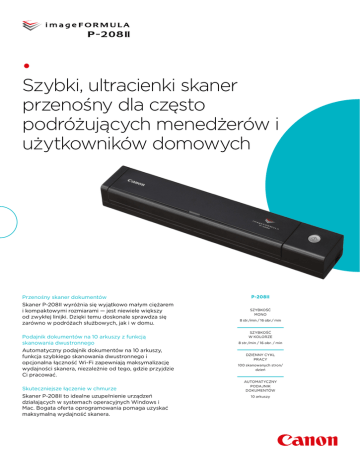 • Szybki, ultracienki skaner przenośny dla często podróżujących menedżerów i użytkowników domowych Przenośny skaner dokumentów Skaner P-208II wyróżnia się wyjątkowo małym ciężarem i kompaktowymi rozmiarami — jest niewiele większy od zwykłej linijki. Dzięki temu doskonale sprawdza się zarówno w podróżach służbowych, jak i w domu. Podajnik dokumentów na 10 arkuszy z funkcją skanowania dwustronnego Automatyczny podajnik dokumentów na 10 arkuszy, funkcja szybkiego skanowania dwustronnego i opcjonalna łączność Wi-Fi zapewniają maksymalizację wydajności skanera, niezależnie od tego, gdzie przyjdzie Ci pracować. Skuteczniejsze łączenie w chmurze Skaner P-208II to idealne uzupełnienie urządzeń działających w systemach operacyjnych Windows i Mac. Bogata oferta oprogramowania pomaga uzyskać maksymalną wydajność skanera. P-208II SZYBKOŚĆ MONO 8 str./min / 16 obr./ min SZYBKOŚĆ W KOLORZE 8 str./min / 16 obr. / min DZIENNY CYKL PRACY 100 skanowanych stron/ dzień AUTOMATYCZNY PODAJNIK DOKUMENTÓW 10 arkuszy WYJĄTKOWO CIENKI I LEKKI Szybkie skanowanie w podróży Skanowanie wszystkich typów dokumentów Skaner imageFORMULA P-208II umożliwia często podróżującym menedżerom i użytkownikom biurowym niezwykle szybkie dwustronne skanowanie w kolorze z prędkością nawet 16 obrazów na minutę przy rozdzielczości 200 dpi. Dzięki wbudowanemu automatycznemu podajnikowi dokumentów na 10 arkuszy, który ułatwia skanowanie seryjne w jednej operacji wielostronicowych dokumentów, na przykład umów, utrzymasz wysoką wydajność pracy, nawet podczas podróży. Skaner P-208II waży zaledwie 600 g i jest niewiele dłuższy i szerszy od zwykłej linijki, a zatem bez problemu można go wszędzie zabrać ze sobą. Jest wyjątkowo uniwersalny, ponieważ współpracuje z komputerami Mac i PC, jak również z urządzeniami przenośnymi z systemem operacyjnym Apple iOS i Android.* Ze względu na możliwość skanowania szerokiego zakresu nośników skaner P-208II idealnie sprawdza się zarówno w domu, jak i firmie. Użytkownicy biznesowi mogą rejestrować standardowe dokumenty A4, takie jak umowy, a także nośniki w formatach niestandardowych, na przykład wizytówki i karty tłoczone, co jest szczególnie przydatne podczas podróży. Urządzenie P-208II przyda się również w domu, ponieważ doskonale nadaje się do skanowania rachunków, a tryb obrazu umożliwia niezwykłe precyzyjne skanowanie starych zdjęć. * Po podłączeniu do modułu WU10. Intuicyjne przetwarzanie obrazu Bogaty wybór wbudowanych funkcji do przetwarzania obrazu pomaga uzyskać wyniki o wysokiej jakości. Skaner P-208II jest wyposażony w funkcje automatycznego wykrywania koloru, rozpoznawania kierunku i poprawy czytelności tekstu, co podnosi jakość skanowanych obrazów, a tryb automatyczny pozwala na automatyczne zastosowanie idealnych ustawień dokumentów, gwarantując bardzo szybkie wyniki. Możliwość podłączenia i skanowania dzięki aplikacji CaptureOnTouch Lite Po wybraniu funkcji „auto-start” wystarczy podłączyć urządzenie za pomocą kabla USB i od razu można zacząć skanowanie! Oprogramowanie CaptureOnTouch Lite jest wbudowane w skaner P-208II, więc nie ma potrzeby pobierania z Internetu dodatkowych sterowników ani oprogramowania. Wystarczy podłączyć urządzenie i można rozpocząć skanowanie. FUNKCJONALNE, INTUICYJNE OPROGRAMOWANIE ZWIĘKSZAJĄCE WYDAJNOŚĆ Intuicyjne oprogramowanie, dzięki któremu szybko i łatwo uzyskasz doskonałe rezultaty. W programie CaptureOnTouch dostępny jest interfejs z ikonami oraz możliwość zapisywania skanowanych dokumentów w różnych formatach, takich jak PDF, PDF-A, TIFF, JPEG, BMP, PPTX czy PNG. Za pomocą programu CaptureOnTouch można również przesyłać skanowane dokumenty bezpośrednio do systemów zarządzania danymi (zgodność zarówno z systemem Windows, jak i Mac). Wyjątkowa mobilność i wygoda w podróży. Oprogramowanie jest wbudowane w urządzenie P-208II, dzięki czemu można je podłączyć bez instalacji jakichkolwiek sterowników czy aplikacji (zgodność zarówno z systemem Windows, jak i Mac).). Oprogramowanie do skanowania wizytówek, umożliwiające konwertowanie i porządkowanie ważnych informacji w bazie danych, którą można przeszukiwać (zgodne zarówno z systemem Windows, jak i Mac). Wtyczki do usług w chmurze Oprogramowanie CaptureOnTouch oraz CaptureOnTouch Lite zawiera wtyczki umożliwiające podłączenie do usług w chmurze i usług ECM, takich jak Evernote, Google Drive™, Microsoft SharePoint®, SugarSync, OneDrive (wyłącznie w systemie Windows) i Dropbox. • Dane techniczne — imageFORMULA P-208II Typ Nabiurkowy skaner dokumentów WYNIK SKANOWANIA Czujnik odczytu dokumentów Dwuwierszowy czujnik CMOS CIS Rozdzielczość Rozdzielczość optyczna 600 dpi 150 dpi × 150 dpi, 200 dpi × 200 dpi, 300 dpi × 300 dpi, 400 dpi × 400 dpi, 600 dpi × 600 dpi Źródło światła RGB LED Tryb Strona skanowania Przód / Tył / Dwustronny Monochromatyczny, zaawansowana poprawa czytelności tekstu II, 8-bitowa (256-poziomowa) skala szarości, 24-bitowy kolor Interfejs USB 2.0 (High Speed) FUNKCJE SPECJALNE Automatyczne wykrywanie rozmiaru strony, korekta przekosu (prostowanie), trójwymiarowa korekcja kolorów, automatyczne wykrywanie kolorów, korekcja cieni, poprawa czytelności tekstu, ustawienia krzywej gamma, panel skanowania, skanowanie wstępne, obracanie obrazu, pomijanie pustych stron, wybór stron do skanowania, ustawianie obszaru skanowania, rozpoznawanie kierunku tekstu, skanowanie ciągłe, wyostrzanie krawędzi, redukcja mory, zapobieganie prześwitywaniu/ usuwanie tła, dostosowywanie kontrastu, wygładzanie tła, przycinanie cieni (możliwość włączenia/wyłączenia), przycinanie, stosowanie korekcji odpowiednich do zdjęć, wykrywanie podwójnych stron (wg długości) Wymiary Taca zamknięta: 312,5 (szer.) mm × 56,5 (gł.) mm × 40 (wys.) mm Taca otw
