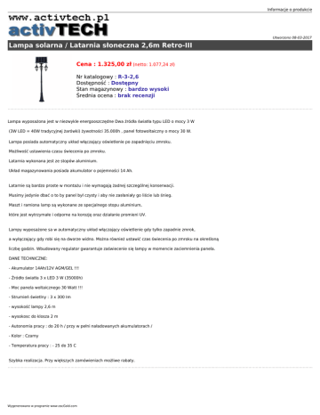 Informacje o produkcie Utworzono 08-03-2017 Lampa solarna / Latarnia słoneczna 2,6m Retro-III Cena : 1.325,00 zł (netto: 1.077,24 zł) Nr katalogowy : R-3-2,6 Dostępność : Dostępny Stan magazynowy : bardzo wysoki Średnia ocena : brak recenzji Lampa wyposażona jest w niezwykle energooszczędne Dwa źródła światła typu LED o mocy 3 W (3W LED = 40W tradycyjnej żarówki) żywotności 35.000h , panel fotowoltaiczny o mocy 30 W. Lampa posiada automatyczny układ włączający oświetlenie po zapadnięciu zmroku. Możliwość ustawienia czasu świecenia po zmroku. Latarnia wykonana jest ze stopów aluminium. Układ magazynowania posiada akumulator o pojemności 14 Ah. Latarnie są bardzo proste w montażu i nie wymagają żadnej szczególnej konserwacji. Musimy jedynie dbać o to by panel był czysty i aby nie zasłaniały go liście lub śnieg. Maszt i ramiona lamp są wykonane ze specjalnego stopu aluminium, które jest wytrzymałe i odporne na korozję oraz działanie promieni UV. Lampy wyposażone sa w automatyczny układ włączający oświetlenie gdy tylko zapadnie zmrok, a wyłączający gdy robi się na dworze widno. Można również ustawić czas świecenia po zmroku na określoną liczbę godzin. Wbudowany regulator gwarantuje zaświecenie się lampy w momencie zaciemnienia panela. DANE TECHNICZNE: - Akumulator 14Ah/12V AGM/GEL !!! - Źródło światła 3 x LED 3 W (35000h) - Moc panela woltaicznego 30 Watt !!! - Strumień świetlny : 3 x 300 Im - wysokość lampy 2,6 m - wysokosc do klosza 2 m - Autonomia pracy : do 20 h / przy w pełni naładowanych akumulatorach / - Kolor : Czarny - Temperatura pracy : - 25 do 35 C Szybka realizacja. Przy większych zamówieniach możliwe rabaty. Wygenerowano w programie www.oscGold.com