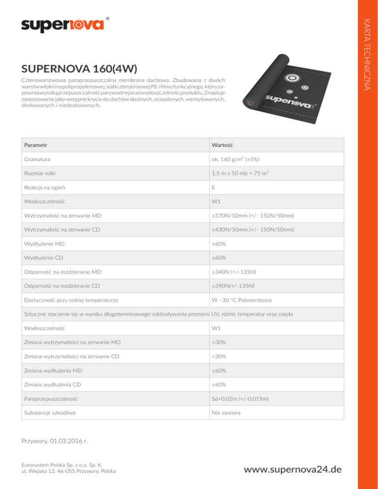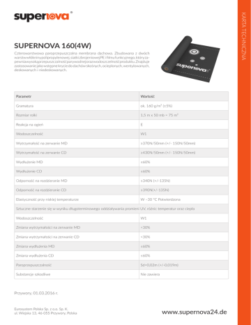 KARTA TECHNICZNA SUPERNOVA 160(4W) Czterowarstwowa paroprzepuszczalna membrana dachowa. Zbudowana z dwóch warstw włókniny polipropylenowej, siatki zbrojeniowej PE i filmu funkcyjnego, który zapewnia wysoką przepuszczalność parywodnej oraz wodoszczelność produktu. Znajduje zastosowanie jako wstępne krycie do dachów skośnych, ocieplonych, wentylowanych, deskowanych i niedeskowanych. Parametr Wartość Gramatura ok. 160 g/m² (±5%) Rozmiar rolki 1,5 m x 50 mb = 75 m² Reakcja na ogień E Wodoszczelność W1 Wytrzymałość na zerwanie MD ≥370N/50mm (+/- 150N/50mm) Wytrzymałość na zerwanie CD ≥430N/50mm (+/- 150N/50mm) Wydłużenie MD ≤60% Wydłużenie CD ≤60% Odporność na rozdzieranie MD ≥340N (+/-135N) Odporność na rozdzieranie CD ≥390N(+/-135N) Elastyczność przy niskiej temperaturze W –30 ºC Potwierdzona Sztuczne starzenie się w wyniku długoterminowego oddziaływania promieni UV, różnic temperatur oraz ciepła Wodoszczelność W1 Zmiana wytrzymałości na zerwanie MD <30% Zmiana wytrzymałości na zerwanie CD <30% Zmiana wydłużenia MD ≤60% Zmiana wydłużenia CD ≤60% Paroprzepuszczalność Sd=0,02m (+/-0,019m) Substancje szkodliwe Nie zawiera Przywory, 01.03.2016 r. Eurosystem Polska Sp. z o.o. Sp. K. ul. Wiejska 13, 46-055 Przywory, Polska www.supernova24.de
