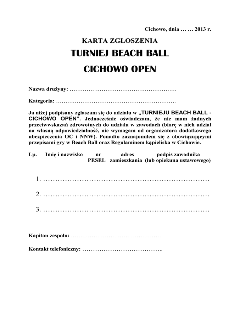 Cichowo, dnia … … 2013 r. KARTA ZGŁOSZENIA TURNIEJ BEACH BALL CICHOWO OPEN Nazwa drużyny: ………………………………………………… Kategoria: ………………………………………………………. Ja niżej podpisany zgłaszam się do udziału w „TURNIEJU BEACH BALL CICHOWO OPEN”. Jednocześnie oświadczam, że nie mam żadnych przeciwwskazań zdrowotnych do udziału w zawodach (biorę w nich udział na własną odpowiedzialność, nie wymagam od organizatora dodatkowego ubezpieczenia OC i NNW). Ponadto zaznajomiłem się z obowiązującymi przepisami gry w Beach Ball oraz Regulaminem kąpieliska w Cichowie. Lp. Imię i nazwisko nr adres podpis zawodnika PESEL zamieszkania (lub opiekuna ustawowego) 1. …………………………………………………………… 2. …………………………………………………………… 3. …………………………………………………………… Kapitan zespołu: ………………………………………… Kontakt telefoniczny: ………………………………..