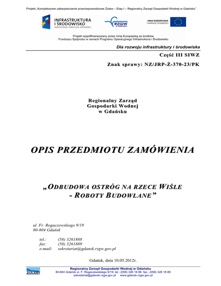 Projekt „Kompleksowe zabezpieczenie przeciwpowodziowe Żuław – Etap I – Regionalny Zarząd Gospodarki Wodnej w Gdańsku” Dla rozwoju infrastruktury i środowiska C Czzęęśśćć IIIIII SSIIW WZ Z Z Znnaakk sspprraaw wyy:: N NZ Z//JJR RPP--Ż Ż--337700--2233//PPK K R Reeggiioonnaallnnyy Z Zaarrzząądd G Goossppooddaarrkkii W Wooddnneejj w wG Gddaańńsskkuu OPIS PRZEDMIOTU ZAMÓWIENIA „ O DDBBUUDDOOW WA AO OSST TR RÓ ÓG GN NA AR RZ ZE EC CE E W IIŚŚL LE E - R OOBBOOTTYY B UUDDOOW WL LA AN NE E” ul. Fr. Rogaczewskiego 9/19 80-804 Gdańsk tel.: fax: e-mail: (58) 3261888 (58) 3261889 [email protected] Gdańsk, dnia 10.05.2012r. Regionalny Zarząd Gospodarki Wodnej w Gdańsku 80-804 Gdańsk ul. F. Rogaczewskiego 9/19; tel.: (058) 326 18 88 fax.: (058) 326 18 89 [email protected] www.gdansk.rzgw.gov.pl OPIS PRZEDMIOTU ZAMÓWIENIA SIWZ CZ. III „Odbudowa ostróg na rzece Wiśle – roboty budowlane.” SPIS TREŚCI 1. Informacje ogólne .............................................................................................................3 1.1 Opis ...................................................................................................................................3 1.2 Przedmiot zamówienia......................................................................................................3 2. Lokalizacja ........................................................................................................................4 3. Zakres robót budowlanych................................................................................................7 3.1 Opis istniejących ostróg ....................................................................................................7 3.2 Opis zakresu robót ............................................................................................................7 3.3 Ogólny opis technologii robót...........................................................................................8 3.4 Promocja projektu .............................................................................................................8 4. Termin wykonania zamówienia ........................................................................................9 5. Pozostałe uwarunkowania.................................................................................................9 6. Wykaz załączników ........................................................................................................11 Regionalny Zarząd Gospodarki Wodnej w Gdańsku 80-804 Gdańsk ul. F. Rogaczewskiego 9/19; tel.: (058) 326 18 88 fax.: (058) 326 18 89 [email protected] www.gdansk.rzgw.gov.pl 2 OPIS PRZEDMIOTU ZAMÓWIENIA SIWZ CZ. III „Odbudowa ostróg na rzece Wiśle – roboty budowlane.” 1. Informacje ogólne 1.1 Opis Zadanie „Odbudowa ostróg na rzece Wiśle” wchodzi w skład Projektu „Kompleksowe zabezpieczenie przeciwpowodziowe Żuław – Etap I – Regionalny Zarząd Gospodarki Wodnej w Gdańsku”, realizowanego w ramach działania 3.1 Retencjonowanie wody i zapewnienie bezpieczeństwa przeciwpowodziowego priorytetu III Zarządzenie zasobami i przeciwdziałanie zagrożeniem środowiska – Programu Operacyjnego Infrastruktura i Środowisko 2007-2013. W dniu 16.12.2011r. została podpisana umowa o dofinansowanie w/w Projektu (umowa nr 03.01.00-00-008/11-00). Projekt jest jednym z zadań I etapu Programu „Kompleksowe zabezpieczenie przeciwpowodziowe Żuław - do roku 2030 (z uwzględnieniem etapu 2015)” (zwany „Programem Żuławskim – 2030”). Dla niniejszego Programu została przeprowadzona ocena strategiczna, a w maju 2010 r. został on zatwierdzony przez Ministra Środowiska (tekst „Programu Żuławskiego – 2030” wraz z Prognozą są dostępne na stronach internetowych www.gdansk.rzgw.gov.pl). 1.2 Przedmiot zamówienia Przedmiotem niniejszego zamówienia jest wykonanie robót budowlanych polegających na odbudowie 10 szt. (w tym 9 szt. w gm. Subkowy i 1 szt. w m. Tczew) ostróg na rzece Wiśle. Zakres robót obejmuje: a) Odbudowę zniszczonych ostróg na rzece Wiśle. b) Umocnienie skarp rzeki Wisły poniżej i powyżej odbudowywanych ostróg. c) Wycinkę drzew i krzewów. Szczegółowy zakres robót został opisany w dokumentacjach projektowych stanowiących załączniki do cz. III SIWZ. Z uwagi na lokalizację przedsięwzięcia w dwóch różnych gminach dla przedmiotowej inwestycji wykonano dwie różne dokumentacje techniczne (dla gminy Subkowy i dla miasta Tczew) oraz uzyskano dwa odrębne pozwolenia na budowę oraz inne decyzje administracyjne. Mimo podziału administracyjnego zadania traktowane jest ono jako jedną całość. Dokumentacja projektowa przygotowywana była przez dwa różne biura projektów, osobno dla ostróg zlokalizowanych w poszczególnych gminach, tj.: • dla ostróg w gminie Subkowy dokumentację wykonało „Biuro Projektów i Doradztwa Technicznego Hydroprojekt w Gdańsku Sp. z o.o.” – według tego projektu będzie wykonanych 9szt. ostróg, Regionalny Zarząd Gospodarki Wodnej w Gdańsku 80-804 Gdańsk ul. F. Rogaczewskiego 9/19; tel.: (058) 326 18 88 fax.: (058) 326 18 89 [email protected] www.gdansk.rzgw.gov.pl 3 OPIS PRZEDMIOTU ZAMÓWIENIA SIWZ CZ. III „Odbudowa ostróg na rzece Wiśle – roboty budowlane.” • dla ostrogi w Mieście Tczew dokumentację wykonało biuro projektów „Sogreah Polska” Sp. z o.o. – według tego projektu będzie wykonana jedna ostroga. W związku z powyższym rozwiązania konstrukcyjne (projektowe) nie są takie same dla wszystkich 10 ostróg. 2. Lokalizacja Planowane przedsięwzięcie zlokalizowane jest na północy Polski w województwie pomorskim, w korycie rzeki Wisły, na obszarze miasta Tczew i gminy Subkowy. Ostrogi przeznaczone do odbudowy znajdujące się w km 912+000÷983+000 rzeki Wisły, a ich lokalizację przedstawiono także na mapkach poniżej: Brzeg lewy o Gmina miasta Tczew: − nr 13/911 zlokalizowana w km 91