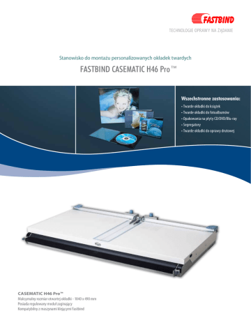 technologie oprawy na żądanie Stanowisko do montażu personalizowanych okładek twardych Fastbind Casematic H46 Pro™ Wszechstronne zastosowania: • Twarde okładki do książek • Twarde okładki do fotoalbumów • Opakowania na płyty CD/DVD/Blu-ray • Segregatory • Twarde okładki do oprawy drutowej Casematic H46 Pro™ Maksymalny rozmiar otwartej okładki - 1040 x 490 mm Posiada regulowany moduł zaginający Kompatybilny z maszynami klejącymi Fastbind Fastbind Casematic H46 Pro™ Stwórz profesjonalne personalizowane twarde okładki i opakowania Dzięki zaawansowanemu Fastbind Casematic H46 Pro™, możesz produkować w ciągu kilku minut ekskluzywne twarde okładki o max. rozmiarze 1040x490 mm. To proste - zaprojektuj okładkę według własnego pomysłu, wykonaj wydruk (cyfrowy lub atramentowy) na papierze samoprzylepnym, a następnie użyj Twojego Casematic H46 Pro, aby wykonać okładkę lub opakowanie. Zastosowania okładek są nieograniczone: na książki, fotoksiążki i fotoalbumy, do opakowań na płyty CD, DVD, Blue-ray, do segregatorów oraz wielu innych. To idealne rozwiązanie dla studiów fotograficznych, pracowni fotograficznych, profesjonalnych fotografów, drukarni cyfrowych, punktów ksero oraz wydawnictw “na żądanie”. To kompaktowe urządzenie, mimo swojej wielofunkcyjności stanowi w pełni stołową jednostkę, która doskonale wkomponuje się w dowolną przestrzeń roboczą. Gwarancja najwyższej jakości produkcji Znaczniki dla grubszych i cieńszych tekturowych materiałów montażowych zapewniają wszechstronność zastosowań. Fastbind Casematic H46 Pro™ jest bardzo prosty w użyciu. Wystarczy umieścić zadrukowaną okleinę na podświetlanym stole roboczym; sekcja zasysająca powietrze, znaczniki oraz linia centrująca gwarantują precyzyjne wykonanie okładki. Po rozmieszczeniu tekturek montażowych, w niezwykle łatwy sposób zagina się brzegi okleiny za pomocą modułu zaginającego, który posiada możliwość regulacji do grubości aktualnie używanego materiału tekturowego. Akcesoria opcjonalne Casematic H46 Pro można wyposażyć w akcesoria opcjonalne, znacznie ułatwiające pracę. Gilotyna do naroży Fastbind Ha10™ umożliwia obcinanie czterech rogów okleiny w sposób precyzyjny oraz jednakowy. Zderzaki magnetyczne Fastbind ułatwiają pozycjonowanie nieprzezroczystych materiałów samoprzylepnych używanych jako okleina okładek przy realizacji zleceń na krótkie i średnie serie produkcyjne. Fastbind zapewnia także wszystkie niezbędne materiały eksploatacyjne do produkcji okładek: papier samoprzylepny do zadruku, tekturki montażowe oraz kartony montażowe. Szybko wymienialne spacjatory magnetyczne umożliwiają łatwiejszą niż dotychczas regulację odległości między kartonami okładki a paskiem grzbietowym. Dane techniczne Maksymalny obszar zadruku (szer. x dł.) 1080 x 530 mm Max. rozmiar otwartej okładki (szer. x dł.) 1040 x 490 mm Max. długość zaginania 1040 mm Grubość tekturek montażowych do 5 mm Napięcie (V) / Częstotliwość (Hz) 220 –240V / 50 – 60Hz Max. natężenie prądu 1A Wymiary maszyny (szer. x dł .x wys.) 1130 x 684 x 200 mm Waga netto 45 kg Certyfikaty CE System Fastbind Casematic™ jest opatentowany. W zestawie znajdują się: prowadnice grzbietu 3 mm ze spacjatorami 8 mm oraz regulowany moduł zaginający brzegi okleiny. Zintegrowany moduł zaginania brzegów okleiny posiada możliwość regulacji stosownie do grubości użytej tekturki montażowej okładki. Kompatybilny z maszynami Fastbind™ Fastbind BooXTer Duo™ można używać wraz z Fastbind Casematic H46 Pro™, aby tworzyć najwyższej jakości personalizowane okładki twarde, materiały prezentacyjne oraz fotoksiążki. Dzięki perfekcyjnej maszynie klejącej Fastbind Elite XT™ każdy może oprawiać najwyższej jakości książki oraz raporty o max. formacie SRA3 lub A4 w poziomie. Dzięki urzadzeniu Fastbind FotoMount F46e™ możesz teraz tworzyć samodzielnie piękne oraz profesjonalne fotoalbumy. Gotowa oprawa otwiera się całkowicie na płasko - pod kątem 180 stopni. Informacje o produkcie aktualne na miesiąc kwiecień 2009 – mogą ulec zmianie bez uprzedniego powiadomienia. Przedstawiciel w Polsce: TOMACO-INTRO 97-500 Radomsko, ul. Krasickiego 108 Tel: 044 6821600 • Fax: 044 6821019 [email protected] • www.fastbindpolska.pl Producent: Maping Co Kuusiniemi 10, 02710 Espoo, FINLAND Tel: +358 9 562 6022 • Fax: +358 9 562 6215 [email protected] • www.fastbind.com