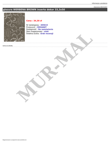 Informacje o produkcie Utworzono 08-03-2017 glazura WERBENA BROWN inserto dekor 33,3x50 Cena : 34,30 zł AL Nr katalogowy : 405615 Producent : CERSANIT Dostępność : Na zamówienie Stan magazynowy : niski Średnia ocena : brak recenzji M U R -M cena za sztukę Wygenerowano w programie www.oscGold.com