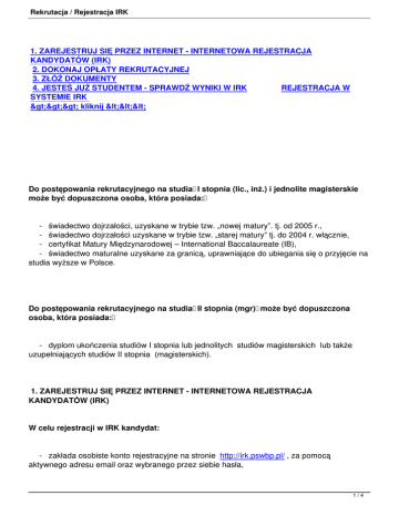 Rekrutacja / Rejestracja IRK 1. ZAREJESTRUJ SIĘ PRZEZ INTERNET - INTERNETOWA REJESTRACJA KANDYDATÓW (IRK) 2. DOKONAJ OPŁATY REKRUTACYJNEJ 3. ZŁÓŻ DOKUMENTY 4. JESTEŚ JUŻ STUDENTEM - SPRAWDŹ WYNIKI W IRK REJESTRACJA W SYSTEMIE IRK >>> kliknij <<< Do postępowania rekrutacyjnego na studia I stopnia (lic., inż.) i jednolite magisterskie może być dopuszczona osoba, która posiada: - świadectwo dojrzałości, uzyskane w trybie tzw. „nowej matury”. tj. od 2005 r., - świadectwo dojrzałości uzyskane w trybie tzw. „starej matury” tj. do 2004 r. włącznie, - certyfikat Matury Międzynarodowej – International Baccalaureate (IB), - świadectwo maturalne uzyskane za granicą, uprawniające do ubiegania się o przyjęcie na studia wyższe w Polsce. Do postępowania rekrutacyjnego na studia II stopnia (mgr) może być dopuszczona osoba, która posiada: - dyplom ukończenia studiów I stopnia lub jednolitych studiów magisterskich lub także uzupełniających studiów II stopnia (magisterskich). 1. ZAREJESTRUJ SIĘ PRZEZ INTERNET - INTERNETOWA REJESTRACJA KANDYDATÓW (IRK) W celu rejestracji w IRK kandydat: - zakłada osobiste konto rejestracyjne na stronie http://irk.pswbp.pl/ , za pomocą aktywnego adresu email oraz wybranego przez siebie hasła, 1/4 Rekrutacja / Rejestracja IRK - wypełnia i zatwierdza formularz danych osobowych, w tym podaje dane o dokumencie uprawniającym go do podjęcia studiów (np. świadectwie dojrzałości, dyplomie ukończenia studiów), - podaje wymagane przedmioty zdawane na maturze, ich poziomy oraz wyniki egzaminów, - dokonuje wyboru kierunku studiów, - wnosi opłatę rekrutacyjną na indywidualne subkonto bankowe wygenerowane w systemie IRK, odrębnie na każdy kierunek studiów. UWAGA! Rejestrację internetową uznaje się za wiążącą po wprowadzeniu przez kandydata wszystkich niezbędnych danych (wyborze kierunku studiów) oraz wniesieniu opłaty rekrutacyjnej za wybrany kierunek studiów, oraz uzyskaniu przez PSW potwierdzenia bankowego o wpływie tej opłaty na subkonto bankowe przypisane do wybranego kierunku studiów. Osobiste konto rejestracyjne kandydata w systemie Internetowej Rejestracji Kandydatów służy do: - wpisywania i potwierdzenia przez kandydata jego danych osobowych, - wyboru kierunku oraz trybu studiów, - przekazywania kandydatowi przez Wydziałową Komisję Rekrutacyjną informacji dotyczących: wyników poszczególnych etapów postępowania rekrutacyjnego, zmiany pozycji kandydata na liście rankingowej, terminu i miejsca składania dokumentów, itp. UWAGA! Osobiste konto rejestracyjne jest jedynym źródłem przekazywania kandydatowi informacji. Oznacza to, że wiadomości umieszczone na osobistym koncie kandydata uznaje się za dostarczone i wiążące. 2. DOKONAJ OPŁATY REKRUTACYJNEJ - opłata rekrutacyjna na każdy wybrany kierunek studiów I i II stopnia wynosi 80 zł, - opłata rekrutacyjna na każdy wybrany kierunek studiów podyplomowych wynosi 100 zł, - opłata za elektroniczną legitymację studencką wynosi 17 zł i można ją wnieść po zakończeniu postępowania rekrutacyjnego, - kandydat wnosi opłatę rekrutacyjną niezwłocznie po wybraniu kierunku studiów, - opłatę należy wnieść na indywidualny numer subkonta kandydata, wygenerowany przez system IRK, odrębnie dla każdego wybranego kierunku studiów, - wniesienie opłaty rekrutacyjnej jest warunkiem wydrukowania podania o przyjęcie na studia, - w przypadku wniesienia opłaty rekrutacyjnej na niepoprawne subkonto (subkonto innego 2/4 Rekrutacja / Rejestracja IRK kandydata) należy ponownie uiścić opłatę, tym razem na odpowiedni numer konta, oraz złożyć do Dziekanatu Wydziału lub do Kancelarii Uczelni podanie o zwrot opłaty rekrutacyjnej . 3. ZŁÓŻ DOKUMENTY Kandydat, w celu przyjęcia na studia składa, zgodnie z terminarzem rekrutacji, komplet dokumentów zamieszczonych w wykazie dostępnym w zakładce Wymagane dokumenty . 4. JESTEŚ JUŻ STUDENTEM - SPRAWDŹ WYNIKI W IRK - na podstawie wyników wszystkich kandydatów tworzy się w malejącej kolejności uzyskanej liczby punktów jedną listę rankingową, która określa kolejność przyjmowania kandydatów na studia w ramach limitu miejsc ustalonego dla danego kierunku/specjalności, - kandydat otrzymuje informacje o wyniku postępowania kwalifikacyjnego (w tym o statusie „zakwalifikowany” lub „niezakwalifikowany”) na swoje osobiste konto rejestracyjne w systemie IRK, - osoby, które uzyskały taką samą liczbę punktów, co kandydat zajmujący ostatnie miejsce w ramach ustalonego limitu miejsc będą zakwalifikowane, - osoby, które nie zostały zakwalifikowane z powodu wyczerpania się limitu miejsc stanowią tzw. grupę rezerwową. W przypadku zwalniania się miejsc, osoby te zostaną przyjęte na studia z zachowaniem kolejności wynikającej z liczby uzyskanych punktów. UWAGA! DECYZJA O PRZYJĘCIU NA STUDIA będzie podjęta przez Wydziałową Komisję Rekrutacyjną, po dostarczeniu przez kandydata posiadającego status „zakwalifikowany” wymaganych dokumentów w wyznaczonym terminie, wynikającym z terminarza rekrutacyjnego. - Mogą Cię zainteresować: ZASADY REKRUTACJI WYMAGANE DOKUMENTY OPŁATY TERMINARZ 3/4 Rekrutacja / Rejestracja IRK *kierunek zostanie uruchomiony po zatwierdzeniu przez MNiSW 4/4