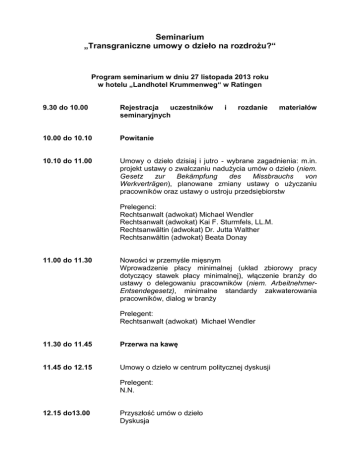 Seminarium „Transgraniczne umowy o dzieło na rozdrożu?“ Program seminarium w dniu 27 listopada 2013 roku w hotelu „Landhotel Krummenweg“ w Ratingen 9.30 do 10.00 Rejestracja uczestników seminaryjnych i rozdanie materiałów 10.00 do 10.10 Powitanie 10.10 do 11.00 Umowy o dzieło dzisiaj i jutro - wybrane zagadnienia: m.in. projekt ustawy o zwalczaniu nadużycia umów o dzieło (niem. Gesetz zur Bekämpfung des Missbrauchs von Werkverträgen), planowane zmiany ustawy o użyczaniu pracowników oraz ustawy o ustroju przedsiębiorstw Prelegenci: Rechtsanwalt (adwokat) Michael Wendler Rechtsanwalt (adwokat) Kai F. Sturmfels, LL.M. Rechtsanwältin (adwokat) Dr. Jutta Walther Rechtsanwältin (adwokat) Beata Donay 11.00 do 11.30 Nowości w przemyśle mięsnym Wprowadzenie płacy minimalnej (układ zbiorowy pracy dotyczący stawek płacy minimalnej), włączenie branży do ustawy o delegowaniu pracowników (niem. ArbeitnehmerEntsendegesetz), minimalne standardy zakwaterowania pracowników, dialog w branży Prelegent: Rechtsanwalt (adwokat) Michael Wendler 11.30 do 11.45 Przerwa na kawę 11.45 do 12.15 Umowy o dzieło w centrum politycznej dyskusji Prelegent: N.N. 12.15 do13.00 Przyszłość umów o dzieło Dyskusja Moderacja: Rechtsanwalt (adwokat) Michael Wendler 13.00 do 14.00 Przerwa na obiad 14.00 do16.00 Nowości w dziedzinie prawa podatkowego Ustawa o implementacji dyrektywy o pomocy prawnej świadczonej przez organy administracji (niem. Amtshilferichtlinienumsetzungsgesetz) Nowe prawo o kosztach podróży 2013/14 Prelegenci: Steuerberater (radca podatkowy), Dipl.-Kaufm. Helmut Latz Steuerberater (radca podatkowy), Wirtschaftsprüfer (rewident gospodarczy), Dipl.-Betriebsw. Uwe Piller Steuerberater (radca podatkowy), Dipl.-Betriebsw. Torsten Trenner 16.00 do 16.15 Przerwa na kawę 16.15 do 16.45 Aktualne kwestie ubezpieczeniowe Poręczenie jako środek zabezpieczenia Prelegent: Dipl.-Kaufm. Detlef Milkereit 16.45 do 18.00 Najnowsze zmiany oraz orzecznictwo dotyczące prawa umów o dzieło, prawa pracy oraz prawa gospodarczokarnego Użyczanie pracowników w praktyce Znormalizowane zasady zlecania i wykonawstwa robót bodowlanych / ogólne warunki umów na realizację usług budowlanych VOB/B Kasa urlopowa „Soka-Bau“ Prelegenci: Rechtsanwalt (adwokat) Michael Wendler Rechtsanwalt (adwokat) Kai F. Sturmfels, LL.M. Rechtsanwältin (adwokat) Dr. Jutta Walther Rechtsanwältin (adwokat) Beata Donay 18.00 Zakończenie seminarium