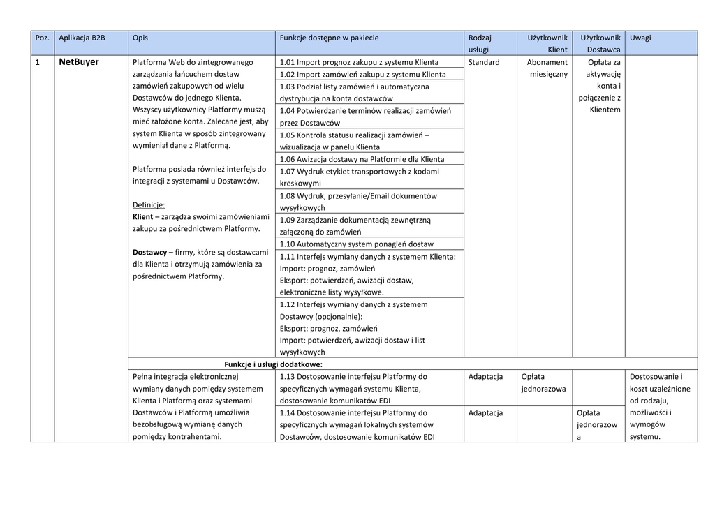 Poz. Aplikacja B2B Opis 1 NetBuyer Platforma Web do zintegrowanego zarządzania łańcuchem dostaw zamówień zakupowych od wielu Dostawców do jednego Klienta. Wszyscy użytkownicy Platformy muszą mieć założone konta. Zalecane jest, aby system Klienta w sposób zintegrowany wymieniał dane z Platformą. Funkcje dostępne w pakiecie 1.01 Import prognoz zakupu z systemu Klienta 1.02 Import zamówień zakupu z systemu Klienta 1.03 Podział listy zamówień i automatyczna dystrybucja na konta dostawców 1.04 Potwierdzanie terminów realizacji zamówień przez Dostawców 1.05 Kontrola statusu realizacji zamówień – wizualizacja w panelu Klienta 1.06 Awizacja dostawy na Platformie dla Klienta Platforma posiada również interfejs do 1.07 Wydruk etykiet transportowych z kodami integracji z systemami u Dostawców. kreskowymi 1.08 Wydruk, przesyłanie/Email dokumentów Definicje: wysyłkowych Klient – zarządza swoimi zamówieniami 1.09 Zarządzanie dokumentacją zewnętrzną zakupu za pośrednictwem Platformy. załączoną do zamówień 1.10 Automatyczny system ponagleń dostaw Dostawcy – firmy, które są dostawcami 1.11 Interfejs wymiany danych z systemem Klienta: dla Klienta i otrzymują zamówienia za Import: prognoz, zamówień pośrednictwem Platformy. Eksport: potwierdzeń, awizacji dostaw, elektroniczne listy wysyłkowe. 1.12 Interfejs wymiany danych z systemem Dostawcy (opcjonalnie): Eksport: prognoz, zamówień Import: potwierdzeń, awizacji dostaw i list wysyłkowych Funkcje i usługi dodatkowe: Pełna integracja elektronicznej 1.13 Dostosowanie interfejsu Platformy do wymiany danych pomiędzy systemem specyficznych wymagań systemu Klienta, Klienta i Platformą oraz systemami dostosowanie komunikatów EDI Dostawców i Platformą umożliwia 1.14 Dostosowanie interfejsu Platformy do bezobsługową wymianę danych specyficznych wymagań lokalnych systemów pomiędzy kontrahentami. Dostawców, dostosowanie komunikatów EDI Rodzaj usługi Standard Adaptacja Adaptacja Użytkownik Klient Abonament miesięczny Użytkownik Dostawca Opłata za aktywację konta i połączenie z Klientem Opłata jednorazowa Opłata jednorazow a Uwagi Dostosowanie i koszt uzależnione od rodzaju, możliwości i wymogów systemu. Poz. Aplikacja B2B Opis Funkcje dostępne w pakiecie 2 NetBuyer VMI VMI (Vendor Managed Inventory) jest zaawansowanym narzędziem do kontroli i zarządzania zapasami własnych produktów na magazynie Klienta. Panel planistyczny na Platformie jest obsługiwany przez Dostawcę, który podejmuje decyzje jakie pozycje i w jakiej ilości mają być dostarczone do Klienta. To rozwiązanie wymaga zaawansowanego systemu wymiany danych z systemem Klienta. 2.01. Panel planistyczny do kontroli dostępności zapasów w magazynie Klienta 2.02 Generowanie sugestii zamówień zakupu dla systemu Klienta 2.03 Generowanie sugestii zamówień sprzedaży dla systemu Dostawcy 2.03 Interfejs do systemu Klienta 2.04 Interfejs do systemu Dostawcy (opcjonalnie) Definicje: Klient – firma, która pozwala Dostawcy na zarządzanie swoimi zapasami magazynowymi. Dostawca – firma, która utrzymuje stały poziom swojego asortymentu na magazynie Klienta. Rodzaj usługi Usługa na zamówienie Użytkownik Klient Cena do uzgodnienia po analizie lokalnego systemu Użytkownik Dostawca Cena do uzgodnienia po analizie lokalnego systemu Uwagi VMI jest dodatkiem do modułu NetBuyer. Jest to indywidualne rozwiązanie, dostosowane do potrzeb danej firmy. Poz. Aplikacja B2B Opis 3 NetSeller Platforma Web do zintegrowanego zarządzania łańcuchem dostaw zamówień do Klientów. Wszyscy użytkownicy muszą mieć konta na Platformie. Aplikacja obsługuje wszystkie fazy procesu sprzedaży od ofertowania do awizacji dostawy. Zalecane jest, aby lokalny system Dostawcy wymieniał dane z Platformą w sposób zintegrowany. Systemy Klientów również mogą być zintegrowane z Platformą. Funkcje dostępne w pakiecie 3.01 Rejestracja zapytań ofertowych i przesyłanie ich do Dostawcy 3.02 Rejestracja zamówień od Klientów 3.03 Potwierdzanie terminów dostaw 3.04 Panel wizualizacji statusu realizacji zamówień dla Klientów 3.05 Awizacja dostaw 3.06 Wydruk etykiet transportowych z kodami kreskowymi 3.07 Wydruk dokumentów wysyłkowych dla Klientów 3.08 Interfejs wymiany danych z systemem Dostawcy: Definicje: Eksport: prognoz, zamówień Dostawca – zarządza zamówieniami i Import: potwierdzeń, awizacji dostaw, asortymentem na Platformie. elektronicznych list wysyłkowych. Klient – za pośrednictwem Platformy 3.09 Interfejs wymiany danych z systemem Klienta: przesyła do Dostawcy zapytania Import: prognoz, zapytań, zamówień ofertowe, zamówienia, prognozy. Eksport: potwierdzeń, awizacji dostaw i list wysyłkowych Funkcje i usługi dodatkowe: 3.10 Dostosowanie interfejsu Platformy do wymagań systemu Dostawcy, dostosowanie komunikatów EDI 3.11 Dostosowanie interfejsu Platformy do wymagań systemu Klienta, dostosowanie komunikatów EDI Konfigurator umożliwia samodzielną 3.12 Konfigurator produktu konfigurację finalnego produktu w oparciu o udostępnione przez Dostawcę komponenty wyboru i opcje dodatkowe. Rodzaj usługi Standard Użytkownik Klient Opłata jednorazowa za aktywację konta i połączenie z Dostawcą. Adaptacja Użytkownik Dostawca Abonament miesięczny Opłata jednorazow a Adaptacja Opłata jednorazowa Usługa na zamówienie Opłata jednorazowa Uwagi Dostosowanie i koszt uzależnione od rodzaju, możliwości i wymogów systemu Dostosowanie do specyfiki produktów Dostawcy Poz. Aplikacja B2B Opis Funkcje dostępne w pakiecie 4 NetSubcon Aplikacja B2B dedykowana dla firm produkcyjnych, które za pośrednictwem Platformy oferują swoje usługi produkcyjne jako kooperant i firm, które szukają podwykonawców. Platforma umożliwia zamieszczanie ogłoszeń, wyszukiwanie odpowiednich kooperantów, przesyłanie zapytań ofertowych i odpowiedzi na zapytania, przesyłanie zamówień na kooperację. 4.01 Publi