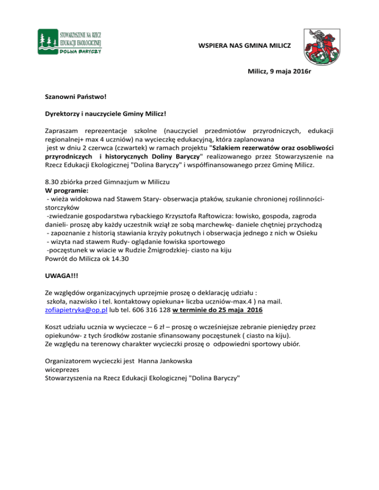 WSPIERA NAS GMINA MILICZ Milicz, 9 maja 2016r Szanowni Państwo! Dyrektorzy i nauczyciele Gminy Milicz! Zapraszam reprezentacje szkolne (nauczyciel przedmiotów przyrodniczych, edukacji regionalnej+ max 4 uczniów) na wycieczkę edukacyjną, która zaplanowana jest w dniu 2 czerwca (czwartek) w ramach projektu "Szlakiem rezerwatów oraz osobliwości przyrodniczych i historycznych Doliny Baryczy" realizowanego przez Stowarzyszenie na Rzecz Edukacji Ekologicznej "Dolina Baryczy" i współfinansowanego przez Gminę Milicz. 8.30 zbiórka przed Gimnazjum w Miliczu W programie: - wieża widokowa nad Stawem Stary- obserwacja ptaków, szukanie chronionej roślinnościstorczyków -zwiedzanie gospodarstwa rybackiego Krzysztofa Raftowicza: łowisko, gospoda, zagroda danieli- proszę aby każdy uczestnik wziął ze sobą marchewkę- daniele chętniej przychodzą - zapoznanie z historią stawiania krzyży pokutnych i obserwacja jednego z nich w Osieku - wizyta nad stawem Rudy- oglądanie łowiska sportowego -poczęstunek w wiacie w Rudzie Żmigrodzkiej- ciasto na kiju Powrót do Milicza ok 14.30 UWAGA!!! Ze względów organizacyjnych uprzejmie proszę o deklarację udziału : szkoła, nazwisko i tel. kontaktowy opiekuna+ liczba uczniów-max.4 ) na mail. [email protected] lub tel. 606 316 128 w terminie do 25 maja 2016 Koszt udziału ucznia w wycieczce – 6 zł – proszę o wcześniejsze zebranie pieniędzy przez opiekunów- z tych środków zostanie sfinansowany poczęstunek ( ciasto na kiju). Ze względu na terenowy charakter wycieczki proszę o odpowiedni sportowy ubiór. Organizatorem wycieczki jest Hanna Jankowska wiceprezes Stowarzyszenia na Rzecz Edukacji Ekologicznej "Dolina Baryczy"
