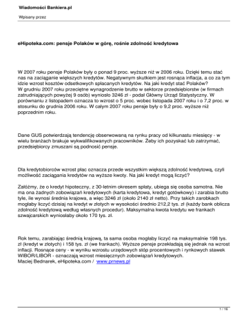 Wiadomości Bankiera.pl Wpisany przez eHipoteka.com: pensje Polaków w górę, rośnie zdolność kredytowa W 2007 roku pensje Polaków były o ponad 9 proc. wyższe niż w 2006 roku. Dzięki temu stać nas na zaciąganie większych kredytów. Negatywnym skutkiem jest rosnąca inflacja, a co za tym idzie wzrost kosztów odsetkowych spłacanych kredytów. Na jaki kredyt stać Polaków? W grudniu 2007 roku przeciętne wynagrodzenie brutto w sektorze przedsiębiorstw (w firmach zatrudniających powyżej 9 osób) wyniosło 3246 zł - podał Główny Urząd Statystyczny. W porównaniu z listopadem oznacza to wzrost o 5 proc. wobec listopada 2007 roku i o 7,2 proc. w stosunku do grudnia 2006 roku. W całym 2007 roku pensje były o 9,2 proc. wyższe niż poprzednim roku. Dane GUS potwierdzają tendencję obserwowaną na rynku pracy od kilkunastu miesięcy - w wielu branżach brakuje wykwalifikowanych pracowników. Żeby ich pozyskać lub zatrzymać, przedsiębiorcy zmuszani są podnosić pensje. Dla kredytobiorców wzrost płac oznacza przede wszystkim większą zdolność kredytową, czyli możliwość zaciągania kredytów na wyższe kwoty. Na jaki kredyt mogą liczyć? Załóżmy, że o kredyt hipoteczny, z 30-letnim okresem spłaty, ubiega się osoba samotna. Nie ma ona żadnych zobowiązań kredytowych (karta kredytowa, kredyt gotówkowy) i zarabia brutto tyle, ile wynosi średnia krajowa, a więc 3246 zł (około 2140 zł netto). Przy takich zarobkach mogłaby liczyć dzisiaj na kredyt w złotych w wysokości średnio 212,2 tys. zł (każdy bank oblicza zdolność kredytową według własnych procedur). Maksymalna kwota kredytu we frankach szwajcarskich wyniosłaby około 170 tys. zł. Rok temu, zarabiając średnią krajową, ta sama osoba mogłaby liczyć na maksymalnie 198 tys. zł (kredyt w złotych) i 158 tys. zł (we frankach). Wyższe pensje przekładają się jednak na wzrost inflacji. Rosnące ceny - w wyniku wzrostu urzędowych stóp procentowych i rynkowych stawek WIBOR/LIBOR - oznaczają wzrost miesięcznych zobowiązań kredytowych. Maciej Bednarek, eHipoteka.com / www.prnews.pl 1 / 16 Wiadomości Bankiera.pl Wpisany przez Najstarszy polski browar wystawiony na sprzedaż Przetarg może uratować browar w Lwówku Śl. Piwo Książęce i Dobre Mocne wrócą do sklepów Właśnie ogłoszono przetarg na sprzedaż Browaru Śląskiego 1209 w Lwówku Śląskim. Cena wywoławcza to ponad 2,5 mln zł. Nie jest wygórowana, biorąc pod uwagę osiemsetletnią tradycję warzenia piwa i trzy budynki, które są w dość dobrym stanie. Jedynie linia produkcyjna będzie wymagać remontu. - Mamy nadzieję, że ponownie ruszy produkcja piwa. Wszystko wyjaśni się po przetargu, który odbędzie się 5 lutego - mówi Bożena Korzeniowska, pracująca w zakładzie od wielu lat. Dodaje, że oficjalnie co prawda nie wpłynęła jeszcze żadna oferta, ale wie, że kilku inwestorów jest zainteresowanych kupnem upadłej spółki i wznowieniem produkcji. To bardzo dobra wiadomość nie tylko dla smakoszy trunku, ważonego naturalnymi metodami, ale także dla poszukujących pracy. - Niepasteryzowane piwo z naszego browaru to było samo zdrowie. Najbardziej mi smakowało Dobre Mocne - wspomina Janusz Szupszyński z Lwówka Śląskiego. W tamtejszym zakładzie pracowało 80 osób. Dziś z załogi zostało tylko kilka. Reszta straciła zatrudnienie. Dla ludzi było to ciosem, bo w powiecie lwóweckim każde miejsce pracy jest na wagę złota. Stopa bezrobocia wynosi aż 24,2 proc. (dane z listopada). To drugi powiat na Dolnym Śląsku, po złotoryjskim, gdzie bezrobocie jest największe. Gdyby reaktywowano browar, lwówczanie mogliby zwyczajnie zarobić na chleb. Były właściciel browaru Wolfgang Bauer na początku ubiegłego roku próbował ratować przed bankructwem firmę, którą kupił w 1999 r. Apelował, aby ludzie kupowali lokalne produkty, w tym piwo produkowane w grodzie lwa. Twierdził, że nie ma szans na konkurowanie z wielkimi korporacjami, które mają pieniądze na promocję i reklamę. Mimo to trunki, na przykład Książęce i Dobre Mocne, niejednokrotnie nagradzane na ogólnopolskich konkursach piwowarskich, nie znikały ze sklepowych półek. 21 stycznia 2007 r. ugotowano ostatnią warkę piwa. W zarządzaniu browarem zabrakło skutecznej strategii marketingowej. A główną przyczyną upadku stały się zaległości z tytułu podatku akcyzowego. W ciągu kilku lat dług urósł do ponad 4 mln zł. 2 / 16 Wiadomości Bankiera.pl Wpisany przez Bolączką regionalnych browarów jest to, że mają nikłe szanse na konkurowanie z głównymi graczami na piwnym rynku. Kampania Piwowarska (Lech, Żywiec), Grupa Żywiec i Calsberg Okocim opanowały grubo ponad 90 proc. rynku. - Jeszcze trzy lata temu małe zakłady piwne miały w nim udział 7 proc., obecnie wynosi tylko 4 proc. - mówi Andrzej Olkowski, prezes Stowarzyszenia Regionalnych Browarów Polskich. Lwówek Śląski słynął z produkcji piwa warzonego na podstawie naturalnej receptury sprzed 800 lat. Dzisiejszy browar stoi na miejscu pierwszego w historii browaru, który powstał w XII w. Książę Henryk I Brodaty nadał mieszczanom uprawnienia piwowarskie (czyli tzw. urbarz piwny) w 1209 r. Taki zapis widnieje w Księdze Miejskiej Wrocławia. 4 mln zł zaległości w akcyzie doprowadziło browar w Lwówku do upadłości. 90 proc. piwnego rynku należy w Polsce do trzech największych producentów POLSKA Gazeta Wrocławska Katarzyna Wilk PIU: Trzeba dokończyć reformę emerytalną Nadal nie wiadomo, jakie instytucje finansowe będą wypłacać świadczenia z II filara od 1 stycznia 2009 roku. „Emerytury powinny być wypłacane przez istniejące zakłady ubezpieczeń", powiedział prezes Polskiej Izby Ubezpieczeń Tomasz Mintoft-Czyż, podczas konferencji dotyczącej ubezpieczeń emerytalnych. Od przyszłego roku ponad 2,5 tysiąca kobiet sprawdzi na własnej skórze skutki reformy emerytalnej. Po dziesięciu latach od przeprow