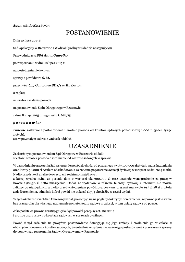 Sygn. akt I ACz 460/15 POSTANOWIENIE Dnia 10 lipca 2015 r. Sąd Apelacyjny w Rzeszowie I Wydział Cywilny w składzie następującym Przewodniczący: SSA Anna Gawełko po rozpoznaniu w dniu10 lipca 2015 r. na posiedzeniu niejawnym sprawy z powództwa S. M. przeciwko (...) Company SE z/s w R., Łotwa o zapłatę na skutek zażalenia powoda na postanowienie Sądu Okręgowego w Rzeszowie z dnia 8 maja 2015 r., sygn. akt I C 628/15 p o s t a n a w i a: zmienić zaskarżone postanowienie i zwolnić powoda od kosztów sądowych ponad kwotę 1.000 zł (jeden tysiąc złotych), zaś w powstałym zakresie wniosek oddalić. UZASADNIENIE Zaskarżonym postanowieniem Sąd Okręgowy w Rzeszowie oddalił w całości wniosek powoda o zwolnienie od kosztów sądowych w sprawie. W uzasadnieniu orzeczenia Sąd wskazał, że powód dochodzi od pozwanego kwoty 100.000 zł z tytułu zadośćuczynienia oraz kwoty 50.000 zł tytułem odszkodowania za znaczne pogorszenie sytuacji życiowej w związku ze śmiercią matki. Nadto przedstawił analizę jego sytuacji rodzinno-majątkowej, z której wynika m.in., że posiada dom o wartości ok. 300.000 zł oraz uzyskuje wynagrodzenie za pracę w kwocie 1.916,30 zł netto miesięcznie. Dodał, że wydatków w zakresie telewizji cyfrowej i Internetu nie można zaliczyć do niezbędnych, a nadto przed wytoczeniem powództwa pozwany przyznał mu kwotę 19.312,28 zł z tytułu zadośćuczynienia, odnośnie której powód nie wskazał aby ją chociażby w części wydał. W tych okolicznościach Sąd Okręgowy uznał, powołując się na poglądy doktryny i orzecznictwa, że powód jest w stanie bez uszczerbku dla własnego utrzymanie ponieść koszty sądowe w całości, w tym opłatę sądową od pozwu. Jako podstawę prawną rozstrzygnięcia Sąd powołał przepisy art. 102 ust. 1 i art. 101 ust. 1 ustawy o kosztach sądowych w sprawach cywilnych. Powód złożył zażalenie na powyższe postanowienie domagając się jego zmiany i zwolnienia go w całości z obowiązku ponoszenia kosztów sądowych, ewentualnie uchylenia zaskarżonego postanowienia i przekazania sprawy do ponownego rozpoznania Sądowi Okręgowemu w Rzeszowie. W zażaleniu skarżący zarzucił: • obrazę przepisów prawa procesowego, która miała wpływ na treść zaskarżonego postanowienia, a w szczególności art. 233 k.p.c. poprzez brak wszechstronnego rozważenia materiału dowodowego i dokonanie jego oceny z pominięciem okoliczności, które wskazywałyby na konieczność zastosowania przepisu art. 102 ust. 1 ustawy o kosztach sądowych w sprawach cywilnych, • naruszenie prawa materialnego, tj. art. 102 w/w ustawy poprzez przyjęcie, że powód jest w stanie ponieść koszty sądowe bez uszczerbku utrzymania koniecznego dla siebie i rodziny, mimo iż koszty te w znacznym stopniu przekraczają jego możliwości finansowe. W uzasadnieniu zażalenia wnioskodawca odniósł się do swojej sytuacji majątkowej wskazując, że całość swojego wynagrodzenia przeznacza na zaspokojenie podstawowych potrzeb gospodarstwa domowego m.in. na rachunki i opłaty za dom, żywność, środki czystości, lekarstwa odzież, drobne remonty domu i utrzymanie obejścia. Nadto podniósł, że konieczność przeznaczenia dużej części uzyskanej tytułem zadośćuczynienia kwoty na pokrycie opłat sądowych podważa cel i funkcję tego świadczenia. Sąd Apelacyjny zważył, co następuje : Zażalenie powoda zasługuje na uwzględnienie jedynie częściowo, tj. w zakresie kosztów sądowych ponad kwotę 1.000 zł. Należy podkreślić, że postępowanie sądowe jest co do zasady odpłatne, a sąd nie podejmuje żadnej czynności na skutek pisma, od którego nie została uiszczona należna opłata (art. 1262 § 1 k.p.c.). Zwolnienie od kosztów sądowych osoby fizycznej (art. 102 ust. 1 ustawy o kosztach sądowych w sprawach cywilnych; Dz.U. z 2014 r., poz. 1025, z późn. zm.), jest więc odstępstwem od tej zasady, w interesie osób słabszych ekonomicznie, umożliwiając im realizację konstytucyjnego prawa do sądu (art. 45 ust. 1 Konstytucji). Przy czym uwzględnienie wniosku o zwolnienie od ponoszenia kosztów sądowych następuje po rozważeniu przez sąd okoliczności odnoszących się do stanu rodzinnego, majątkowego, dochodów i źródeł utrzymania osoby ubiegającej się o zwolnienie. Opłaty sądowe stanowią rodzaj danin publicznych i zwolnienie od nich stanowi odstępstwo od konstytucyjnego obowiązku ich powszechnego i równego ponoszenia, wynikającego z art. 84 Konstytucji RP. Dlatego też zwolnienia mogą być stosowane, gdy istnieją uzasadnione powody do przerzucenia ciężaru dotyczącego danej osoby na współobywateli. Z ich bowiem środków pochodzą dochody budżetu państwa, z których pokrywa się koszty postępowania sądowego w razie zwolnienia strony z obowiązku ich ponoszenia. Zwolnienie od kosztów sądowych winno być zatem udzielane wyjątkowo, w szczególnie uzasadnionych okolicznościach, osobom nie mającym jakichkolwiek możliwości opłacania tych kosztów. (tak też Sąd Najwyższy w postanowieniu z 19.03.2010 r., II PZ 34/09, LEX nr 603836). Sąd Apelacyjny, mając na uwadze powołaną wyżej argumentację i treść art. 102 ust. 1 w zw. z art. 101 ust. 1 i 2 w/w ustawy, uznał że sytuacja powoda (szczegółowo opisania przez Sąd Okręgowy w uzasadnieniu zaskarżonego postanowienia) przemawia za częściowym zwolnieniem go z obowiązku ponoszenia kosztów sądowych w sprawie, tj. ponad kwotę 1.000 zł. Za powyższym przemawia fakt, że powód wprawdzie posiada dom i uzyskuje stałe wynagrodzenie, a nadto pozwany przyznał mu tytułem zadośćuczynienia w/w kwotę. Nie mniej jednak posiadany przez niego dom nie jest nowy i wymaga stałych nakładów. Kwota wynagrodzenia, w ocenie Sądu, pozwala zaś na pokrycie podstawowych potrzeb powoda, co zresztą potwierdzają wyszczególnione przez niego wydatki. Tym bardziej, że prowadzi samodzielnie gospodarstwo domowe i koszty z