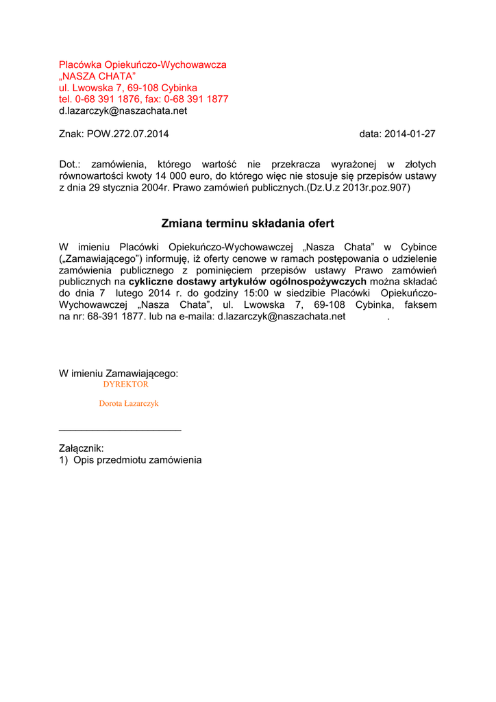 Placówka Opiekuńczo-Wychowawcza „NASZA CHATA” ul. Lwowska 7, 69-108 Cybinka tel. 0-68 391 1876, fax: 0-68 391 1877 [email protected] Znak: POW.272.07.2014 data: 2014-01-27 Dot.: zamówienia, którego wartość nie przekracza wyrażonej w złotych równowartości kwoty 14 000 euro, do którego więc nie stosuje się przepisów ustawy z dnia 29 stycznia 2004r. Prawo zamówień publicznych.(Dz.U.z 2013r.poz.907) Zmiana terminu składania ofert W imieniu Placówki Opiekuńczo-Wychowawczej „Nasza Chata” w Cybince („Zamawiającego”) informuję, iż oferty cenowe w ramach postępowania o udzielenie zamówienia publicznego z pominięciem przepisów ustawy Prawo zamówień publicznych na cykliczne dostawy artykułów ogólnospożywczych można składać do dnia 7 lutego 2014 r. do godziny 15:00 w siedzibie Placówki OpiekuńczoWychowawczej „Nasza Chata”, ul. Lwowska 7, 69-108 Cybinka, faksem na nr: 68-391 1877. lub na e-maila: [email protected] . W imieniu Zamawiającego: DYREKTOR Dorota Łazarczyk ______________________ Załącznik: 1) Opis przedmiotu zamówienia Załącznik 1 OPIS PRZEDMIOTU ZAMÓWIENIA DOSTAWA ARTYKUŁÓW SPOŻYWCZYCH Lp. 1 2 3 4 5 6 7 8 9 10 11 12 13 14 15 15 17 18 19 20 21 22 23 24 25 26 27 28 29 30 31 32 33 34 35 36 37 38 39 40 41 42 Nazwa artykułu*/** sok (syrop owocowy) 490 ml kakao rozpuszczalne 300 g kawa zbożowa rozpuszczalna typu „inka” krem czekoladowy do smarowania pieczywa 180 g ketchup 1l. przyprawa typu „wegeta” 1 kg makaron nitki 500 g makaron świderki 500 g olej 1 litr olej 5 l herbata ekspresowa owocowa -25 saszetek Herbata ekspresowa 40 saszetek ogórki konserwowe 900 ml cukier 1 kg ryż biały 4 x 100 g ryż biały 1 kg płatki śniadaniowe – kulki czekoladowe 500 g płatki śniadaniowe – miodowe 500 g płatki śniadaniowe – muszelki czekoladowe 500 g konserwa mięsna 300 g dżem w słoikach 280 g szczaw mielony w słoikach 270 g buraczki ćwikłowe (wiórki) w słoiku konserwa rybna - filet z makreli w oleju 170 g konserwa rybna - filet z makreli w pomidorach 170 g konserwa rybna - filet ze szprota w oleju 170 g konserwa rybna - filet ze szprota w pomidorach 170 g pasztet w puszkach 250 g mąka wrocławska 1 kg mąka tortowa 1 kg mąka ziemniaczana 1 kg Bułka tarta 500 g Budyń 60 g Galaretka 79 g Kisiel 77 g Cukier waniliowy 16 g Proszek do pieczenia 15 g Przyprawa w płynie typu „maggi”1000 g Paprykarz 310 g Sałatka obiadowa w słoikach 900 g Sałatka wielowarzywna w słoikach 900 g Koncentrat pomidorowy 180 g Proponowana cena Lp. 43 44 45 46 47 48 49 50 51 52 53 54 55 56 57 58 59 60 61 62 63 64 65 Nazwa artykułu*/** Groszek konserwowy 400 g Kukurydza konserwowa 400 g Musztarda 200 g Majonez dekoracyjny 250 g Majonez dekoracyjny 400 g Majonez dekoracyjny 700 g fasola czerwona konserwowa 400 g seler sałatkowy 350 g Miód wielokwiatowy 400 g Bulion wołowy w kostkach 180 g Bulion drobiowy w kostkach 180 g Czosnek granulowany 50 g Pieprz czarny mielony 50 g Sól 1 kg Papryka słodka 20 g Liść laurowy 6 g Przyprawa do kurczaka 30 g Ziele angielskie 15 g Majeranek 20 g Sos pieczeniowy 30 g Fix do spaghetti (w proszku) 30 g Kasza jęczmienna 4 x 100 g Ocet 1 l Proponowana cena * Ilość zamawianego towaru będzie uzależniona od liczby dzieci przebywających w Placówce. Liczba dzieci objętych całodobowym żywieniem wynosił 30. ** Przy wypełnianiu tabeli proszę o zwrócenie uwagi na podaną w opisie gramaturę opakowań. Jeżeli w Państwa ofercie jest artykuł o innej wadze, proszę przeliczyć wartość opakowania do gramatury podanej przez Zamawiającego. Zamówienia będą dokonywane co najmniej raz w tygodniu. Wykonawca zobowiązany jest dostarczyć przedmiot umowy na swój koszt w ciągu 1 dnia po złożeniu zamówienia przez Zamawiającego. Preferowany sposób zapłaty: przelew – 14 dni. DYREKTOR Dorota Łazarczyk