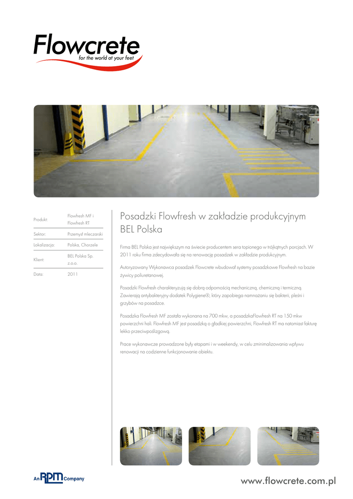 Produkt: Flowfresh MF i Flowfresh RT Sektor: Przemysł mleczarski Lokalizacja: Polska, Chorzele Klient: BEL Polska Sp. z.o.o. Data: 2011 Posadzki Flowfresh w zakładzie produkcyjnym BEL Polska Firma BEL Polska jest największym na świecie producentem sera topionego w trójkątnych porcjach. W 2011 roku firma zdecydowała się na renowację posadzek w zakładzie produkcyjnym. Autoryzowany Wykonawca posadzek Flowcrete wbudował systemy posadzkowe Flowfresh na bazie żywicy poliuretanowej. Posadzki Flowfresh charakteryzują się dobrą odpornością mechaniczną, chemiczną i termiczną. Zawierają antybakteryjny dodatek Polygiene®, który zapobiega namnażaniu się bakterii, pleśni i grzybów na posadzce. Posadzka Flowfresh MF została wykonana na 700 mkw, a posadzkaFlowfresh RT na 150 mkw powierzchni hali. Flowfresh MF jest posadzką o gładkiej powierzchni, Flowfresh RT ma natomiast fakturę lekko przeciwpoślizgową. Prace wykonawcze prowadzone były etapami i w weekendy, w celu zminimalizowania wpływu renowacji na codzienne funkcjonowanie obiektu. www.flowcrete.com.pl