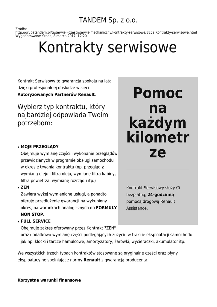 TANDEM Sp. z o.o. Źródło: http://grupatandem.pl/tr/serwis-i-czesci/serwis-mechaniczny/kontrakty-serwisowe/8852,Kontrakty-serwisowe.html Wygenerowano: Środa, 8 marca 2017, 12:20 Kontrakty serwisowe Kontrakt Serwisowy to gwarancja spokoju na lata dzięki profesjonalnej obsłudze w sieci Autoryzowanych Partnerów Renault. Wybierz typ kontraktu, który najbardziej odpowiada Twoim potrzebom: ● MOJE PRZEGLĄDY Obejmuje wymianę części i wykonanie przeglądów przewidzianych w programie obsługi samochodu Pomoc na każdym kilometr ze w okresie trwania kontraktu (np. przegląd z wymianą oleju i filtra oleju, wymianę filtra kabiny, filtra powietrza, wymianę rozrządu itp.) ● ZEN Kontrakt Serwisowy służy Ci Zawiera wyżej wymienione usługi, a ponadto bezpłatną, 24-godzinną oferuje przedłużenie gwarancji na wykupiony pomocą drogową Renault okres, na warunkach analogicznych do FORMUŁY Assistance. NON STOP. ● FULL SERVICE Obejmuje zakres oferowany przez Kontrakt ?ZEN" oraz dodatkowo wymianę części podlegających zużyciu w trakcie eksploatacji samochodu jak np. klocki i tarcze hamulcowe, amortyzatory, żarówki, wycieraczki, akumulator itp. We wszystkich trzech typach kontraktów stosowane są oryginalne części oraz płyny eksploatacyjne spełniające normy Renault z gwarancją producenta. Korzystne warunki finansowe ● Istnieje możliwość zakupu Kontraktu Serwisowego na raty wraz z nowym samochodem w ofercie kredytowej RCI Bank Polska S.A. ● Kontrakt Serwisowy jest przypisany do danego auta, jeśli zdecydujesz się sprzedać samochód, sprzedasz go łatwiej i korzystniej, ponieważ ma wyższą wartość rynkową. Czas START! Kontrakt Serwisowy możesz wykupić w ciągu 12 miesięcy od daty pierwszej rejestracji auta (przed wykonaniem pierwszego przeglądu).