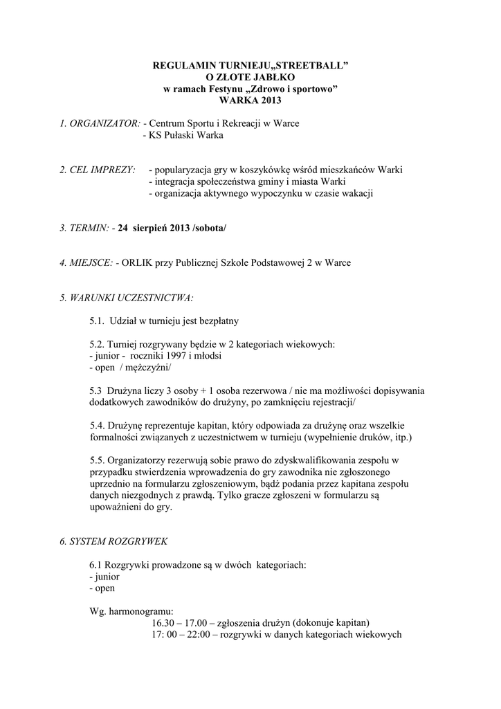 REGULAMIN TURNIEJU„STREETBALL” O ZŁOTE JABŁKO w ramach Festynu „Zdrowo i sportowo” WARKA 2013 1. ORGANIZATOR: - Centrum Sportu i Rekreacji w Warce - KS Pułaski Warka 2. CEL IMPREZY: - popularyzacja gry w koszykówkę wśród mieszkańców Warki - integracja społeczeństwa gminy i miasta Warki - organizacja aktywnego wypoczynku w czasie wakacji 3. TERMIN: - 24 sierpień 2013 /sobota/ 4. MIEJSCE: - ORLIK przy Publicznej Szkole Podstawowej 2 w Warce 5. WARUNKI UCZESTNICTWA: 5.1. Udział w turnieju jest bezpłatny 5.2. Turniej rozgrywany będzie w 2 kategoriach wiekowych: - junior - roczniki 1997 i młodsi - open / mężczyźni/ 5.3 Drużyna liczy 3 osoby + 1 osoba rezerwowa / nie ma możliwości dopisywania dodatkowych zawodników do drużyny, po zamknięciu rejestracji/ 5.4. Drużynę reprezentuje kapitan, który odpowiada za drużynę oraz wszelkie formalności związanych z uczestnictwem w turnieju (wypełnienie druków, itp.) 5.5. Organizatorzy rezerwują sobie prawo do zdyskwalifikowania zespołu w przypadku stwierdzenia wprowadzenia do gry zawodnika nie zgłoszonego uprzednio na formularzu zgłoszeniowym, bądź podania przez kapitana zespołu danych niezgodnych z prawdą. Tylko gracze zgłoszeni w formularzu są upoważnieni do gry. 6. SYSTEM ROZGRYWEK 6.1 Rozgrywki prowadzone są w dwóch kategoriach: - junior - open Wg. harmonogramu: 16.30 – 17.00 – zgłoszenia drużyn (dokonuje kapitan) 17: 00 – 22:00 – rozgrywki w danych kategoriach wiekowych 6.2. Eliminacje – system grupowy - o podziale drużyn na grupy zdecyduje losowanie - o kolejności miejsc w grupach decyduje - większa ilość zwycięskich meczów - wynik bezpośredniego meczu - korzystniejsza różnica punktów 6.3. Finały – system pucharowy. 7. ZASADY GRY: 7.1. Mecze Streetball’a rozgrywane są na boiskach o wymiarach od 9x9 do 12x12 m, na jeden kosz. Na boisku zaznaczona jest linia przerywana w odległości 6,75 m. 7.2. Każda gra musi rozpocząć się udziałem dwóch trzyosobowych drużyn składających się z graczy uprzednio zgłoszonych do turnieju, a zakończyć mecz posiadając w składzie co najmniej 2 zawodników. 7.3. O tym, która drużyna będzie w posiadaniu piłki jako pierwsza, decyduje losowanie. 7.4. Każdy uzyskany kosz to 1 punkt. Za kosz uzyskany z dystansu ( zza lini od kosza 6,75 m tzw. linii dystansowej zalicza się dwa punkty. Graczowi niewolno w trakcie rzutu dotknąć tej linii. 7.5. Gra toczy się do zdobycia przez jedną z drużyn 11 punktów lub przez 10 minut ciągłej gry. 7.6. W przypadku zakończenia 10 minutowego czasu gry i nie uzyskania przez którąś z drużyn 11 punktów mecz jest przerywany i zapisywany jest wynik uzyskany przez drużyny w czasie 10 minut. 7.7. W przypadku, gdy po 10 minutach gry wynik jest remisowy, zarządzana jest dogrywka – „Złoty kosz”, czyli gra się do zdobycia przez którąkolwiek z drużyn jednego kosza. Grę rozpoczyna się od rzutu sędziowskiego. 7.9. Zabronione jest dobijanie piłki po rzucie drużyny przeciwnej. Dobitka po rzucie własnej drużyny jest dozwolona. 7.10. Każdej drużynie przysługuje do wykorzystania jeden 30-sekundowy czas w trakcie meczu. 7.11. W meczach STREETBALL nie ma sędziego. Obserwatorzy wyznaczeni przez organizatorów rozstrzygać będą kwestie sporne w momencie gdy kapitanowie drużyn nie dojdą do porozumienia. Organizator może zdecydować, że mecze fazy finałowej w całości poprowadzą obserwatorzy. 7.12. Należy dążyć do polubownego załatwiania wszelkich sporów w imię przyjacielskiej i serdecznej atmosfery zawodów. Sędzia ma werdykt ostateczny. 7.13. Złośliwe faule zauważone przez sędziego gry będą karane rzutem za 1 punkt z linii 5 m oraz przekazaniem piłki po rzucie drużynie pokrzywdzonej. 7.14. Brutalność w grze lub złe zachowanie całej drużyny podczas turnieju może doprowadzić do wykluczenia jej z rywalizacji. 7.15. Limit fauli na drużynie – 4, przy piątym i kolejnych faulach rzut wolny. 7.16. Przepisy gry obowiązują wg przepisów PZKOSZ chyba, że organizator zastrzega to w regulaminie. 8. POSTANOWIENIA OGÓLNE: 8.1. Zawodnicy odpowiadają materialnie za szkody wyrządzone w wyniku użytkowania koszy do gry niezgodnie z regulaminem. 8.2. Organizatorzy turnieju nie biorą odpowiedzialności za wszelkie urazy i kontuzje zawodników powstałe w trakcie turnieju. 8.3. Organizatorzy zastrzegają sobie prawo do zmiany regulaminu. W przypadku istotnych zmian zobowiązują się do powiadomienia zawodników o zmianach w regulaminie. 8.4. Uczestnicy zawodów przystępujący do rozgrywek zapoznali się z regulaminem i akceptują jego założenia 8.5. Za rzeczy pozostawione bez opieki organizator nie odpowiada 8.6. Organizator zapewnia: sprzęt sportowy, opiekę medyczną FORMULARZ ZGŁOSZENIOWY STREETBALL WARKA 2013 O ZŁOTE JABŁKO SKŁAD ZESPOŁU NAZWA ZESPOŁU L.p. 1. 2. 3. 4. KAPITAN ZESPOŁU TELEFON E - MAIL Nazwisko i imię