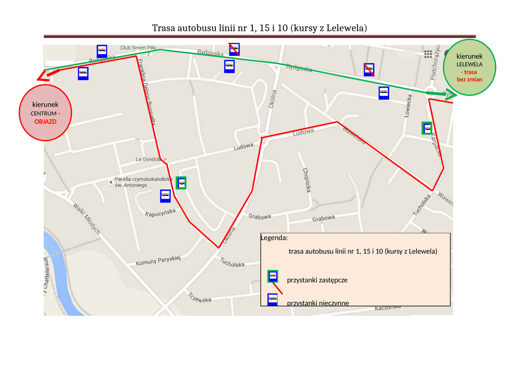 Trasa autobusu linii nr 1, 15 i 10 (kursy z Lelewela) kierunek LELEWELA - trasa bez zmian kierunek CENTRUM - OBJAZD Legenda: trasa autobusu linii nr 1, 15 i 10 (kursy z Lelewela) przystanki zastępcze przystanki nieczynne
