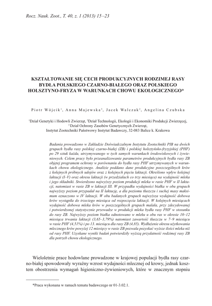 Rocz. Nauk. Zoot., T. 40, z. 1 (2013) 15 –23 Kształtowanie się cech produkcyjnych rodzimej rasy bydła POLSKIEGO czarno-białego Oraz Polskiego holsztyno-fryza w warunkach chowu EKOLOGICZNEGO* * P i o t r W ó j c i k 1, A n n a M a j e w s k a 3, J a c e k Wa l c z a k 2, A n g e l i n a C z u b s k a Dział Genetyki i Hodowli Zwierząt, 2Dział Technologii, Ekologii i Ekonomiki Produkcji Zwierzęcej, 3 Dział Ochrony Zasobów Genetycznych Zwierząt, Instytut Zootechniki Państwowy Instytut Badawczy, 32-083 Balice k. Krakowa 1 Badania prowadzono w Zakładzie Doświadczalnym Instytutu Zootechniki PIB na dwóch grupach bydła rasy polskiej czarno-białej (ZB) i polskiej holsztyńsko-fryzyjskiej (PHF) po 29 sztuk każda, utrzymywanego w tych samych warunkach środowiskowych i żywieniowych. Celem pracy było przeanalizowanie parametrów produkcyjnych bydła rasy ZB objętej programem ochrony w porównaniu do bydła rasy PHF utrzymywanych w warunkach chowu ekologicznego. Analizie poddano dane produkcyjne poszczególnych krów z kolejnych próbnych udojów oraz z kolejnych pięciu laktacji. Określono wpływ kolejnej laktacji (I–V) oraz okresu laktacji (w przedziałach co trzy miesiące) na wydajność mleka i jego składniki. Stwierdzono najwyższy poziom produkcji mleka w rasie PHF w II laktacji, natomiast w rasie ZB w laktacji III. W przypadku wydajności białka w obu grupach najwyższy poziom przypadał na II laktację, a dla poziomu tłuszczu i suchej masy maksimum oznaczono w IV laktacji. W obu badanych grupach najwyższa wydajność dobowa krów wystąpiła do trzeciego miesiąca od rozpoczęcia laktacji. W kolejnych miesiącach wydajność dobowa mleka krów w poszczególnych grupach malała, przy zdecydowanej i potwierdzonej statystycznie przewadze w produkcji mleka bydła rasy PHF w stosunku do rasy ZB. Najwyższy poziom białka odnotowano w mleku u obu ras w okresie 10–12 miesiąca trwania laktacji (3,65–3,79%) natomiast zawartość tłuszczu w 7–9 miesiącu w rasie PHF (4,51%) i po 13. miesiącu dla rasy ZB (4,85). Wydłużenie okresu użytkowania mlecznego krów powyżej 12 miesięcy w rasie ZB pozwala pozyskać wyższe ilości mleka niż od rasy PHF. Uzyskane wyniki badań potwierdziły wyższą przydatność rodzimej rasy ZB dla potrzeb chowu ekologicznego. Wieloletnie prace hodowlane prowadzone w krajowej populacji bydła rasy czarno-białej spowodowały wyraźny wzrost wydajności mlecznej od krowy, jednak kosztem obostrzenia wymagań higieniczno-żywieniowych, które w znacznym stopniu *Praca wykonana w ramach tematu badawczego nr 01-3.02.1. 16 P. Wójcik i in. warunkują efektywność produkcji. Precyzyjne określenie czynników wpływających na wydajność mleczną krów (wiek krowy, stan fizjologiczny, system utrzymania, system żywienia, pora roku) zostały już w znacznej mierze poznane (Dorynek i Kliks, 1998; Górska i Litwińczuk, 2002; Harmon, 1994; Kamieniecki i in., 2000; Litwińczuk i in., 2000; Matras i in., 2000; Nałęcz-Tarnawska i in., 2002; Rola, 2000; Sawa i in., 2000; Sender i in., 1987). Badania te dotyczyły jednak warunków chowu konwencjonalnego, opartego o intensywne metody produkcji i maksymalizację wykorzystania potencjału genetycznego zwierząt. W przypadku chowu ekologicznego obserwuje się istotne zmiany, tak w warunkach środowiskowych (system utrzymania, mikroklimat), jak i żywieniu zwierząt (konieczność pastwiskowania, stosowanie pasz certyfikowanych, minimum 60% udział pasz objętościowych). Wobec ograniczeń prawnych w stosunku do remontu stada, istotne pozostaje tu utrzymanie wysokiego wskaźnika długowieczności zwierząt, przy równoczesnym zachowaniu wysokich parametrów jakościowych i ilościowych produkowanego mleka. Dodatkowym czynnikiem warunkującym utrzymywanie określonej rasy w gospodarstwach ekologicznych są szeroko rozumiane aspekty ekonomiczne, uzależnione od poziomu produkcji i poniesionych nakładów (Wielgosz-Groth i Groth, 2004). Mimo zaleceń preferowania w chowie ekologicznym ras rodzimych, wiele z certyfikowanych gospodarstw wprowadza zwierzęta znane z chowu konwencjonalnego, a charakteryzujące się wyższą produkcyjnością. Stąd celem pracy jest przeanalizowanie parametrów produkcyjnych bydła rasy polskiej czarno-białej (ZB) objętej programem ochrony w porównaniu do bydła rasy PHF utrzymywanego w warunkach ekologicznego chowu. Materiał i metody Badania prowadzono w certyfikowanym gospodarstwie ekologicznym, będącym częścią ZD IZ PIB Chorzelów na dwóch grupach bydła mlecznego liczących po 29 sztuk każda: rasy polskiej czarno-białej objętej programem ochrony (ZB) oraz polskiej holsztyńsko-fryzyjskiej odmiany czarno-białej (PHF). Obie grupy utrzymywano w tych samych warunkach środowiskowych (obora wolnostanowiskowa, dój na hali udojowej) i żywieniowych (dawka dla krowy: 650 kg, 4,4% tłuszczu, białko 3,6%, wydajność 25 l) zaprezentowanych w tabeli 1. Krowy analogi do obu grup były dobrane na podstawie wieku i laktacji. Analizie poddano dane produkcyjne poszczególnych krów za lata 2008–2011, takie jak: wydajność mleka, zawartość tłuszczu, białka, suchej masy w kolejnych próbny udojach oraz w kolejnych laktacjach. Określono wpływ kolejnej laktacji (I–V) oraz okresu laktacji (w przedziałach co trzy miesiące) na wydajność mleka i wybrane jego parametry. W analizie wykorzystano wyniki z łącznie 733 próbnych udojów mleka. Na podstawie uzyskanych danych wykreślono krzywe produkcji mleka oraz zawartości suchej masy. Uzyskane wyniki produkcyjne poddano analizie statystycznej w oparciu o jednoczynnikową analizę wariancji, przy pomocy pakietu statystycznego SAS z procedurą GLM oraz porównano średnie przy pomocy procedury LSM. 17 Cechy produkcyjne bydła w chowie ekologicznym Tabela 1. Żywienie letnie i zimowe krów biorących udział w doświadczeniu Table 1. Summer and winter feeding of cows used in the experiment Żywienie zimowe Winter feed