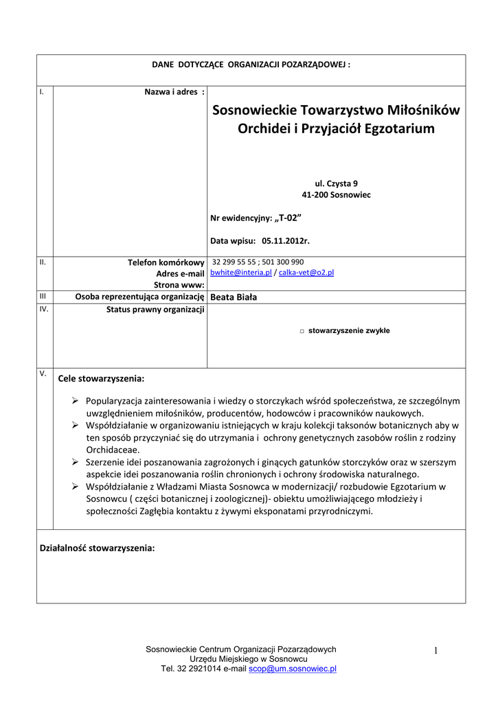DANE DOTYCZĄCE ORGANIZACJI POZARZĄDOWEJ : I. Nazwa i adres : Sosnowieckie Towarzystwo Miłośników Orchidei i Przyjaciół Egzotarium ul. Czysta 9 41-200 Sosnowiec Nr ewidencyjny: „T-02” Data wpisu: 05.11.2012r. II. III IV. Telefon komórkowy 32 299 55 55 ; 501 300 990 Adres e-mail [email protected] / [email protected] Strona www: Osoba reprezentująca organizację Beata Biała Status prawny organizacji □ stowarzyszenie zwykłe V. Cele stowarzyszenia:  Popularyzacja zainteresowania i wiedzy o storczykach wśród społeczeństwa, ze szczególnym uwzględnieniem miłośników, producentów, hodowców i pracowników naukowych.  Współdziałanie w organizowaniu istniejących w kraju kolekcji taksonów botanicznych aby w ten sposób przyczyniać się do utrzymania i ochrony genetycznych zasobów roślin z rodziny Orchidaceae.  Szerzenie idei poszanowania zagrożonych i ginących gatunków storczyków oraz w szerszym aspekcie idei poszanowania roślin chronionych i ochrony środowiska naturalnego.  Współdziałanie z Władzami Miasta Sosnowca w modernizacji/ rozbudowie Egzotarium w Sosnowcu ( części botanicznej i zoologicznej)- obiektu umożliwiającego młodzieży i społeczności Zagłębia kontaktu z żywymi eksponatami przyrodniczymi. Działalność stowarzyszenia: Sosnowieckie Centrum Organizacji Pozarządowych Urzędu Miejskiego w Sosnowcu Tel. 32 2921014 e-mail [email protected] 1