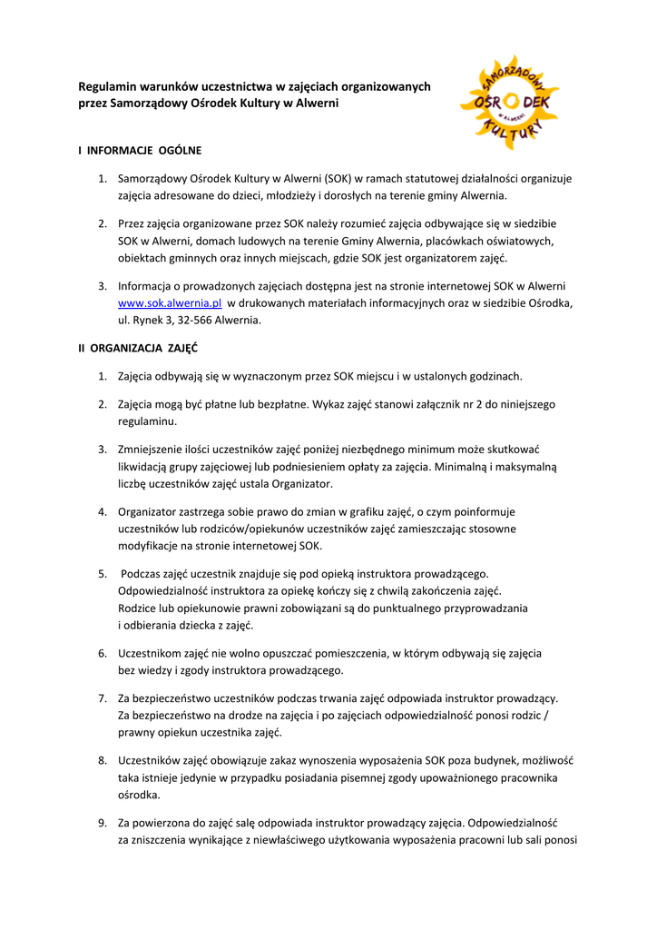 Regulamin warunków uczestnictwa w zajęciach organizowanych przez Samorządowy Ośrodek Kultury w Alwerni I INFORMACJE OGÓLNE 1. Samorządowy Ośrodek Kultury w Alwerni (SOK) w ramach statutowej działalności organizuje zajęcia adresowane do dzieci, młodzieży i dorosłych na terenie gminy Alwernia. 2. Przez zajęcia organizowane przez SOK należy rozumieć zajęcia odbywające się w siedzibie SOK w Alwerni, domach ludowych na terenie Gminy Alwernia, placówkach oświatowych, obiektach gminnych oraz innych miejscach, gdzie SOK jest organizatorem zajęć. 3. Informacja o prowadzonych zajęciach dostępna jest na stronie internetowej SOK w Alwerni www.sok.alwernia.pl w drukowanych materiałach informacyjnych oraz w siedzibie Ośrodka, ul. Rynek 3, 32-566 Alwernia. II ORGANIZACJA ZAJĘĆ 1. Zajęcia odbywają się w wyznaczonym przez SOK miejscu i w ustalonych godzinach. 2. Zajęcia mogą być płatne lub bezpłatne. Wykaz zajęć stanowi załącznik nr 2 do niniejszego regulaminu. 3. Zmniejszenie ilości uczestników zajęć poniżej niezbędnego minimum może skutkować likwidacją grupy zajęciowej lub podniesieniem opłaty za zajęcia. Minimalną i maksymalną liczbę uczestników zajęć ustala Organizator. 4. Organizator zastrzega sobie prawo do zmian w grafiku zajęć, o czym poinformuje uczestników lub rodziców/opiekunów uczestników zajęć zamieszczając stosowne modyfikacje na stronie internetowej SOK. 5. Podczas zajęć uczestnik znajduje się pod opieką instruktora prowadzącego. Odpowiedzialność instruktora za opiekę kończy się z chwilą zakończenia zajęć. Rodzice lub opiekunowie prawni zobowiązani są do punktualnego przyprowadzania i odbierania dziecka z zajęć. 6. Uczestnikom zajęć nie wolno opuszczać pomieszczenia, w którym odbywają się zajęcia bez wiedzy i zgody instruktora prowadzącego. 7. Za bezpieczeństwo uczestników podczas trwania zajęć odpowiada instruktor prowadzący. Za bezpieczeństwo na drodze na zajęcia i po zajęciach odpowiedzialność ponosi rodzic / prawny opiekun uczestnika zajęć. 8. Uczestników zajęć obowiązuje zakaz wynoszenia wyposażenia SOK poza budynek, możliwość taka istnieje jedynie w przypadku posiadania pisemnej zgody upoważnionego pracownika ośrodka. 9. Za powierzona do zajęć salę odpowiada instruktor prowadzący zajęcia. Odpowiedzialność za zniszczenia wynikające z niewłaściwego użytkowania wyposażenia pracowni lub sali ponosi osoba nie przestrzegająca zasad ich użytkowania – w przypadku osób nieletnich są to prawni opiekunowie tej osoby. 10. Uczestnicy zajęć zobowiązani są do przestrzegania norm społecznych wobec innych osób, przepisów przeciwpożarowych, porządkowych i bezpieczeństwa. 11. W przypadku jakiegokolwiek zagrożenia uczestnicy zajęć zobowiązani są do stosowania się do poleceń pracownika SOK lub Instruktora. 12. Samorządowy Ośrodek Kultury w Alwerni zastrzega sobie prawo do wykorzystywania i przetwarzania danych osobowych, zdjęć i nagrań filmowych w celach informacyjnych, rekrutacyjnych i promocyjnych związanych z jego działalnością. 13. Na terenie ośrodka i w miejscu prowadzenia zajęć obowiązuje całkowity zakaz spożywania alkoholu, używania środków odurzających oraz zakaz przebywania osób po spożyciu tego rodzaju substancji, zakaz palenia tytoniu jak również zakaz wnoszenia jakichkolwiek niebezpiecznych przedmiotów. 14. SOK nie ponosi odpowiedzialności za rzeczy pozostawione przez uczestników zajęć 15. Z Sali można korzystać wyłącznie podczas obecności instruktora lub upoważnionego pracownika SOK 16. SOK nie ubezpiecza uczestników zajęć od następstw nieszczęśliwych wypadków §3 III WARUNKI UCZESTNICTWA W ZAJĘCIACH 1. Warunkiem uczestnictwa w zajęciach organizowanych przez SOK w Alwerni jest: a) Akceptacja niniejszego regulaminu oraz regulaminów zajęć. b) W przypadku osób niepełnoletnich złożenie Karty Uczestnika Zajęć Organizowanych przez SOK w Alwerni podpisanej przez rodzica/opiekuna, stanowiącej załącznik nr 1 do niniejszego regulaminu. c) W przypadku zajęć płatnych, uiszczenie opłaty regulowanej cennikiem SOK, który stanowi załącznik nr 2 do niniejszego regulaminu 2. Pierwszeństwo uczestniczenia w zajęciach mają osoby z terenu miasta i gminy Alwernia. 3. Korzystanie z wyposażenia sal i pracowni odbywa się wyłącznie zgodnie z jego przeznaczeniem. 4. Opłata za semestr zajęć płatnych, wnoszona jest jednorazowo z góry lub rozłożona na raty płatne do 10 każdego miesiąca 5. Opłat można dokonywać w sekretariacie SOK od poniedziałku do piątku w godzinach pracy ośrodka lub przelewem na rachunek bankowy SOK nr BS Chrzanów O/Alwernia 91 8444 0008 0040 0400 1469 0004. W tytule przelewu muszą znajdować się: imię i nazwisko uczestnika, forma zajęć oraz określenie miesiąca, za który wpłata jest wnoszona. 6. Opłata za zajęcia cykliczne jest stała i niezależna od ilości zajęć przypadających w danym miesiącu (z wyjątkiem zajęć nauki gry na instrumentach i kursów). Nieobecność uczestnika na zajęciach cyklicznych nie zwalnia z obowiązku płatności. W uzasadnionych przypadkach na wniosek uczestnika, Dyrektor może zwolnić z opłaty za zajęcia w przypadku usprawiedliwionej z ważnych przyczyn nieobecności. 7. Opłata za płatne zajęcia dla dorosłych, warsztaty, kursy itp. Ustalane będą indywidualnie i uzależnione od rodzaju kosztów, które musi ponieść SOK. 8. Uczestnik, który nie wniósł należnej opłaty, nie może brać udziału w zajęciach. 9. Minimalny wiek uczestników określa się w zależności od rodzaju prowadzonych zajęć 10. W przypadku rezygnacji z zajęć, uczestnik ma obowiązek niezwłocznie zgłosić ten fakt w sekretariacie po wcześniejszym uregulowaniu wszelkich należności. 11. Na zajęciach obowiązuje obuwie zamienne. 12. Uczestnik może być skreślony z listy zajęć tematycznych w przypadku: - nieusprawiedliwionej nieobe
