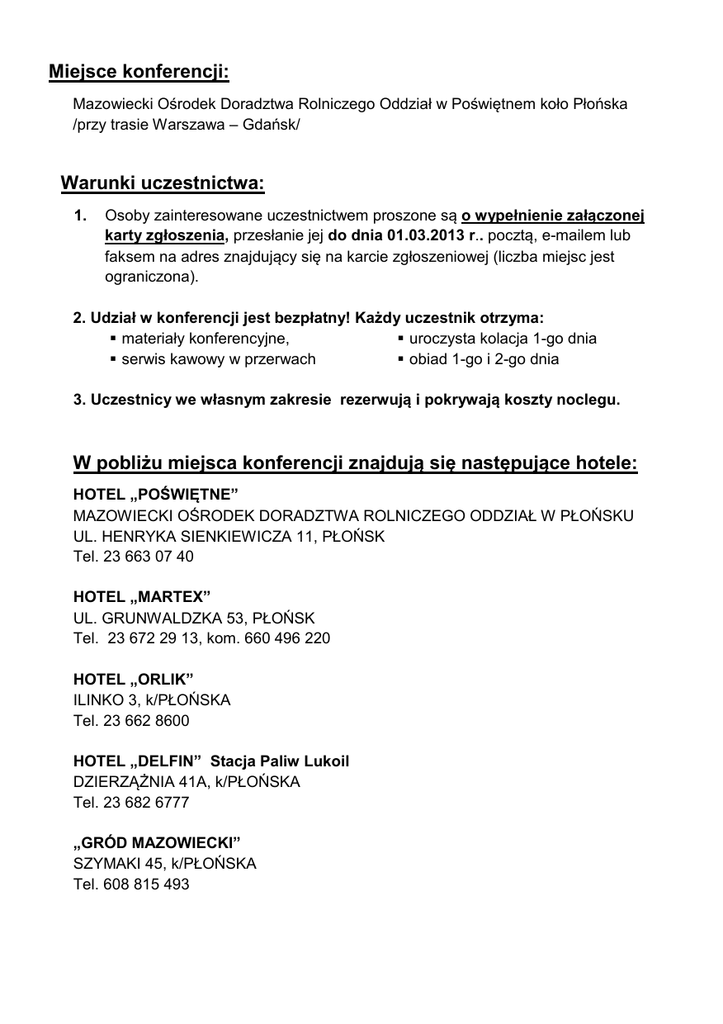 Miejsce konferencji: Mazowiecki Ośrodek Doradztwa Rolniczego Oddział w Poświętnem koło Płońska /przy trasie Warszawa – Gdańsk/ Warunki uczestnictwa: 1. Osoby zainteresowane uczestnictwem proszone są o wypełnienie załączonej karty zgłoszenia, przesłanie jej do dnia 01.03.2013 r.. pocztą, e-mailem lub faksem na adres znajdujący się na karcie zgłoszeniowej (liczba miejsc jest ograniczona). 2. Udział w konferencji jest bezpłatny! Każdy uczestnik otrzyma: materiały konferencyjne, uroczysta kolacja 1-go dnia serwis kawowy w przerwach obiad 1-go i 2-go dnia 3. Uczestnicy we własnym zakresie rezerwują i pokrywają koszty noclegu. W pobliżu miejsca konferencji znajdują się następujące hotele: HOTEL „POŚWIĘTNE” MAZOWIECKI OŚRODEK DORADZTWA ROLNICZEGO ODDZIAŁ W PŁOŃSKU UL. HENRYKA SIENKIEWICZA 11, PŁOŃSK Tel. 23 663 07 40 HOTEL „MARTEX” UL. GRUNWALDZKA 53, PŁOŃSK Tel. 23 672 29 13, kom. 660 496 220 HOTEL „ORLIK” ILINKO 3, k/PŁOŃSKA Tel. 23 662 8600 HOTEL „DELFIN” Stacja Paliw Lukoil DZIERZĄŻNIA 41A, k/PŁOŃSKA Tel. 23 682 6777 „GRÓD MAZOWIECKI” SZYMAKI 45, k/PŁOŃSKA Tel. 608 815 493