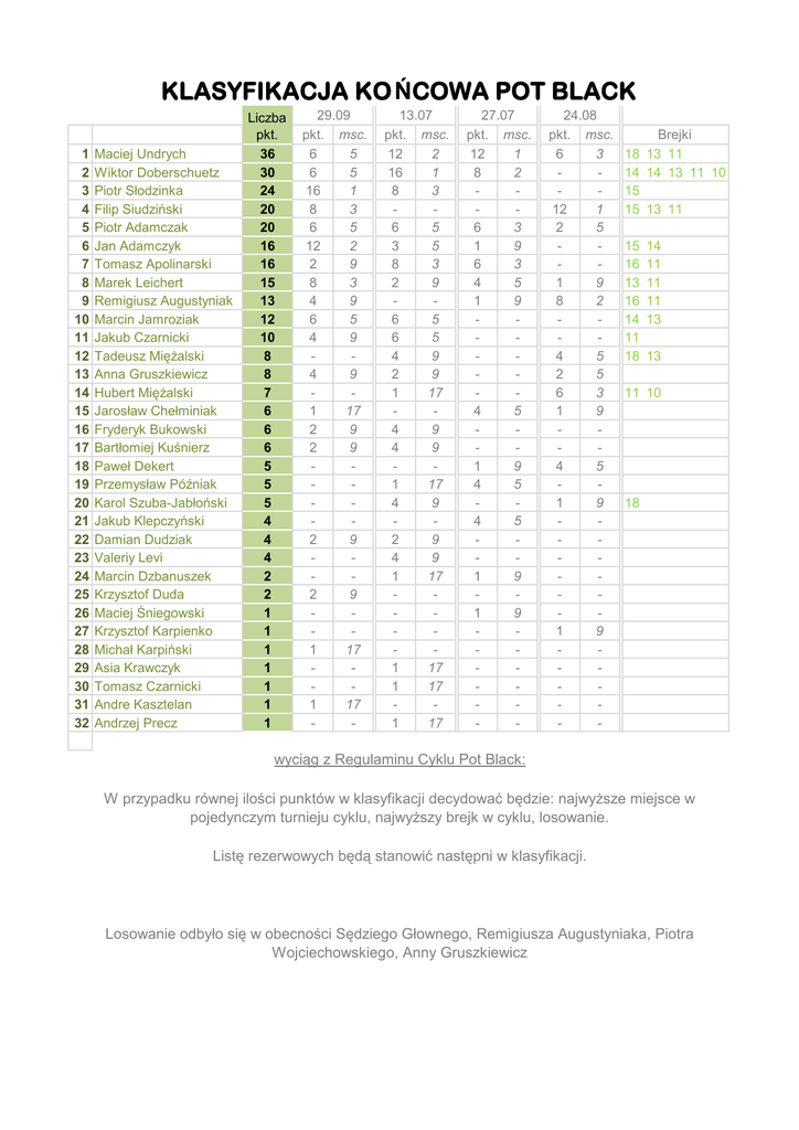 KLASYFIKACJA KO ŃCOWA COWA POT BLACK 1 2 3 4 5 6 7 8 9 10 11 12 13 14 15 16 17 18 19 20 21 22 23 24 25 26 27 28 29 30 31 32 Maciej Undrych Wiktor Doberschuetz Piotr Słodzinka Filip Siudziński Piotr Adamczak Jan Adamczyk Tomasz Apolinarski Marek Leichert Remigiusz Augustyniak Marcin Jamroziak Jakub Czarnicki Tadeusz MięŜalski Anna Gruszkiewicz Hubert MięŜalski Jarosław Chełminiak Fryderyk Bukowski Bartłomiej Kuśnierz Paweł Dekert Przemysław Późniak Karol Szuba-Jabłoński Jakub Klepczyński Damian Dudziak Valeriy Levi Marcin Dzbanuszek Krzysztof Duda Maciej Śniegowski Krzysztof Karpienko Michał Karpiński Asia Krawczyk Tomasz Czarnicki Andre Kasztelan Andrzej Precz Liczba pkt. 36 30 24 20 20 16 16 15 13 12 10 8 8 7 6 6 6 5 5 5 4 4 4 2 2 1 1 1 1 1 1 1 29.09 pkt. msc. 6 5 6 5 16 1 8 3 6 5 12 2 2 9 8 3 4 9 6 5 4 9 4 9 1 17 2 9 2 9 2 9 2 9 1 17 1 17 - 13.07 pkt. msc. 12 2 16 1 8 3 6 5 3 5 8 3 2 9 6 5 6 5 4 9 2 9 1 17 4 9 4 9 1 17 4 9 2 9 4 9 1 17 1 17 1 17 1 17 27.07 pkt. msc. 12 1 8 2 6 3 1 9 6 3 4 5 1 9 4 5 1 9 4 5 4 5 1 9 1 9 - 24.08 pkt. msc. 6 3 12 1 2 5 1 9 8 2 4 5 2 5 6 3 1 9 4 5 1 9 1 9 - Brejki 18 13 11 14 14 13 11 10 15 15 13 11 15 16 13 16 14 11 18 14 11 11 11 13 13 11 10 18 wyciąg z Regulaminu Cyklu Pot Black: W przypadku równej ilości punktów w klasyfikacji decydować będzie: najwyŜsze miejsce w pojedynczym turnieju cyklu, najwyŜszy brejk w cyklu, losowanie. Listę rezerwowych będą stanowić następni w klasyfikacji. Losowanie odbyło się w obecności Sędziego Głownego, Remigiusza Augustyniaka, Piotra Wojciechowskiego, Anny Gruszkiewicz