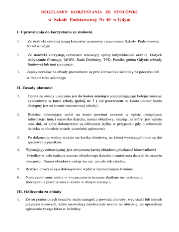 REGULAMIN KORZYSTANIA ZE STOŁÓWKI w Szkole Podstawowej Nr 40 w Gdyni I. Uprawnienia do korzystania ze stołówki 1. Ze stołówki szkolnej mogą korzystać uczniowie i pracownicy Szkoły Podstawowej Nr 40 w Gdyni. 2. Ze stołówki korzystają uczniowie wnoszący opłaty indywidualnie oraz ci, których dożywianie finansują: MOPS, Rada Dzielnicy, TPD, Parafie, gmina Gdynia (obiady limitowe) lub inni sponsorzy. 3. Zapisy uczniów na obiady prowadzone są prze kierownika świetlicy na początku lub w trakcie roku szkolnego II. Zasady płatności 1. Opłata za obiady uiszczana jest do końca miesiąca poprzedzającego kolejny miesiąc żywieniowy w kasie szkoły (pokój nr 7 ) lub przelewem na konto (numer konta dostępny jest na stronie internetowej szkoły). 2. Rodzice dokonujący wpłat na konto powinni zawrzeć w opisie następujące informacje: imię i nazwisko dziecka, numer obiadowy, miesiąc, za który jest wpłata oraz dni, za które dokonywane są odliczenia (tylko w przypadku gdy nieobecność dziecka na obiedzie została wcześniej zgłoszona). 3. Po dokonaniu wpłaty wydaje się kartkę obiadową, na której wyszczególnione są dni spożywania posiłków. 4. Wpłacający zobowiązany jest otrzymaną kartkę obiadową przekazać kierownikowi świetlicy w celu nadania numeru obiadowego dziecku i naniesienia danych do zeszytu obecności. Numer obiadowy nadaje się raz na cały rok szkolny. 5. Rodzice proszeni są o dokonywanie wpłat w wyznaczonym terminie. 6. Nieuregulowanie opłaty w wyznaczonym terminie skutkuje nie możnością skorzystania przez ucznia z obiadu w danym miesiącu. III. Odliczenia za obiady 1. Zwrot poniesionych kosztów może nastąpić z powodu choroby, wycieczki lub innych przyczyn losowych, które spowodują nieobecność ucznia na obiedzie, po uprzednim zgłoszeniu twego faktu w świetlicy. 2. Nieobecność winna być zgłoszona w świetlicy osobiście lub telefonicznie (Tel. 58 623 25 88, wew. 242) najpóźniej do godz. 7.30 danego dnia, zaś w przypadku wycieczek, należy nieobecność zgłaszać przynajmniej na 3 dni wcześniej. Na tej podstawie powstała nadpłata będzie zaliczona do zwrotu. 3. Odliczenie kwoty zwrotu następuje przy odpłatności w następnym miesiącu. 4. Nie zgłoszona nieobecność na obiedzie nie podlega zwrotowi kosztów. IV. Wydawanie posiłków 1. Jadłospis na dany dzień wywieszony jest na tablicy ogłoszeń świetlicy szkolnej. 2. Obiad wydawany jest we wszystkie dni, w których szkoła organizuje zajęcia dydaktyczne lub wychowawczo – opiekuńcze w godz. 11.25 – 13.45. 3. Wydawanie posiłków odbywa się według harmonogramu uwzględniającego godziny rozpoczęcia i zakończenia zajęć lekcyjnych, zajęć basenowych itp. 4. Uczeń przed wejściem do stołówki podaje swój numer obiadowy nauczycielowi dyżurnemu i w ten sposób zostaje odnotowana obecność na obiedzie w imiennym zeszycie obiadowym. 5. Uczeń samodzielnie odbiera porcje obiadowe przy okienku wydającym (wyjątek stanowią dzieci 5-cio letnie, którym danie jest podawane do stołu). V. Zasady zachowania się w stołówce 1. Podczas spożywania posiłków obowiązują zasady kulturalnego zachowania. 2. Po zjedzeniu obiadu naczynia należy odnieść w wyznaczone miejsce i pozostawić po sobie porządek. 3. Nad bezpieczeństwem uczniów przebywających w czasie obiadu w stołówce czuwają nauczyciele – wychowawcy świetlicy. Regulamin wchodzi w życie z dniem 01.09.2014 r. Kierownik świetlicy: Dyrektor szkoły: