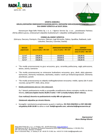 OFERTA ODBIORU: GRUZU,ODPADÓW ZMIESZANYCH BUDOWLANYCH, ODPADÓW WIELKOGABARYTOWYCH DLA GMINY GÓRZYCA od 18.07.2016r. Konsorcjum Ragn-Sells Polska Sp. z o. o. i Agreco Service Sp. z o.o. , przedstawia Państwu ofertę odbioru gruzu, zmieszanych odpadów budowlanych i odpadów wielkogabarytowych. CENNIK dla GMINY GÓRZYCA (Górzyca, Owczary, Pamięcin, Chyrzyno, Żabczyn, Ługi Górzyckie, Żabice, Spudłów, Radówek, Laski Lubuskie, Owczary, Czarnów, Stańsk) MULDA pojemność 1,5 m3 3,0 m3 5,0 m3 GRUZ cena zł netto + 8% VAT ZMIESZANE BUDOWLANE cena zł netto + 8% VAT 120,00 ZŁ 120,00 ZŁ 150,00 ZŁ 120,00 ZŁ 120,00 ZŁ 150,00 ZŁ ODPADY WIELKOGABARYTOWE cena zł netto + 8% VAT 120,00 ZŁ 120,00 ZŁ 150,00 ZŁ • *Do muldy przeznaczonej na gruz wrzucamy: gruz, ceramikę potłuczoną, cegły pokruszone, beton, ziemia, kamienie • *Do muldy przeznaczonej na zmieszane budowlane wrzucamy: gruz, deski, płyty gipsowokartonowe, elementy metalowe, dachówka, wiadra i worki po farbach/zaprawach, elementy plastikowe, panele • *Do muldy przeznaczonej na odpady wielkogabarytowe wrzucamy: meble, opony (do 4 sztuk rocznie), sprzęt RTV i AGD, okna, drzwi • Mulda podstawiana jest na 7 dni roboczych. Po 7 dniach podstawienia muldy w przypadku przedłużenia okresu wynajmu muldy ze strony Klienta, doliczana będzie kwota 20,00 zł netto + VAT za każdy kolejny dzień roboczy. Czas realizacji zlecenia na podstawienie muldy 48h od zgłoszenia. Załadunek odpadów po stronie klienta. • Szczegóły i zamówienia przyjmowane są pod nr telefonu: 95-7615-950/954 lub 957-283-000 od godziny 8:00-16:00 na adres e-mail: [email protected], [email protected] Zapraszamy! Biuro Obsługi Klienta Ragn-Sells Polska Sp. z o.o., ul. Postępu 15C, 02-676 Warszawa, www.ragnsells.pl Sąd Rejonowy dla M. St. Warszawy XII Wydział Gospodarczy KRS 42887,Kapitał zakładowy: 2.150.000,-PLN, NIP: 527-23-53-258, REGON: 017356092 Biuro w Gorzowie Wlkp., ul. Garbary 6, tel: +48 95 76 15 950, fax: +48 95 76 15 959 , [email protected]