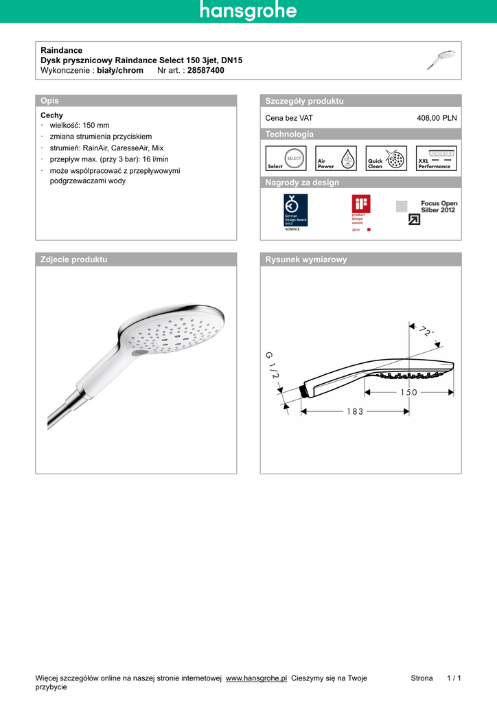 Raindance Dysk prysznicowy Raindance Select 150 3jet, DN15 Wykonczenie : biały/chrom___Nr art. : 28587400 Opis Szczegóły produktu Cechy · wielkość: 150 mm Cena bez VAT · zmiana strumienia przyciskiem 408,00-PLN Technologia · strumień: RainAir, CaresseAir, Mix · przepływ max. (przy 3 bar): 16 l/min · może wspólpracować z przepływowymi podgrzewaczami wody Nagrody za design Zdjecie produktu Rysunek wymiarowy Więcej szczegółów online na naszej stronie internetowej_www.hansgrohe.pl_Cieszymy się na Twoje przybycie Strona 1/1