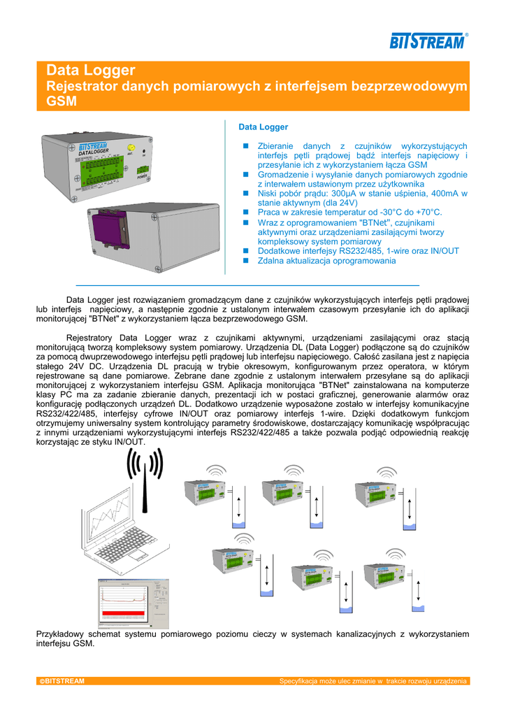 Data Logger Rejestrator danych pomiarowych z interfejsem bezprzewodowym GSM Data Logger Zbieranie danych z czujników wykorzystujących interfejs pętli prądowej bądź interfejs napięciowy i przesyłanie ich z wykorzystaniem łącza GSM Gromadzenie i wysyłanie danych pomiarowych zgodnie z interwałem ustawionym przez użytkownika Niski pobór prądu: 300µA w stanie uśpienia, 400mA w stanie aktywnym (dla 24V) Praca w zakresie temperatur od -30°C do +70°C. Wraz z oprogramowaniem "BTNet", czujnikami aktywnymi oraz urządzeniami zasilającymi tworzy kompleksowy system pomiarowy Dodatkowe interfejsy RS232/485, 1-wire oraz IN/OUT Zdalna aktualizacja oprogramowania Data Logger jest rozwiązaniem gromadzącym dane z czujników wykorzystujących interfejs pętli prądowej lub interfejs napięciowy, a następnie zgodnie z ustalonym interwałem czasowym przesyłanie ich do aplikacji monitorującej "BTNet" z wykorzystaniem łącza bezprzewodowego GSM. Rejestratory Data Logger wraz z czujnikami aktywnymi, urządzeniami zasilającymi oraz stacją monitorującą tworzą kompleksowy system pomiarowy. Urządzenia DL (Data Logger) podłączone są do czujników za pomocą dwuprzewodowego interfejsu pętli prądowej lub interfejsu napięciowego. Całość zasilana jest z napięcia stałego 24V DC. Urządzenia DL pracują w trybie okresowym, konfigurowanym przez operatora, w którym rejestrowane są dane pomiarowe. Zebrane dane zgodnie z ustalonym interwałem przesyłane są do aplikacji monitorującej z wykorzystaniem interfejsu GSM. Aplikacja monitorująca "BTNet" zainstalowana na komputerze klasy PC ma za zadanie zbieranie danych, prezentacji ich w postaci graficznej, generowanie alarmów oraz konfigurację podłączonych urządzeń DL. Dodatkowo urządzenie wyposażone zostało w interfejsy komunikacyjne RS232/422/485, interfejsy cyfrowe IN/OUT oraz pomiarowy interfejs 1-wire. Dzięki dodatkowym funkcjom otrzymujemy uniwersalny system kontrolujący parametry środowiskowe, dostarczający komunikację współpracując z innymi urządzeniami wykorzystującymi interfejs RS232/422/485 a także pozwala podjąć odpowiednią reakcję korzystając ze styku IN/OUT. Przykładowy schemat systemu pomiarowego poziomu cieczy w systemach kanalizacyjnych z wykorzystaniem interfejsu GSM. BITSTREAM Specyfikacja może ulec zmianie w trakcie rozwoju urządzenia Rejestrator zapewnia oszczędność energii (praca z wykorzystaniem akumulatorów zasilających) poprzez realizację pomiarów w odstępach wyznaczonych przez użytkownika. Pobór prądów przez rejestrator Data Logger waha się od 300µA w stanie uśpienia do 400 mA w stanie alarmowym (dla 24V). Zarządzanie urządzeniem możliwe jest zdalnie za pomocą serwera WWW oraz aplikację "BTNet". PARAMETRY Interfejs pomiarowy Interfejs komunikacyjny Interfejs pętli prądowej (4-20mA) lub interfejs napięciowy (0-24V) Złącze śrubowe Zarządzanie GSM - GPRS, WCDMA Zasilanie Zdalne: poprzez IP (serwer WWW) Możliwość zdalnej aktualizacji oprogramowania Zakres napięć zasilania: 9-26V DC Złącze śrubowe Pobór prądu: - stan uśpienia: 300µA - stan aktywny: 400mA Wymiary Obudowa 103x230x53mm Waga do 1kg BITSTREAM Sp. z o.o. ul. Mełgiewska 7/9, 20-209 Lublin, Polska Tel. +48 81 743 86 43, Fax +48 81 442 02 98 [email protected] www.bitstream.com.pl BITSTREAM Specyfikacja może ulec zmianie w trakcie rozwoju urządzenia