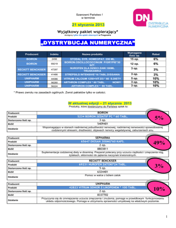 Szanowni Państwo ! w terminie 21 stycznia 2013 Wyjątkowy pakiet wspierający* dostępny tylko dla aptek obecnych w Programie „DYSTRYBUCJA NUMERYCZNA” Wymagana ilość op. Rabat STODAL SYR. HOMEOPAT. 200 ML BOIRON.OSCILLOCOCCINUM P/GRYPIE*30 SZT. NUROFEN DLA DZIECI ZAW.100ML TRUSKAWKA STREPSILS INTENSIVE*16 TABL.D/SSANIA 15 op. 6% 12 op. 6% 3 op. 3% 3 op. VITRUM CALCIUM 1250+VIT.D3 * 60 S.DIETY ARTHRON COMPLEX * 60 TABL. NOWY ARTHRON COMPLEX * 90 TABL. 5 op. 3 op. 3 op. 3% 10% 10% 10% Producent Indeks Nazwa produktu BOIRON 2456 BOIRON 69219 RECKITT BENCKISER 47297 RECKITT BENCKISER 41486 UNIPHARM UNIPHARM UNIPHARM 44086 56280 56224 * Prawo zwrotu na zasadach ogólnych. Zwrot pakietów tylko w całości. W aktualnej edycji – 21 stycznia 2013 Produkty, które dostarczymy do Państwa aptek to: Producent Produkt Dostarczona Ilość op. BLOZ Działanie Producent Produkt Dostarczona Ilość op. BLOZ Działanie Producent Produkt Dostarczona Ilość op. BLOZ Działanie Producent Produkt Dostarczona Ilość op. BLOZ Działanie BOIRON 5234 BOIRON.SEDATIF PC * 60 TABL. 3 op. 5409401 5% Wspomagająco w stanach nadmiernej pobudliwości nerwowej, nadmiernej nerwowości spowodowanej codziennymi stresami, drażliwości, objawach nerwicy wegetatywnej, zaburzeniach snu. SEPHARMA 65647 DIOSAN 300MG*60 KAPS. 2 op. 8803811 49% Suplementacja codziennej diety w diosminę. Preparat polecany przy uczuciu ciężkości i zmęczenia nóg, żylakach, skłonności do pękania naczynek krwionośnych. RECKITT BENCKISER 69231 NUROFEN ZATOKI*24 TABL. 5 op. 6324401 3% Pomoc w walce z bólem zatok UNIPHARM 42823 VITRUM SENIOR Z LIKOPENEM * 100 TABL. 2 op. 8337702 10% Przyczynia się do zmniejszenia uczucia zmęczenia i znużenia, pomaga w prawidłowym funkcjonowaniu układu odpornościowego. Pomaga w utrzymaniu sprawności umysłowej na właściwym poziomie. 1