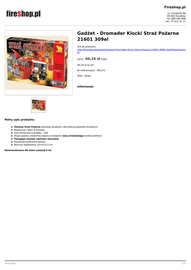 Fireshop.pl ul. Traugutta 9A 49-200 Grodków tel: 888 444 998 fax: 77 415 37 11 Gadżet - Dromader Klocki Straż Pożarna 21601 309el link do produktu: http://fireshop.pl/zabawki/Gadzet-Dromader-Klocki-Straz-Pozarna-21601-309el.html?download.p df Cena: 40,24 zł netto 40,24 zł za szt. Nr referencyjny: 091171 Stan: Nowy Informacje: Pełny opis produktu Zestawy Straż Pożarna pozwalają zbudować całą kolekcję pojazdów strażackich Bezpieczne i łatwe w montażu Ilość elementów w pudełku – 309 Długie godziny znakomitej zabawy w składanie wozu strażackiego średniej wielkości Pomagają rozwijać zdolności manualne Poszerzają wyobraźnię dziecka Wymiary opakowania: 35×25×5,5 cm Rekomendowana dla dzieci powyżej 6 lat. 8-03-2017 1/1