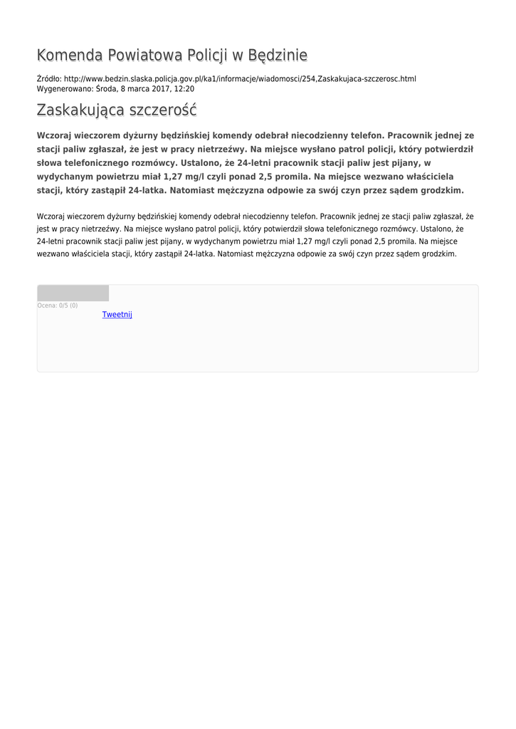 Komenda Powiatowa Policji w Będzinie Źródło: http://www.bedzin.slaska.policja.gov.pl/ka1/informacje/wiadomosci/254,Zaskakujaca-szczerosc.html Wygenerowano: Środa, 8 marca 2017, 12:20 Zaskakująca szczerość Wczoraj wieczorem dyżurny będzińskiej komendy odebrał niecodzienny telefon. Pracownik jednej ze stacji paliw zgłaszał, że jest w pracy nietrzeźwy. Na miejsce wysłano patrol policji, który potwierdził słowa telefonicznego rozmówcy. Ustalono, że 24-letni pracownik stacji paliw jest pijany, w wydychanym powietrzu miał 1,27 mg/l czyli ponad 2,5 promila. Na miejsce wezwano właściciela stacji, który zastąpił 24-latka. Natomiast mężczyzna odpowie za swój czyn przez sądem grodzkim. Wczoraj wieczorem dyżurny będzińskiej komendy odebrał niecodzienny telefon. Pracownik jednej ze stacji paliw zgłaszał, że jest w pracy nietrzeźwy. Na miejsce wysłano patrol policji, który potwierdził słowa telefonicznego rozmówcy. Ustalono, że 24-letni pracownik stacji paliw jest pijany, w wydychanym powietrzu miał 1,27 mg/l czyli ponad 2,5 promila. Na miejsce wezwano właściciela stacji, który zastąpił 24-latka. Natomiast mężczyzna odpowie za swój czyn przez sądem grodzkim. Ocena: 0/5 (0) Tweetnij