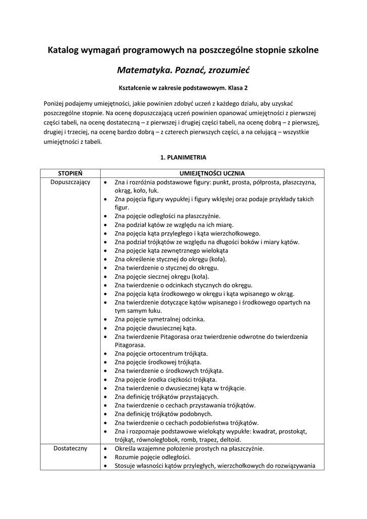 Katalog wymagań programowych na poszczególne stopnie szkolne Matematyka. Poznać, zrozumieć Kształcenie w zakresie podstawowym. Klasa 2 Poniżej podajemy umiejętności, jakie powinien zdobyć uczeń z każdego działu, aby uzyskać poszczególne stopnie. Na ocenę dopuszczającą uczeń powinien opanować umiejętności z pierwszej części tabeli, na ocenę dostateczną – z pierwszej i drugiej części tabeli, na ocenę dobrą – z pierwszej, drugiej i trzeciej, na ocenę bardzo dobrą – z czterech pierwszych części, a na celującą – wszystkie umiejętności z tabeli. 1. PLANIMETRIA STOPIEŃ Dopuszczający Dostateczny UMIEJĘTNOŚCI UCZNIA Zna i rozróżnia podstawowe figury: punkt, prosta, półprosta, płaszczyzna, okrąg, koło, łuk. Zna pojęcia figury wypukłej i figury wklęsłej oraz podaje przykłady takich figur. Zna pojęcie odległości na płaszczyźnie. Zna podział kątów ze względu na ich miarę. Zna pojęcia kąta przyległego i kąta wierzchołkowego. Zna podział trójkątów ze względu na długości boków i miary kątów. Zna pojęcie kąta zewnętrznego wielokąta Zna określenie stycznej do okręgu (koła). Zna twierdzenie o stycznej do okręgu. Zna pojęcie siecznej okręgu (koła). Zna twierdzenie o odcinkach stycznych do okręgu. Zna pojęcia kąta środkowego w okręgu i kąta wpisanego w okrąg. Zna twierdzenie dotyczące kątów wpisanego i środkowego opartych na tym samym łuku. Zna pojęcie symetralnej odcinka. Zna pojęcie dwusiecznej kąta. Zna twierdzenie Pitagorasa oraz twierdzenie odwrotne do twierdzenia Pitagorasa. Zna pojęcie ortocentrum trójkąta. Zna pojęcie środkowej trójkąta. Zna twierdzenie o środkowych trójkąta. Zna pojęcie środka ciężkości trójkąta. Zna twierdzenie o dwusiecznej kąta w trójkącie. Zna definicję trójkątów przystających. Zna twierdzenie o cechach przystawania trójkątów. Zna definicję trójkątów podobnych. Zna twierdzenie o cechach podobieństwa trójkątów. Zna i rozpoznaje podstawowe wielokąty wypukłe: kwadrat, prostokąt, trójkąt, równoległobok, romb, trapez, deltoid. Określa wzajemne położenie prostych na płaszczyźnie. Rozumie pojęcie odległości. Stosuje własności kątów przyległych, wierzchołkowych do rozwiązywania Dobry Bardzo dobry prostych zadań. Rozpoznaje i nazywa kąty powstałe w wyniku przecięcia się dwóch prostych równoległych trzecią prostą. Konstruuje styczną do okręgu przechodzącą przez punkt leżący na okręgu oraz przez punkt leżący poza okręgiem. Wykorzystuje twierdzenie o stycznej do okręgu do rozwiązywania prostych zadań. Stosuje do rozwiązywania prostych zadań twierdzenie dotyczące kątów wpisanego i środkowego opartych na tym samym łuku. Konstruuje symetralną odcinka. Wyznacza środek okręgu opisanego na trójkącie. Konstruuje dwusieczną kąta. Konstruuje okrąg opisany na trójkącie. Konstruuje okrąg wpisany w trójkąt. Wyznacza środek okręgu wpisanego w trójkąt. Rozpoznaje trójkąty przystające. Rozpoznaje trójkąty podobne. Poprawnie zapisuje relacje między podstawowymi figurami na płaszczyźnie. Poprawnie wyznacza sumę, różnicę i część wspólną figur na płaszczyźnie. Bada współliniowość punktów. Wykorzystuje wiedzę o kątach powstałych w wyniku przecięcia dwóch prostych równoległych trzecią prostą w rozwiązywaniu zadań. Bada wzajemne położenie prostej i okręgu. Określa wzajemne położenie dwóch okręgów w zależności od odległości środków tych okręgów i długości ich promieni. Bada warunki, jakie muszą być spełnione, aby okręgi były przecinające się albo styczne: zewnętrznie lub wewnętrznie. Uzasadnia, że suma miar kątów wewnętrznych w trójkącie jest równa 180. Wykorzystuje pojęcie kąta zewnętrznego wielokąta w zadaniach. Stosuje twierdzenie o odcinkach stycznych do okręgu do rozwiązywania zadań. Stosuje twierdzenie o odcinku łączącym środki ramion trójkąta w różnych zadaniach. Stosuje twierdzenie o środkowych trójkąta do rozwiązywania zadań. Wykorzystuje wzór na promień okręgu wpisanego w trójkąt prostokątny w zależności od długości boków tego trójkąta. Stosuje w zadaniach wzór na pole trójkąta w zależności od jego obwodu i promienia okręgu wpisanego w trójkąt. Wykorzystuje poznane twierdzenia do rozwiązywania typowych problemów matematycznych. Wykorzystuje związek między środkiem okręgu opisanego na trójkącie równobocznym i środkiem okręgu wpisanego w ten trójkąt. Oblicza obwody i pola znanych wielokątów wypukłych. Rozwiązuje zadania złożone, stosując nierówność trójkąta. Potrafi uzasadnić, że suma kątów zewnętrznych w wielokącie jest stała. Uzasadnia poprawność konstrukcji stycznych do okręgu. Potrafi uzasadnić wzajemne położenie dwóch okręgów. Potrafi udowodnić twierdzenie dotyczące kąta wpisanego i kąta Celujący środkowego opartych na tym samym łuku. Oblicza długość promienia okręgu opisanego na trójkątach: równoramiennym, równobocznym, prostokątnym. Potrafi udowodnić twierdzenie Pitagorasa. Potrafi ocenić, czy trójkąt jest prostokątny, ostrokątny czy rozwartokątny, oraz to uzasadnić. Uzasadnia, że w trójkącie środkowe dzielą się w stosunku 1 : 2. Uzasadnia przystawanie trójkątów, korzystając z cech przystawania trójkątów. Uzasadnia podobieństwo trójkątów, stosując cechy podobieństwa trójkątów. Uzasadnia, że w trójkącie prostokątnym długość wysokości jest średnią geometryczną długości odcinków, na które ta wysokość dzieli przeciwprostokątną. Korzysta z własności trójkątów podobnych przy rozwiązywaniu zadań (także w kontekstach praktycznych). Oblicza długości boków, przekątnych, korzystając z poznanych twierdzeń oraz funkcji trygonometrycznych kątów o miarach od 0 do 180. Korzysta z własności kąta środkowego w okręgu i kąta wpisanego w okrąg w celu wyznaczenia miar k