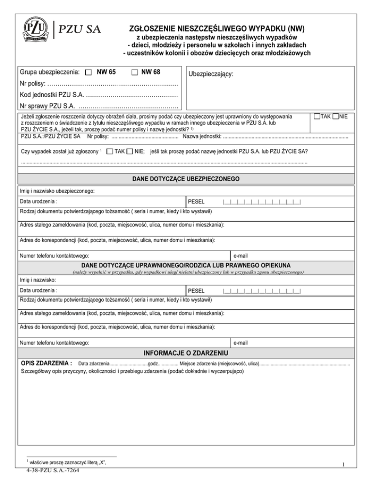 ZGŁOSZENIE NIESZCZĘŚLIWEGO WYPADKU (NW) z ubezpieczenia następstw nieszczęśliwych wypadków - dzieci, młodzieŜy i personelu w szkołach i innych zakładach - uczestników kolonii i obozów dziecięcych oraz młodzieŜowych Grupa ubezpieczenia: NW 65 NW 68 Ubezpieczający: Nr polisy: ………………………………………………………. Kod jednostki PZU S.A. ……………………………………… Nr sprawy PZU S.A. …………………………………………. JeŜeli zgłoszenie roszczenia dotyczy obraŜeń ciała, prosimy podać czy ubezpieczony jest uprawniony do występowania TAK NIE z roszczeniem o świadczenie z tytułu nieszczęśliwego wypadku w ramach innego ubezpieczenia w PZU S.A. lub PZU śYCIE S.A., jeŜeli tak, proszę podać numer polisy i nazwę jednostki? 1) PZU S.A.:/PZU śYCIE SA Nr polisy: ............................................... Nazwa jednostki: ........................................................................................ Czy wypadek został juŜ zgłoszony 1 TAK NIE; jeśli tak proszę podać nazwę jednostki PZU S.A. lub PZU śYCIE SA? ......................................................................................................................................................................................................... DANE DOTYCZĄCE UBEZPIECZONEGO Imię i nazwisko ubezpieczonego: Data urodzenia : PESEL |__|__|__|__|__|__|__|__|__|__|__| Rodzaj dokumentu potwierdzającego toŜsamość ( seria i numer, kiedy i kto wystawił) Adres stałego zameldowania (kod, poczta, miejscowość, ulica, numer domu i mieszkania): Adres do korespondencji (kod, poczta, miejscowość, ulica, numer domu i mieszkania): Numer telefonu kontaktowego: e-mail DANE DOTYCZĄCE UPRAWNIONEGO/RODZICA LUB PRAWNEGO OPIEKUNA (naleŜy wypełnić w przypadku, gdy wypadkowi uległ nieletni ubezpieczony lub w przypadku zgonu ubezpieczonego) Imię i nazwisko: Data urodzenia : PESEL |__|__|__|__|__|__|__|__|__|__|__| Rodzaj dokumentu potwierdzającego toŜsamość ( seria i numer, kiedy i kto wystawił) Adres stałego zameldowania (kod, poczta, miejscowość, ulica, numer domu i mieszkania): Adres do korespondencji (kod, poczta, miejscowość, ulica, numer domu i mieszkania): Numer telefonu kontaktowego: e-mail INFORMACJE O ZDARZENIU OPIS ZDARZENIA : Data zdarzenia..............................godz................ Miejsce zdarzenia (miejscowość, ulica)....................................................................... Szczegółowy opis przyczyny, okoliczności i przebiegu zdarzenia (podać dokładnie i wyczerpująco) 1 właściwe proszę zaznaczyć literą „X”, 4-38-PZU S.A.-7264 1 POWIADOMIENIE POLICJI : 1. Data i godzina powiadomienia policji o zdarzeniu , .................................................................................................................................................................................. 2. Nazwa i adres jednostki policji ............................................................................................................................................................................... 3. Czy w chwili wypadku ubezpieczony był w stanie po uŜyciu alkoholu, w stanie nietrzeźwości albo po uŜyciu narkotyków ? Tak Nie 4. Numer karty rowerowej /motorowerowej/prawa jazdy …………………………………………………………………………… POMOC MEDYCZNA 1.Kto i gdzie udzielił poszkodowanemu pierwszej pomocy lekarskiej bezpośrednio po wypadku? ………………..……………................................. 2.Podać nazwę i adres zakładu leczniczego, w którym ubezpieczony leczył się po wypadku: ………………………………………………….……… …………………………………………………………………………………………………………………………………………………………………….. 3.Czy narząd(y) opisywany w punkcie „Opis zdarzenia” był(y) uszkodzone w wyniku wypadku lub choroby przed zajściem zdarzenia TAK Nie 4. Czy leczenie zostało zakończone(z uwzględnieniem rehabilitacji 1) TAK NIE data zakończenia leczenia: …………………… WYPEŁNIA UBEZPIECZAJĄCY Oświadczam, Ŝe ubezpieczony jest objęty zbiorowym ubezpieczeniem NW na podstawie polisy Nr ………………………………………………. pod poz. Wykazu imiennego ………………. Według wariantu ………………… na sumę ubezpieczenia ………………………………………… .................................................................................... …………............................................................. (miejscowość, data) (podpis ubezpieczającego – pracownik potwierdz ubezp. ) ZAŁĄCZNIKI 1) dokument toŜsamości do wglądu dokument uprawniający do prowadzenia pojazdu dokumentacja z leczenia (karta informacyjna z pobytu w szpitalu, z pogotowia ratunkowego, historia choroby z przychodni itp.) inne (proszę wymienić jakie): ................................................................................................................................................................................................................. SPOSÓB WYPŁATY NaleŜne odszkodowanie/świadczenie1 : proszę przesłać przekazem pocztowym proszę przelać na konto w banku ................................................................... Oddział ......................................................................................... nazwa rachunku ................................................................ numer rachunku ....................................................................................................... OŚWIADCZENIE Nazwisko ubezpieczonego:……………………………………………. Imię ubezpieczonego ……………………….. 1. W przypadku wystąpienia zdarzeń objętych odpowiedzialnością PZU S.A. i/lub PZU śycie SA u