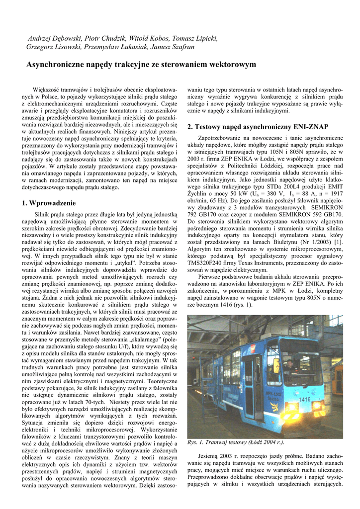 Andrzej Dębowski, Piotr Chudzik, Witold Kobos, Tomasz Lipicki, Grzegorz Lisowski, Przemysław Łukasiak, Janusz Szafran Asynchroniczne napędy trakcyjne ze sterowaniem wektorowym Większość tramwajów i trolejbusów obecnie eksploatowanych w Polsce, to pojazdy wykorzystujące silniki prądu stałego z elektromechanicznymi urządzeniami rozruchowymi. Częste awarie i przeglądy eksploatacyjne komutatora i rozruszników zmuszają przedsiębiorstwa komunikacji miejskiej do poszukiwania rozwiązań bardziej niezawodnych, ale i mieszczących się w aktualnych realiach finansowych. Niniejszy artykuł prezentuje nowoczesny napęd asynchroniczny spełniający te kryteria, przeznaczony do wykorzystania przy modernizacji tramwajów i trolejbusów pracujących dotychczas z silnikami prądu stałego i nadający się do zastosowania także w nowych konstrukcjach pojazdów. W artykule zostały przedstawione etapy powstawania omawianego napędu i zaprezentowane pojazdy, w których, w ramach modernizacji, zamontowano ten napęd na miejsce dotychczasowego napędu prądu stałego. 1. Wprowadzenie Silnik prądu stałego przez długie lata był jedyną jednostką napędową umożliwiającą płynne sterowanie momentem w szerokim zakresie prędkości obrotowej. Zdecydowanie bardziej niezawodny i o wiele prostszy konstrukcyjnie silnik indukcyjny nadawał się tylko do zastosowań, w których mógł pracować z prędkościami niewiele odbiegającymi od prędkości znamionowej. W innych przypadkach silnik tego typu nie był w stanie rozwijać odpowiedniego momentu i „utykał”. Potrzeba stosowania silników indukcyjnych doprowadziła wprawdzie do opracowania pewnych metod umożliwiających rozruch czy zmianę prędkości znamionowej, np. poprzez zmianę dodatkowej rezystancji wirnika albo zmianę sposobu połączeń uzwojeń stojana. Żadna z nich jednak nie pozwoliła silnikowi indukcyjnemu skutecznie konkurować z silnikiem prądu stałego w zastosowaniach trakcyjnych, w których silnik musi pracować ze znacznym momentem w całym zakresie prędkości oraz poprawnie zachowywać się podczas nagłych zmian prędkości, momentu i warunków zasilania. Nawet bardziej zaawansowane, często stosowane w przemyśle metody sterowania „skalarnego” (polegające na zachowaniu stałego stosunku U/f), które wywodzą się z opisu modelu silnika dla stanów ustalonych, nie mogły sprostać wymaganiom stawianym przed napędem trakcyjnym. W tak trudnych warunkach pracy potrzebne jest sterowanie silnika umożliwiające pełną kontrolę nad wszystkimi zachodzącymi w nim zjawiskami elektrycznymi i magnetycznymi. Teoretyczne podstawy pokazujące, że silnik indukcyjny zasilany z falownika nie ustępuje dynamicznie silnikowi prądu stałego, zostały opracowane już w latach 70-tych. Niestety przez wiele lat nie było efektywnych narzędzi umożliwiających realizację skomplikowanych algorytmów wynikających z tych rozważań. Sytuacja zmieniła się dopiero dzięki rozwojowi energoelektroniki i techniki mikroprocesorowej. Wykorzystanie falowników z kluczami tranzystorowymi pozwoliło kontrolować z dużą dokładnością chwilowe wartości prądów i napięć a użycie mikroprocesorów umożliwiło wykonywanie złożonych obliczeń w czasie rzeczywistym. Znany z teorii maszyn elektrycznych opis ich dynamiki z użyciem tzw. wektorów przestrzennych prądów, napięć i strumieni magnetycznych posłużył do opracowania nowoczesnych algorytmów sterowania nazywanych sterowaniem wektorowym. Dzięki zastoso- waniu tego typu sterowania w ostatnich latach napęd asynchroniczny wyraźnie wygrywa konkurencję z silnikiem prądu stałego i nowe pojazdy trakcyjne wyposażane są prawie wyłącznie w napędy z silnikami indukcyjnymi. 2. Testowy napęd asynchroniczny ENI-ZNAP Zapotrzebowanie na nowoczesne i tanie asynchroniczne układy napędowe, które mógłby zastąpić napędy prądu stałego w istniejących tramwajach typu 105N i 805N sprawiło, że w 2003 r. firma ZEP ENIKA w Łodzi, we współpracy z zespołem specjalistów z Politechniki Łódzkiej, rozpoczęła prace nad opracowaniem własnego rozwiązania układu sterowania silnikiem indukcyjnym. Jako jednostki napędowej użyto klatkowego silnika trakcyjnego typu STDa 200L4 produkcji EMIT Żychlin o mocy 50 kW (Un = 380 V, In = 88 A, n = 1917 obr/min, 65 Hz). Do jego zasilania posłużył falownik napięciowy zbudowany z 3 modułów tranzystorowych SEMIKRON 792 GB170 oraz czoper z modułem SEMIKRON 592 GB170. Do sterowania silnikiem wykorzystano wektorowy algorytm pośredniego sterowania momentu i strumienia wirnika silnika indukcyjnego oparty na koncepcji stymulatora stanu, który został przedstawiony na łamach Biuletynu (Nr 1/2003) [1]. Algorytm ten zrealizowano w systemie mikroprocesorowym, którego podstawą był specjalistyczny procesor sygnałowy TMS320F240 firmy Texas Instruments, przeznaczony do zastosowań w napędzie elektrycznym. Pierwsze podstawowe badania układu sterowania przeprowadzono na stanowisku laboratoryjnym w ZEP ENIKA. Po ich zakończeniu, w porozumieniu z MPK w Łodzi, kompletny napęd zainstalowano w wagonie testowym typu 805N o numerze bocznym 1416 (rys. 1). Rys. 1. Tramwaj testowy (Łódź 2004 r.). Jesienią 2003 r. rozpoczęto jazdy próbne. Badano zachowanie się napędu tramwaju we wszystkich możliwych stanach pracy, mogących mieć miejsce w warunkach ruchu ulicznego. Przeprowadzono dokładne obserwacje prądów i napięć występujących w silniku i wszystkich urządzeniach sterujących. wartość strumienia magnetycznego w silniku odniesioną do jego wartości znamionowej . M/Mn,Ψ/Ψn Próby przeprowadzone na tramwaju testowym pozwoliły w sposób doświadczalny przebadać zjawiska występujące w układzie napędowym, które były dotąd znane autorom jedynie z teoretycznych obliczeń popartych badaniami symulacyjnymi. 2,2 2,0 1,8 1,6 1,4 1,2 1,0 0,8 0,6 0,4 0,2 0,0 dopuszczalny moment zadany wartość strumienia magnetycznego
