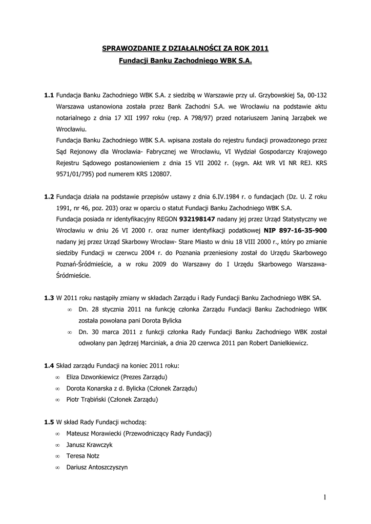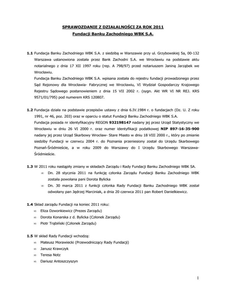 SPRAWOZDANIE Z DZIAŁALNOŚCI ZA ROK 2011 Fundacji Banku Zachodniego WBK S.A. 1.1 Fundacja Banku Zachodniego WBK S.A. z siedzibą w Warszawie przy ul. Grzybowskiej 5a, 00-132 Warszawa ustanowiona została przez Bank Zachodni S.A. we Wrocławiu na podstawie aktu notarialnego z dnia 17 XII 1997 roku (rep. A 798/97) przed notariuszem Janiną Jarząbek we Wrocławiu. Fundacja Banku Zachodniego WBK S.A. wpisana została do rejestru fundacji prowadzonego przez Sąd Rejonowy dla Wrocławia- Fabrycznej we Wrocławiu, VI Wydział Gospodarczy Krajowego Rejestru Sądowego postanowieniem z dnia 15 VII 2002 r. (sygn. Akt WR VI NR REJ. KRS 9571/01/795) pod numerem KRS 120807. 1.2 Fundacja działa na podstawie przepisów ustawy z dnia 6.IV.1984 r. o fundacjach (Dz. U. Z roku 1991, nr 46, poz. 203) oraz w oparciu o statut Fundacji Banku Zachodniego WBK S.A. Fundacja posiada nr identyfikacyjny REGON 932198147 nadany jej przez Urząd Statystyczny we Wrocławiu w dniu 26 VI 2000 r. oraz numer identyfikacji podatkowej NIP 897-16-35-900 nadany jej przez Urząd Skarbowy Wrocław- Stare Miasto w dniu 18 VIII 2000 r., który po zmianie siedziby Fundacji w czerwcu 2004 r. do Poznania przeniesiony został do Urzędu Skarbowego Poznań-Śródmieście, a w roku 2009 do Warszawy do I Urzędu Skarbowego WarszawaŚródmieście. 1.3 W 2011 roku nastąpiły zmiany w składach Zarządu i Rady Fundacji Banku Zachodniego WBK SA. • Dn. 28 stycznia 2011 na funkcję członka Zarządu Fundacji Banku Zachodniego WBK została powołana pani Dorota Bylicka • Dn. 30 marca 2011 z funkcji członka Rady Fundacji Banku Zachodniego WBK został odwołany pan Jędrzej Marciniak, a dnia 20 czerwca 2011 pan Robert Danielkiewicz. 1.4 Skład zarządu Fundacji na koniec 2011 roku: • Eliza Dzwonkiewicz (Prezes Zarządu) • Dorota Konarska z d. Bylicka (Członek Zarządu) • Piotr Trąbiński (Członek Zarządu) 1.5 W skład Rady Fundacji wchodzą: • Mateusz Morawiecki (Przewodniczący Rady Fundacji) • Janusz Krawczyk • Teresa Notz • Dariusz Antoszczyszyn 1 1.6 Główne cele statutowe Fundacji Banku Zachodniego WBK S.A. to popieranie następujących dziedzin: - ochrona zdrowia i pomoc społeczna, - pomoc ofiarom klęsk żywiołowych, - oświata i wychowanie, - kultura, - propagowanie kultury fizycznej i sportu, - nauka i technika, - działalność charytatywno- opiekuńcza, - kult religijny, - bezpieczeństwo publiczne, - ochrona środowiska, - cele dobroczynne - pomocy społecznej, w tym pomoc dzieciom, rodzinom i osobom w trudnej sytuacji życiowej oraz wyrównywanie szans tych osób i dzieci. 2 Fundacja Banku Zachodniego WBK S.A. realizowała w 2011 roku cele statutowe w ramach niżej wymienionych projektów: 2.1 Program grantowy „Bank Dziecięcych Uśmiechów” W minionym roku Fundacja kontynuowała program grantowy „Bank Dziecięcych Uśmiechów” (utworzony w 2004 roku) dla organizacji pozarządowych, szkół, przedszkoli, świetlic środowiskowych oraz organizacji samorządu terytorialnego, w ramach którego udzielono wsparcia finansowego 234 podmiotom. Celem programu jest wsparcie dzieci pochodzących z rodzin ubogich, często dysfunkcyjnych, w których dzieci pozbawione są dostatecznej troski rodzicielskiej. Na realizację programu w 2011 roku przeznaczono kwotę 742 182,71 złotych. 2.2 Program grantowy „Bank Ambitnej Młodzieży” Fundacja inspiruje i zachęca do aktywności społecznej i obywatelskiej młodzież, a także wpiera jej aspiracje naukowe poprzez program grantowy „Bank Ambitnej Młodzieży”. Program ma uczyć określania potrzeb lokalnych społeczności, definiowania celów, tworzenia wspólnot zadaniowych, rozwiązywania problemów i realizowania zadań na poziomie lokalnym przez młodych ludzi kształtujących swoje postawy społeczne. W ubiegłym roku na realizację programu Fundacja przeznaczyła 1 056 715,58 złotych, udzielając wsparcia 141 podmiotom. 2.3 Program dofinansowany ze środków Unii Europejskiej „Inforamicus – zaprzyjaźnij się z informatyką i zdobywaj świat” 2 W roku 2010 i w 2011 na terenie województwa małopolskiego Fundacja realizowała program „Inforamicus – zaprzyjaźnij się z informatyką i zdobywaj świat” finansowany ze środków unijnych. Celem projektu było ułatwienie nowoczesnej integracji społecznej i zawodowej, grupie młodych kobiet i mężczyzn. W ramach projektu beneficjenci mogli wybrać jeden z trzech tematów szkolenia: aktywne wykorzystanie Internetu w celach marketingowych, projektowanie i budowa stron www, budowa i obsługa prostych sieci oraz obsługa serwerów komputerowych. Część wzięła także udział w dodatkowych szkoleniach z zakresu zaawansowanej obsługi programu Photoshop lub Excel. Tematy kursów konsultowane były z najwyższej klasy ekspertami, tak aby odpowiadały na potrzeby lokalnych rynków pracy. Grupa najlepszych absolwentek i absolwentów szkoleń odbyła trzymiesięczne staże zawodowe w oddziałach Banku Zachodniego WBK, w trakcie których stażyści zrealizowali 42 projekty dla klientów banku. Dwuletni projekt kończyły targi pracy, dedykowane wszystkim uczestnikom projektu, uzupełnione o cykl warsztatów tematycznych: „CV, list motywacyjny, rozmowa kwalifikacyjna. Jak skutecznie szukać pracy” oraz „Jak profesjonalnie wyglądać podczas rozmowy kwalifikacyjnej i w pracy”. W roku 2011 na realizację projektu przeznaczono 310 132,94 zł. 2.4 Liga zadaniowa z matematyki finansowej Fundacja we współpracy z Instytutem Matematyki Uniwersytetu Wrocławskiego w roku 2011 zakończyła I edycję konkursu „Liga zadaniowa z matematyki finansowej” i z początkiem nowego roku szkolnego 2011/2012 ogłosiła II edycję tego konkursu. W konkursie wzięło udział ponad 200 osób. Młodzież gimnazjalna i licealna biorąca udział w Lidze, co miesiąc w czasie całego roku szkolnego zapoznaje się z serią miniwykładów o tematyce finansowo-ekonomicznej oraz rozwiązuje zadania powiązane z tematyką wy
