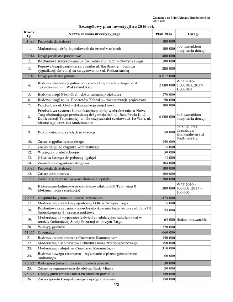 Załącznik nr 3 do Uchwały Budżetowej na 2016 rok Szczegółowy plan inwestycji na 2016 rok Rozdz. Nazwa zadania inwestycyjnego Lp. 01095 Pozostała działalność 1. Modernizacja dróg dojazdowych do gruntów rolnych 60014 Drogi publiczne powiatowe 2. Rozbudowa skrzyżowania ul. Św. Anny z ul. Grel w Nowym Targu Poprawa bezpieczeństwa na odcinku ul. Szaflarskiej - budowa 3. sygnalizacji świetlnej na skrzyżowaniu z ul. Podtatrzańską 60016 Drogi publiczne gminne 4. Budowa obwodnicy północno - wschodniej miasta - droga od Al. Tysiąclecia do ul. Waksmundzkiej 5. 6. 7. Budowa drogi Niwa-Grel - dokumentacja projektowa Budowa drogi na os. Bohaterów Tobruku - dokumentacja projektowa Przebudowa ul. Grel – dokumentacja projektowa 8. Przebudowa systemu komunikacyjnego dróg w obrębie miasta Nowy Targ obejmującego przebudowę dróg miejskich: ul. Jana Pawła II, ul. Konfederacji Tatrzańskiej, ul. Do oczyszczalni ścieków, ul. Po Wale, ul. Sikorskiego oraz. Ku Studzionkom 9. 10. 11. 12. 13. 14. 60095 15. 63003 16. Dokumentacja przyszłych inwestycji Zakup ciągnika komunalnego Zakup pługu do ciągnika komunalnego Wysięgnik wielofunkcyjny Głowica kosząca do poboczy i gałęzi Zamiatarka ciągnikowa drogowa Pozostała działalność Zakup parkometrów Zadania w zakresie upowszechniania turystyki Historyczno-kulturowo-przyrodniczy szlak wokół Tatr - etap II (dokumentacja i realizacja) 70005 Gospodarka gruntami i nieruchomościami 17. Modernizacja strzelnicy sportowej LOK w Nowym Targu Rozbudowa oraz zmiana sposobu użytkowania budynku przy ul. Jana III 18. Sobieskiego nr 4 - prace projektowe Modernizacja i wyposażenie świetlicy edukacyjno-szkoleniowej w 19. remizie Ochotniczej Straży Pożarnej w Nowym Targu 20. Wykupy gruntów 71035 Cmentarze 21. Budowa kolumbarium na Cmentarzu Komunalnym 22. Modernizacja sanitariatów i chłodni Domu Przedpogrzebowego 23. Modernizacja alejek na Cmentarzu Komunalnym Budowa nowego cmentarza – wykonanie zaplecza gospodarczosanitarnego 75022 Rady gmin (miast i miast na prawach powiatu) 25. Zakup oprogramowania do obsługi Rady Miasta 75023 Urzędy gmin (miast i miast na prawach powiatu) 26. Zakup sprzętu komputerowego i oprogramowania 24. 1/2 Plan 2016 Uwagi 100 000 100 000 pod warunkiem otrzymania dotacji 400 000 200 000 200 000 8 812 000 WPF 20162 000 000 2.000.000, 20174.000.000 170 000 90 000 100 000 6 000 000 pod warunkiem otrzymania dotacji parkingi przy Cmentarzu 50 000 Komunalnym i ul. Podhalańskiej 140 000 15 000 50 000 13 000 184 000 100 000 100 000 300 000 WPF 2016 – 300 000 300.000, 2017 – 400.000 1 474 000 15 000 74 000 65 000 Budżet obywatelski 1 320 000 660 000 150 000 150 000 310 000 50 000 30 000 30 000 150 000 150 000 75412 Ochotnicze straże pożarne 27. 75818 28. 80101 29. 30. 31. 80110 32. 85154 33. 100 000 Zakup samochodu strażackiego dla Ochotniczej Straży Pożarnej w Nowym Targu wkład własny, złożony zostanie 100 000 wniosek od dotację z UE 203 000 203 000 261 000 96 000 Budżet obywatelski 150 000 Budżet obywatelski 15 000 Budżet obywatelski 16 000 16 000 201 000 184 000 Budżet obywatelski 40. Rezerwy ogólne i celowe Rezerwa celowa inwestycyjna Szkoły podstawowe Modernizacja sali gimnastycznej w Szkole Podstawowej nr 3 Nowoczesne pracownie szkolne wspierające rozwój naszych dzieci Uzupełnienie wyposażenia Szkoły Podstawowej nr 4 Gimnazja Modernizacja monitoringu Gimnazjum Nr 1 Przeciwdziałanie alkoholizmowi Modernizacja nawierzchni boiska przy Szkole Podstawowej nr 5 Zakup stołów do tenisa stołowego do Park Miejskiego i Parku przy ul. Wojska Polskiego Doposażenie placu zabaw przy Przedszkolu nr 4 Ośrodki pomocy społecznej Zakup serwera bazy danych Ochrona powietrza atmosferycznego i klimatu Obniżenie poziomu niskiej emisji w powietrzu spowodowanej spalaniem paliw w indywidualnych źródłach ciepła na terenie Gminy Miasto Nowy Targ Oświetlenie ulic, placów i dróg Dobudowa oświetlenia ulic, placów, dróg (os. Buflak, ul. Grel) Pozostała działalność Dokumentacja przyszłych inwestycji Modernizacja i rozbudowa systemów odwodnieniowych – dokumentacja projektowa 41. Zakup nowych podestów do sceny modułowej 60 000 42. Wykonanie kotew bezpieczeństwa do zadaszenia sceny na płycie Rynku 17 000 34. 35. 85219 36. 90005 37. 90015 38. 90095 39. 92601 Obiekty sportowe Instalacja monitoringu telewizji przemysłowej na obiekcie Miejskiej 43. Hali Lodowej w Nowym Targu 44. Doposażenie ciągnika 45. Zakup odśnieżarki 2/2 10 000 7 000 30 000 30 000 400 000 400 000 135 000 135 000 365 000 100 000 188 000 263 000 200 000 55 000 8 000 dofinansowanie z WFOŚiGW