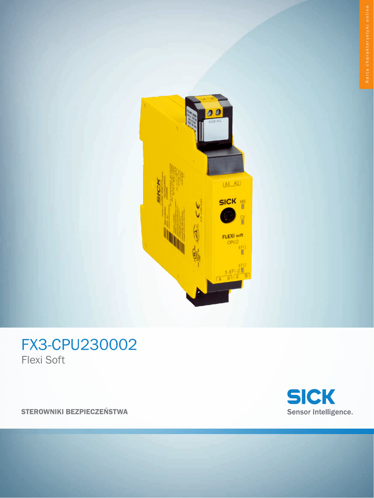 Karta charakterystyki online FX3-CPU230002 Flexi Soft STEROWNIKI BEZPIECZEŃSTWA FX3-CPU230002 | Flexi Soft STEROWNIKI BEZPIECZEŃSTWA A B C D E F H I J K L M N O P Q R S T Informacje do zamówienia Typ Nr artykułu FX3-CPU230002 1058999 Wtyk systemowy należy zamówić oddzielnie! więcej wersji urządzeń i akcesoriów www.sick.com/Flexi_Soft Szczegółowe dane techniczne Cechy Moduł Moduł główny Rodzaj konfiguracji Za pomocą oprogramowania Wskazówka Wtyk systemowy należy zamówić oddzielnie! Charakterystyka bezpieczeństwa technicznego Poziom nienaruszalności bezpieczeństwa SIL3 (IEC 61508) SILCL3 (EN 62061) Kategoria Kategoria 4 (EN ISO 13849) Poziom zapewnienia bezpieczeństwa PL e (EN ISO 13849) PFHD (średnie prawdopodobieństwo niebezpiecznej awarii na godzinę) 1,69 x 10-9 (EN ISO 13849) TM (okres użytkowania) 20 lat(a) (EN ISO 13849) Dane mechaniczne Wymiary (szer. x wys. x głęb.) 22,5 mm x 96,5 mm x 120,6 mm Masa 119 g (± 5 %) Funkcje Blokada restartu Ręczna / automatyczna (konfigurowana) Monitorowanie urządzeń zewnętrznych (EDM) ✔ Rozróżnienie człowiek/materiał (muting) ✔ Bezpieczna komunikacja urządzeń SICK za pośrednictwem EFI ✔ Bezpieczne połączenie w sieć Flexi Link ✔ Automatic Configuration Recovery (ACR) 2 ✔ SENS:CONTROL – ROZWIĄZANIA STEROWANIA BEZPIECZEŃSTWEM | SICK Karta charakterystyki online | 2016-11-17 15:29:51 Informacje mogą ulec zmianie bez powiadomienia FX3-CPU230002 | Flexi Soft STEROWNIKI BEZPIECZEŃSTWA Interfejsy Typ przyłącza Podłączenie systemu Wtyk systemowy FX3-MPL100001 Interfejs EFI Zaciski sprężynowe Liczba złączy EFI 2 Interfejs konfiguracji i diagnostyki RS-232 Dane elektryczne Klasa ochrony III (EN 61140) Rodzaj zasilania elektrycznego PELV lub SELV 1) Napięcie zasilające Uv 24 V DC (16,8 V DC ... 30 V DC) Wewnętrzny pobór mocy ≤ 2,5 W Kategoria przepięciowa II (EN 61131-2) Czas do załączenia ≤ 18 s 1) Prąd zasilacza sieciowego, który zasila moduł główny, musi być ograniczony zewnętrznie do maks. 4 A. Przez sam zasilacz lub przez bezpiecznik. Dane dotyczące otoczenia Stopień ochrony IP 20 (EN 60529) Temperatura otoczenia pracy –25 °C ... +55 °C Temperatura składowania –25 °C ... +70 °C Wilgotność powietrza 10 % ... 95 %, bez kondensacji Odporność na zakłócenia elektromagnetyczne EN 61000-6-2 Odporność na drgania 1 g, 5 Hz ... 150 Hz (EN 60068-2-6) 3 g RMS, 10 Hz ... 500 Hz (EN 60068-2-64) Odporność na wstrząsy Trwały udar 15 g, 11 ms (EN 60068-2-27) Pojedynczy udar 30 g, 11 ms (EN 60068-2-27) 2016-11-17 15:29:51 | Karta charakterystyki online Informacje mogą ulec zmianie bez powiadomienia SENS:CONTROL – ROZWIĄZANIA STEROWANIA BEZPIECZEŃSTWEM | SICK 3 FX3-CPU230002 | Flexi Soft STEROWNIKI BEZPIECZEŃSTWA Rysunek wymiarowy (Wymiary w mm) FX3-CPU1, FX3-CPU2 78 (3.07) 33.1 15.4 5.1 58 (2.28) (0.20) 109 (4.29) 93.7 (3.69) 75.3 (2.96) 75.3 (2.97) (4.50) (4.75) 114.3 19.5 (0.77) 14.8 (0.58) (1.30) (0.61) 120.6 93.3 22.5 (0.89) 8.8 20 (0.79) 20 96.5 (3.80) (0.79) (3.67) (0.34) A B C D E F H I J K L M N O P Q R S T 8.5 (0.33) ① Przybliżony obszar połączenia wtykowego Zalecane akcesoria więcej wersji urządzeń i akcesoriów www.sick.com/Flexi_Soft Krótki opis Typ Nr artykułu Głowica A: Wtyk, M8, 4 piny, prosty Głowica B: Wtyk, USB-A, prosty Przewód: PVC, nieekranowany, 2 m Do połączenia przyłącza konfiguracyjnego ze złączem USB komputera PC DSL-8U04G02M025KM1 6034574 Głowica A: Wtyk, M8, 4 piny, prosty Głowica B: Wtyk, USB-A, prosty Przewód: PVC, nieekranowany, 10 m Do połączenia przyłącza konfiguracyjnego ze złączem USB komputera PC DSL-8U04G10M025KM1 6034575 FX3-MPL100001 1047162 Złącza wtykowe i przewody Do FX3-CPU2 i FX3-CPU3, Zasilanie elektryczne systemu Flexi Soft, zapisanie konfiguracji systemu (z urządzeniami kompatybilnymi z EFI) i automatyczna konfiguracja podłączonych czujników bezpieczeństwa kompatybilnych z EFI (Automatic configuration recovery) 4 SENS:CONTROL – ROZWIĄZANIA STEROWANIA BEZPIECZEŃSTWEM | SICK Karta charakterystyki online | 2016-11-17 15:29:51 Informacje mogą ulec zmianie bez powiadomienia Karta charakterystyki online SICK W SKRÓCIE Firma SICK należy do czołowych producentów inteligentnych czujników i rozwiązań wykorzystujących czujniki do zastosowań przemysłowych. Wyjątkowa gama produktów i usług stwarza idealną podstawę dla bezpiecznego i wydajnego sterowania procesami, ochrony ludzi przed wypadkami i unikania zanieczyszczenia środowiska. Mamy szerokie doświadczenie w różnych branżach i znamy występujące w nich procesy oraz wymagania. Nasze inteligentne czujniki zapewniają klientom dokładnie to, czego im potrzeba. W centrach aplikacji w Europie, Azji i Ameryce Północnej rozwiązania systemowe są testowane i optymalizowane pod kątem potrzeb konkretnych klientów. Wszystko to sprawia, że jesteśmy niezawodnym dostawcą i partnerem w zakresie rozwoju. Naszą ofertę dopełniają kompleksowe usługi: rozwiązania SICK LifeTime Services wspierają klientów w trakcie całego cyklu użytkowania maszyny i dbają o bezpieczeństwo i produktywność. Właśnie tak rozumiemy hasło „Sensor Intelligence”. BLISKO KLIENTA NA CAŁYM ŚWIECIE: Osoby kontaktowe i pozostałe lokalizacje - www.sick.com SICK AG |Waldkirch|Niemcy |www.sick.com