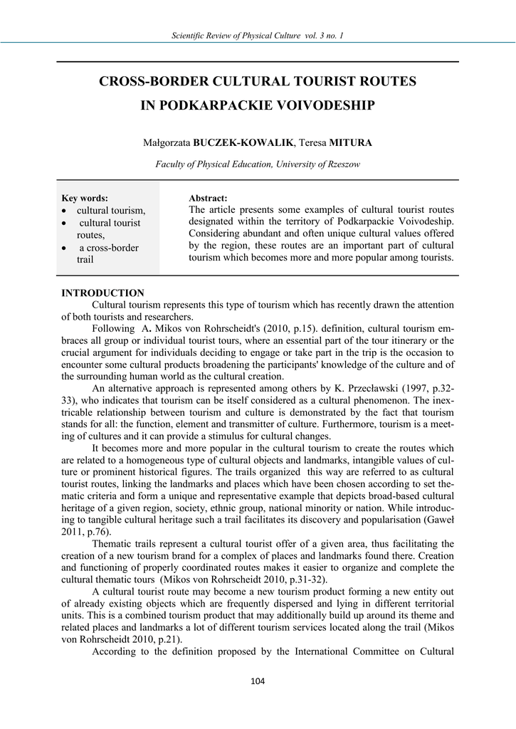 Scientific Review of Physical Culture vol. 3 no. 1 CROSS-BORDER CULTURAL TOURIST ROUTES IN PODKARPACKIE VOIVODESHIP Małgorzata BUCZEK-KOWALIK, Teresa MITURA Faculty of Physical Education, University of Rzeszow Key words:    cultural tourism, cultural tourist routes, a cross-border trail Abstract: The article presents some examples of cultural tourist routes designated within the territory of Podkarpackie Voivodeship. Considering abundant and often unique cultural values offered by the region, these routes are an important part of cultural tourism which becomes more and more popular among tourists. INTRODUCTION Cultural tourism represents this type of tourism which has recently drawn the attention of both tourists and researchers. Following A. Mikos von Rohrscheidt's (2010, p.15). definition, cultural tourism embraces all group or individual tourist tours, where an essential part of the tour itinerary or the crucial argument for individuals deciding to engage or take part in the trip is the occasion to encounter some cultural products broadening the participants' knowledge of the culture and of the surrounding human world as the cultural creation. An alternative approach is represented among others by K. Przecławski (1997, p.3233), who indicates that tourism can be itself considered as a cultural phenomenon. The inextricable relationship between tourism and culture is demonstrated by the fact that tourism stands for all: the function, element and transmitter of culture. Furthermore, tourism is a meeting of cultures and it can provide a stimulus for cultural changes. It becomes more and more popular in the cultural tourism to create the routes which are related to a homogeneous type of cultural objects and landmarks, intangible values of culture or prominent historical figures. The trails organized this way are referred to as cultural tourist routes, linking the landmarks and places which have been chosen according to set thematic criteria and form a unique and representative example that depicts broad-based cultural heritage of a given region, society, ethnic group, national minority or nation. While introducing to tangible cultural heritage such a trail facilitates its discovery and popularisation (Gaweł 2011, p.76). Thematic trails represent a cultural tourist offer of a given area, thus facilitating the creation of a new tourism brand for a complex of places and landmarks found there. Creation and functioning of properly coordinated routes makes it easier to organize and complete the cultural thematic tours (Mikos von Rohrscheidt 2010, p.31-32). A cultural tourist route may become a new tourism product forming a new entity out of already existing objects which are frequently dispersed and lying in different territorial units. This is a combined tourism product that may additionally build up around its theme and related places and landmarks a lot of different tourism services located along the trail (Mikos von Rohrscheidt 2010, p.21). According to the definition proposed by the International Committee on Cultural 104 Scientific Review of Physical Culture vol. 3 no. 1 Routes of ICOMOS (CIIC-ICOMOS) a cultural route is a land, water, mixed or other type of route, which is physically determined and characterized by having its own specific and historic dynamics and functionality. Historic routes have generated exchanges of goods, ideas, knowledge and values within one or between different countries or regions, thus contributing to the crossing of cultures over space and time which is demonstrated nowadays by both tangible and intangible heritage of the regions. Cultural routes are suitable cultural instruments for highlighting the fact that cultural reality is a multi-faceted evidence, which requires a multi-disciplinary approach. They are the result of centuries of historical contact. Cultural routes are categorized by the International Committee on Cultural Routes according to :  territorial scope: national and international,  coverage: within one region or across all cultural area  the purpose of creation: social, economical, commercial, administrative, cultural and spiritual or else multi-dimensional.  time of functioning: used in the past and used until these days  route: land, water, mixed or other type of routes (http://www.icomos-ciic.org). The study aims at presenting some cultural tourist routes of Podkarpacie which constitute an important cultural tourism product and allow to uncover this region of undoubtedly high cultural advantages. THE TOURIST ROUTE OF THE LUBOMIRSKI FAMILY SEATS The Tourist Route of the Lubomirski Family Seats encompasses the places related to the lordly family within the territories of Podkarpackie Voivodeship in Poland, Lviv Oblast in Ukraine and Prešov district in Slovakia. The route links historical buildings erected between 16th and 19th century. Significantly, many of them are incredibly well preserved or have been brought to this condition through restoration works. Nowadays they house museums, institutions of culture, hotels, seats of offices and local government authorities The route starts in the town of Stalowa Wola and it ends in Wiślicz. Its total length is 879 km, whereof it covers 478 km in Polish territory, 247 km in Ukraine and 154 km in Slovakia. Among the exhibited places, 9 have been classified as family seats (Stalowa Wola, Baranów Sandomierski, Rzeszów, Boguchwała, Łańcut, Przeworsk, Przemyśl, Lwów, Stara Lubovla, Podoliniec, Nowy Sącz, Wiśnicz), and the remaining 19 towns or villages (Jarosław, Kolbuszowa, Sokołów Małopolski, Głogów Małopolski, Miłocin, Rogoźnica, Sanok, Zgłobień, Racławówka, Zwięczyca, Tarnobrzeg, Medyka, Krakowiec, Miżyniec, Jaworów, Grudek, Sądowa Wisznia, Rudki, Benkowa Wisznia, Krechów, Żółkiew, Kulików, Sambor, Chyrów, Lesko, Ustrzyki Dolne, Hoszów, Olszanica, Krasiczyn, Bircza, Rymanów, Miejsce Piastowe, Dukla, Svidnik, Bardejov, Plaweč) have been defined as significant la