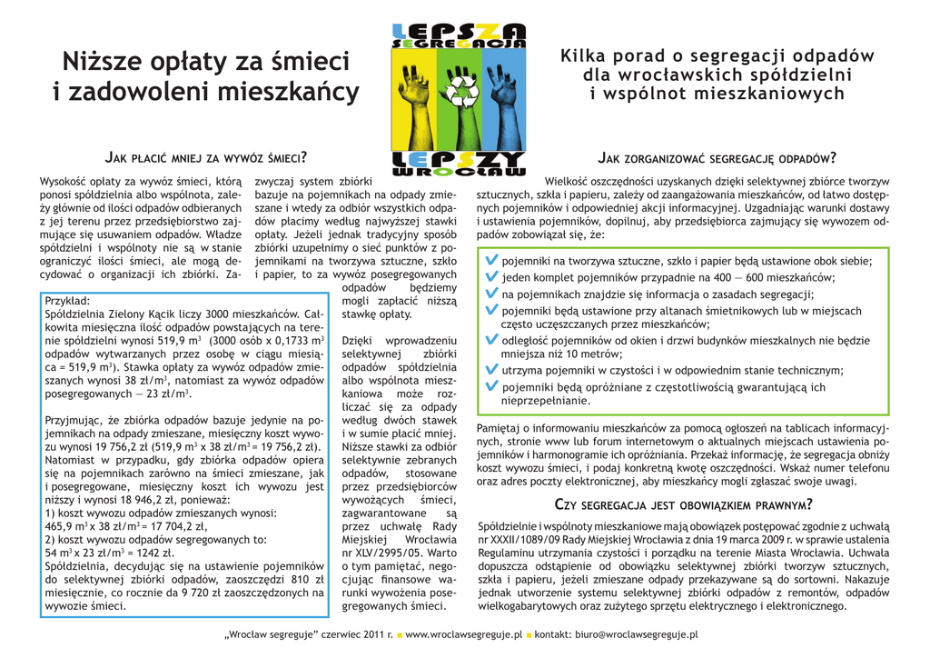 Kilka porad o segregacji odpadów dla wrocławskich spółdzielni i wspólnot mieszkaniowych Niższe opłaty za śmieci i zadowoleni mieszkańcy JAK PŁACIĆ MNIEJ ZA WYWÓZ ŚMIECI? Wysokość opłaty za wywóz śmieci, którą ponosi spółdzielnia albo wspólnota, zależy głównie od ilości odpadów odbieranych z jej terenu przez przedsiębiorstwo zajmujące się usuwaniem odpadów. Władze spółdzielni i wspólnoty nie są w stanie ograniczyć ilości śmieci, ale mogą decydować o organizacji ich zbiórki. Za- JAK zwyczaj system zbiórki bazuje na pojemnikach na odpady zmieszane i wtedy za odbiór wszystkich odpadów płacimy według najwyższej stawki opłaty. Jeżeli jednak tradycyjny sposób zbiórki uzupełnimy o sieć punktów z pojemnikami na tworzywa sztuczne, szkło i papier, to za wywóz posegregowanych odpadów będziemy Przykład: mogli zapłacić niższą Spółdzielnia Zielony Kącik liczy 3000 mieszkańców. Całstawkę opłaty. kowita miesięczna ilość odpadów powstających na terenie spółdzielni wynosi 519,9 m3 (3000 osób x 0,1733 m3 Dzięki wprowadzeniu odpadów wytwarzanych przez osobę w ciągu miesiąselektywnej zbiórki ca = 519,9 m3). Stawka opłaty za wywóz odpadów zmieodpadów spółdzielnia szanych wynosi 38 zł/m3, natomiast za wywóz odpadów albo wspólnota mieszposegregowanych — 23 zł/m3. kaniowa może rozliczać się za odpady Przyjmując, że zbiórka odpadów bazuje jedynie na powedług dwóch stawek jemnikach na odpady zmieszane, miesięczny koszt wywoi w sumie płacić mniej. zu wynosi 19 756,2 zł (519,9 m3 x 38 zł/m3 = 19 756,2 zł). Niższe stawki za odbiór Natomiast w przypadku, gdy zbiórka odpadów opiera selektywnie zebranych się na pojemnikach zarówno na śmieci zmieszane, jak odpadów, stosowane i posegregowane, miesięczny koszt ich wywozu jest przez przedsiębiorców niższy i wynosi 18 946,2 zł, ponieważ: wywożących śmieci, 1) koszt wywozu odpadów zmieszanych wynosi: zagwarantowane są 465,9 m3 x 38 zł/m3 = 17 704,2 zł, przez uchwałę Rady 2) koszt wywozu odpadów segregowanych to: Miejskiej Wrocławia 54 m3 x 23 zł/m3 = 1242 zł. nr XLV/2995/05. Warto Spółdzielnia, decydując się na ustawienie pojemników o tym pamiętać, negodo selektywnej zbiórki odpadów, zaoszczędzi 810 zł cjując finansowe wamiesięcznie, co rocznie da 9 720 zł zaoszczędzonych na runki wywożenia posewywozie śmieci. gregowanych śmieci. „Wrocław segreguje” czerwiec 2011 r. ZORGANIZOWAĆ SEGREGACJĘ ODPADÓW? Wielkość oszczędności uzyskanych dzięki selektywnej zbiórce tworzyw sztucznych, szkła i papieru, zależy od zaangażowania mieszkańców, od łatwo dostępnych pojemników i odpowiedniej akcji informacyjnej. Uzgadniając warunki dostawy i ustawienia pojemników, dopilnuj, aby przedsiębiorca zajmujący się wywozem odpadów zobowiązał się, że: pojemniki na tworzywa sztuczne, szkło i papier będą ustawione obok siebie; jeden komplet pojemników przypadnie na 400 — 600 mieszkańców; na pojemnikach znajdzie się informacja o zasadach segregacji; pojemniki będą ustawione przy altanach śmietnikowych lub w miejscach często uczęszczanych przez mieszkańców; odległość pojemników od okien i drzwi budynków mieszkalnych nie będzie mniejsza niż 10 metrów; utrzyma pojemniki w czystości i w odpowiednim stanie technicznym; pojemniki będą opróżniane z częstotliwością gwarantującą ich nieprzepełnianie. Pamiętaj o informowaniu mieszkańców za pomocą ogłoszeń na tablicach informacyjnych, stronie www lub forum internetowym o aktualnych miejscach ustawienia pojemników i harmonogramie ich opróżniania. Przekaż informację, że segregacja obniży koszt wywozu śmieci, i podaj konkretną kwotę oszczędności. Wskaż numer telefonu oraz adres poczty elektronicznej, aby mieszkańcy mogli zgłaszać swoje uwagi. CZY SEGREGACJA JEST OBOWIĄZKIEM PRAWNYM? Spółdzielnie i wspólnoty mieszkaniowe mają obowiązek postępować zgodnie z uchwałą nr XXXII/1089/09 Rady Miejskiej Wrocławia z dnia 19 marca 2009 r. w sprawie ustalenia Regulaminu utrzymania czystości i porządku na terenie Miasta Wrocławia. Uchwała dopuszcza odstąpienie od obowiązku selektywnej zbiórki tworzyw sztucznych, szkła i papieru, jeżeli zmieszane odpady przekazywane są do sortowni. Nakazuje jednak utworzenie systemu selektywnej zbiórki odpadów z remontów, odpadów wielkogabarytowych oraz zużytego sprzętu elektrycznego i elektronicznego. www.wroclawsegreguje.pl kontakt: [email protected]