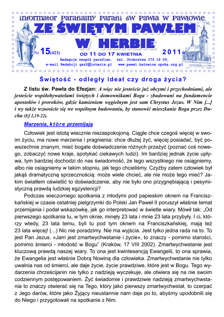 Nr 15(423) 2 0 11 R. OD 11 DO 17 KWIETNIA Redaguje zespół parafian. tel. Probostwa 275 14 09, e-mail Redakcji [email protected] www.pawel.katowice.opoka.org.pl Świętość - odległy ideał czy droga życia? Z listu św. Pawła do Efezjan: A więc nie jesteście już obcymi i przychodniami, ale jesteście współobywatelami świętych i domownikami Boga - zbudowani na fundamencie apostołów i proroków, gdzie kamieniem węgielnym jest sam Chrystus Jezus. W Nim [...] i wy także wznosicie się we wspólnym budowaniu, by stanowić mieszkanie Boga przez Ducha (Ef 2,19-22). Marzenia, k t ó r e przemijają Człowiek jest istotą wiecznie niezaspokojoną. Ciągle chce czegoś więcej w swoim życiu, ma nowe marzenia i pragnienia: chce dłużej żyć, więcej posiadać, być powszechnie znanym, mieć bogate doświadczenie różnych przeżyć (poznać coś nowego, zobaczyć nowe kraje, spotykać ciekawych ludzi). Im bardziej jednak życie upływa, tym bardziej dochodzi do nas świadomość, że tego wszystkiego nie osiągniemy, albo nie osiągniemy w takim stopniu, jak tego chcieliśmy. Czyżby zatem człowiek był jakąś dramatyczną sprzecznością: może wiele chcieć, ale nie może tego mieć? Jakim światłem oświetlić to doświadczenie, aby nie było ono przygnębiającą i pesymistyczną prawdą ludzkiej egzystencji? Podczas wieczornego spotkania z młodymi pod papieskim oknem na Franciszkańskiej w czasie ostatniej pielgrzymki do Polski Jan Paweł II poruszył właśnie temat przemijania i podał wskazówkę, jak go interpretować w świetle wiary. Mówił tak: „Od pierwszego spotkania tu, w tym oknie, minęły 23 lata i mnie 23 lata przybyły. I ci, którzy wtedy, 23 lata temu, byli tu pod tym oknem na Franciszkańskiej, mają też 23 lata więcej! (...) Nic nie poradzimy. Nie ma wyjścia. Jest tylko jedna rada na to. To jest Pan Jezus. «Jam jest zmartwychwstanie i życie», to znaczy - pomimo starości, pomimo śmierci - młodość w Bogu” (Kraków, 17 VIII 2002). Zmartwychwstanie jest kluczową prawdą naszej wiary. To ona jest kwintesencją Ewangelii, to ona sprawia, że Ewangelia jest właśnie Dobrą Nowiną dla człowieka. Zmartwychwstanie nie tylko uwalnia nas od śmierci, ale daje życie, życie prawdziwe, które jest w Bogu. Tego wydarzenia chrześcijanin nie tylko z nadzieją wyczekuje, ale otwiera się na nie swoim codziennym postępowaniem. Żyć świadomie i prawdziwie nadzieją zmartwychwstania to znaczy otwierać się na Tego, który jako pierwszy zmartwychwstał, to czerpać z Jego darów, które jako Żyjący nieustannie nam daje po to, abyśmy upodobnili się do Niego i przygotowali na spotkanie z Nim. Świętość a życie wieczne Świętość, do której zachęcał Jan Paweł II, to zapowiedź i zarazem jedyna droga do życia wiecznego. Nie można osiągnąć tego życia, nie będąc świętym, czyli podobnym do Boga. Problem pragnienia świętości to problem zrozumienia, czym jest życie wieczne. Te dwie sprawy są ze sobą nierozdzielnie złączone. Jeśli rzeczywiście pragniemy tego życia, to będziemy się starali o świętość. Tymczasem współczesny człowiek, jak zauważa Benedykt XVI w encyklice o nadziei, zdaje się być obojętny wobec życia wiecznego. „Czy naprawdę tego chcemy - pisze Papież - żyć wiecznie? Być może wiele osób odrzuca dziś wiarę, gdyż życie wieczne nie wydaje się im rzeczą pożądaną. Nie chcą życia wiecznego, lecz obecnego, a wiara w życie wieczne wydaje im się w tym przeszkodą” (Spe salvi, 10). I dalej Papież stawia sobie i nam pytanie: Czym jest życie wieczne? I daje próbę odpowiedzi: To „moment zanurzenia się w oceanie nieskończonej miłości, w którym czas - przed i potem - już nie istnieje. (...) Ten moment jest życiem w pełnym znaczeniu, wciąż nowym zanurzaniem się w głębię istnienia” (Spe salvi, 12). To słowa warte głębszej medytacji, ale i one nie są w stanie opisać prawdy życia wiecznego do końca, ani nawet jej przybliżyć. Gdybyśmy mogli sobie przypomnieć w naszym życiu bodaj jakiś moment prawdziwego odczucia szczęścia, którego doświadczyliśmy - pełnego zaspokojenia, wewnętrznego pokoju, radości, bezpieczeństwa i miłości ze strony innych - to i tak byłoby to złudne, bo nawet, jeśli taki moment przeżywaliśmy, to towarzyszył mu zawsze niepokój, że to przeminie, że jest to moment ulotny i niestały, że za chwilę przyjdą troski i kłopoty. Tymczasem życie wieczne to absolutna pełnia istnienia, któremu nic nie zagraża, to szczęście, życie „pełną piersią”, bez żadnego cienia niepokoju czy obaw. W modlitwie o beatyfikację Jana Pawła II, którą od dłuższego czasu odmawiamy, wspominamy go między innymi jako tego, który „wskazywał świętość, która jest miarą życia chrześcijańskiego, jako drogę do osiągnięcia wiecznego zjednoczenia z Bogiem”. To jest chyba największy testament Papieża: świętość jako droga do życia wiecznego, a zarazem najbardziej oczywista prawda naszej wiary, którą na nowo musimy odkryć, jeśli rzeczywiście zależy nam na życiu wiecznym. Pytania do rachunku sumienia Czy zastanawiasz się nad celem i sensem swojego życia? Jak go formułujesz? Czy to, że przez Chrzest Święty jesteś „współobywatelem świętych i domownikiem Boga” jest dla ciebie najważniejsze? Czy dziękujesz Bogu za dar życia Chrystusa w tobie? Czy starasz się usilnie być świadkiem wiary w życie wieczne? Jak korzystasz z sakramentu pokuty? Jakie jest twoje uczestnictwo we Mszy św.? Do rozważania w czasie modlitwy indywidualnej lub - jeśli to możliwe - rodzinnej: Mt 22,1-14; J 3,1-17; J 6, 27-59; J 17,3; Ga 3.26-28; Ga 4,4-7; l J 5,7-13; Ap 19,5-9; Ps 26; Ps 42; Ps 100; Ps 118; Ps 119. Mój Londyn, Londyn o jakim nie piszą… Asia Kozub No i buchnęło majem. Niespodziewanie i gwałtownie. W ciągu dwóch dni zrobiło się bardzo zielono, różowo, biało i pachnąco. Przeżywamy parafialne r