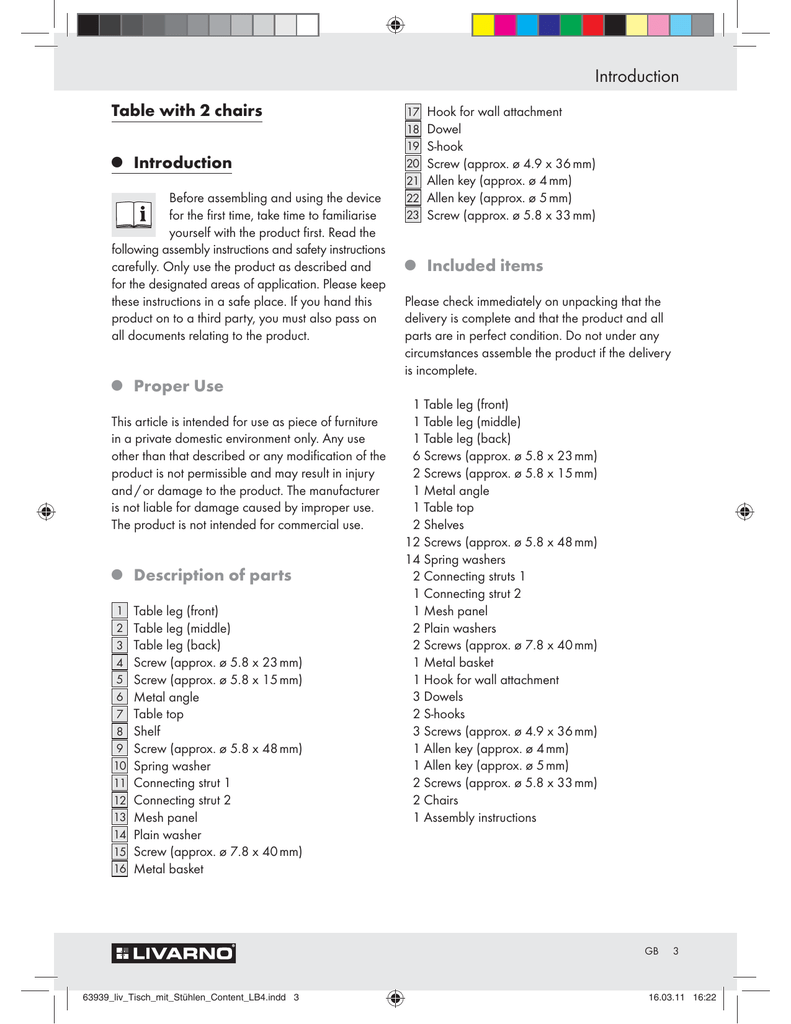 Introduction Table with 2 chairs Introduction Before assembling and using the device for the first time, take time to familiarise yourself with the product first. Read the following assembly instructions and safety instructions carefully. Only use the product as described and for the designated areas of application. Please keep these instructions in a safe place. If you hand this product on to a third party, you must also pass on all documents relating to the product. 17 18 19 20 21 22 23 Hook for wall attachment Dowel S-hook Screw (approx. ø 4.9 x 36 mm) Allen key (approx. ø 4 mm) Allen key (approx. ø 5 mm) Screw (approx. ø 5.8 x 33 mm) Included items Please check immediately on unpacking that the delivery is complete and that the product and all parts are in perfect condition. Do not under any circumstances assemble the product if the delivery is incomplete. Proper Use This article is intended for use as piece of furniture in a private domestic environment only. Any use other than that described or any modification of the product is not permissible and may result in injury and / or damage to the product. The manufacturer is not liable for damage caused by improper use. The product is not intended for commercial use. Description of parts 1 2 3 4 5 6 7 8 9 10 11 12 13 14 15 16 Table leg (front) Table leg (middle) Table leg (back) Screw (approx. ø 5.8 x 23 mm) Screw (approx. ø 5.8 x 15 mm) Metal angle Table top Shelf Screw (approx. ø 5.8 x 48 mm) Spring washer Connecting strut 1 Connecting strut 2 Mesh panel Plain washer Screw (approx. ø 7.8 x 40 mm) Metal basket 1 Table leg (front) 1 Table leg (middle) 1 Table leg (back) 6 Screws (approx. ø 5.8 x 23 mm) 2 Screws (approx. ø 5.8 x 15 mm) 1 Metal angle 1 Table top 2 Shelves 12 Screws (approx. ø 5.8 x 48 mm) 14 Spring washers 2 Connecting struts 1 1 Connecting strut 2 1 Mesh panel 2 Plain washers 2 Screws (approx. ø 7.8 x 40 mm) 1 Metal basket 1 Hook for wall attachment 3 Dowels 2 S-hooks 3 Screws (approx. ø 4.9 x 36 mm) 1 Allen key (approx. ø 4 mm) 1 Allen key (approx. ø 5 mm) 2 Screws (approx. ø 5.8 x 33 mm) 2 Chairs 1 Assembly instructions GB 63939_liv_Tisch_mit_Stühlen_Content_LB4.indd 3 3 16.03.11 16:22 Introduction / Safety advice / Assembly Technical data Dimensions: Material: Weight: Max. load: Table: Approx. 50 x 168 x 105 cm (W x H x L) Chair: Approx. 37 x 82 x 43 cm (W x H x D) MDF, PVC / powder coating steel Table: Approx. 13.5 kg Chair: Approx. 3.25 kg Table: 80 kg Chair: 100 kg Safety advice KEEP ALL THE SAFETY ADVICE AND INSTRUCTIONS IN A SAFE PLACE FOR FUTURE REFERENCE! RISK OF LOSS OF LIFE OR ACCIDENT TO INFANTS AND CHILDREN! Never leave children unsupervised with the packaging materials. Danger of suffocation. This product is not a toy! RISK OF LOSS OF LIFE! Ensure that you do not strike electrical cables, gas or water pipes when you are drilling into the wall. If necessary, check the wall using a suitable detector before you drill. CAUTION! RISK OF INJURY! Please ensure that no parts are damaged and that all parts are correctly assembled. Incorrect assembly could lead to injury. Damaged parts could adversely affect safety and proper function. CAUTION! Do not leave children unsupervised! The product is not a climbing frame or a toy! Make sure that nobody, especially a child, climbs on or leans against the product. Otherwise the load on the product could become unbalanced and cause it to overturn, and result in injury and / or damage. CAUTION! RISK OF FIRE! Do not position the product near open flames or radiant fires. 4 Make sure that all the welded connections are intact. Regularly check the stability of all connections and retighten the screws regularly. Make sure that the product stands on a solid surface at floor level. Safe use of the product can only be ensured if all the parts are securely fitted together and the connections are securely locked in place. Check that the product is stable before using it. CAUTION! RISK OF SHEARING OR CRUSHING INJURY! Make sure your fingers do not become trapped when you are unpacking the product. A moment of inattention may result in a shearing or crushing injury. CAUTION! Do not lift or move the product if it is supporting any object. Do not exceed the allowable maximum loads on the table (80 kg) and kg the chairs (100 kg each). Failure to observe this advice may lead to injury and / or damage to the product. Never change the position of the product if objects are resting on the table / chairs. Distribute objects evenly on the table / chairs so that they do not tip over. Keep the product away from sources of water or moisture. Failure to observe this advice may result in damage to the product. Assembly Note: Assemble the product on an adequately large, scratch-proof surface. If necessary place a cover down first to prevent the product or the surface from being scratched. Assemble the product in accordance with Figs. A – D. Note: Retighten all threaded connections regularly. GB 63939_liv_Tisch_mit_Stühlen_Content_LB4.indd 4 16.03.11 16:22 Cleaning and care / Disposal / Service Cleaning and care Never use petrol, solvents or corrosive cleaning agents for cleaning the product. Use a slightly damp, fluff-free cloth for cleaning the product. Use a moist cloth and if necessary a mild detergent to remove stubborn dirt. Disposal The packaging is made entirely of recyclable materials, which you may dispose of at local recycling facilities. Contact your local refuse disposal authority for more details of how to dispose of your worn-out product. Service GB Service Great Britain Tel.: 0871 5000 720 (0,10 GBP/Min.) e-mail: [email protected] IAN 63939 Product description: Table with 2 chairs Model No.: Z30842 Version: 04 / 2011 GB 63939_liv_Tisch_mit_Stühlen_Content_LB4.indd 5 5 16.03.11 16:22 Wstęp Stół z 2 krzesłami Wstęp Proszę zapoznać się z produktem przed jego pierwszym użyciem. W tym celu należy uważnie prze czytać instrukcję montażu i wskazówki dot. bezpi