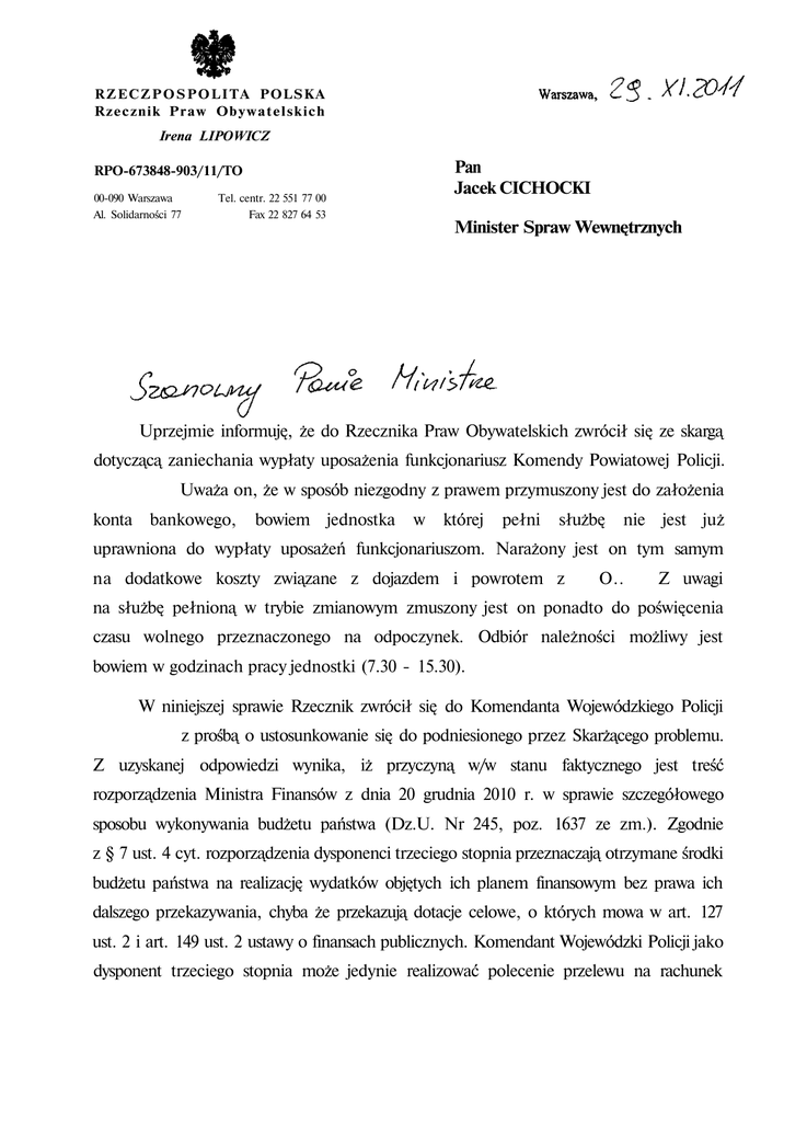 R Z E C Z P O S P O L I T A POLSKA R z e c z n i k Praw O b y w a t e l s k i c h Irena LIPOWICZ Pan Jacek CICHOCKI RPO-673848-903/11/TO 00-090 Warszawa Al. Solidarności 77 Tel. centr. 22 551 77 00 Fax 22 827 64 53 Minister Spraw Wewnętrznych Uprzejmie informuję, że do Rzecznika Praw Obywatelskich zwrócił się ze skargą dotyczącą zaniechania wypłaty uposażenia funkcjonariusz Komendy Powiatowej Policji. Uważa on, że w sposób niezgodny z prawem przymuszony jest do założenia konta bankowego, bowiem jednostka w której pełni służbę nie jest już uprawniona do wypłaty uposażeń funkcjonariuszom. Narażony jest on tym samym na dodatkowe koszty związane z dojazdem i powrotem z O.. Z uwagi na służbę pełnioną w trybie zmianowym zmuszony jest on ponadto do poświęcenia czasu wolnego przeznaczonego na odpoczynek. Odbiór należności możliwy jest bowiem w godzinach pracy jednostki (7.30 - 15.30). W niniejszej sprawie Rzecznik zwrócił się do Komendanta Wojewódzkiego Policji z prośbą o ustosunkowanie się do podniesionego przez Skarżącego problemu. Z uzyskanej odpowiedzi wynika, iż przyczyną w/w stanu faktycznego jest treść rozporządzenia Ministra Finansów z dnia 20 grudnia 2010 r. w sprawie szczegółowego sposobu wykonywania budżetu państwa (Dz.U. Nr 245, poz. 1637 ze zm.). Zgodnie z § 7 ust. 4 cyt. rozporządzenia dysponenci trzeciego stopnia przeznaczają otrzymane środki budżetu państwa na realizację wydatków objętych ich planem finansowym bez prawa ich dalszego przekazywania, chyba że przekazują dotacje celowe, o których mowa w art. 127 ust. 2 i art. 149 ust. 2 ustawy o finansach publicznych. Komendant Wojewódzki Policji jako dysponent trzeciego stopnia może jedynie realizować polecenie przelewu na rachunek 2 bankowy funkcjonariusza. Nie może przekazać środków na rzecz komendantów powiatowych Policji, którzy wypłacaliby uposażenie bezpośrednio do rąk funkcjonariuszy pełniących służbę w danej jednostce. Obowiązek realizowania w/w aktu wykonawczego powoduje, że obecnie nie ma technicznej możliwości wypłaty uposażenia do rąk funkcjonariusza w komendzie powiatowej Policji. Zgodnie z treścią art. 105 ust. 1 i 5 ustawy z dnia 6 kwietnia 1990 r. o Policji (Dz.U. z 2007 r. Nr 43, poz. 277 ze zm.) uposażenie i inne świadczenia oraz należności pieniężne są płatne bezpośrednio do rąk policjanta, z zastrzeżeniem ust. 5. Uposażenie i inne świadczenia oraz należności pieniężne mogą być wypłacane w formie bezgotówkowej, na warunkach ustalonych w pisemnym porozumieniu między płatnikiem i policjantem, nie wcześniej jednak niż w terminach, o których mowa w ust. 2-4. Z powyższych przepisów wynika reguła zgodnie z którą uposażenie jest płatne bezpośrednio do rąk funkcjonariusza oraz wyjątek - wypłacania należności na konto funkcjonariusza po jego wcześniejszym porozumieniu się z płatnikiem. Powyższe normy prawne nie nakładają na funkcjonariusza Policji obowiązku rozliczania się w formie bezgotówkowej a jedynie przyznają takie prawo (realizowane w porozumieniu z płatnikiem). Odstępstwo od reguły wypłaty do rąk policjanta wymaga bezwzględnie porozumienia się obu podmiotów stosunku służbowego. Żadnej zatem ze stron nie przysługuje prawo narzucenia swej woli drugiemu kontrahentowi. Podobne rozwiązanie funkcjonuje w systemie powszechnym - w art. 86 § 3 Kodeksu pracy - zgodnie z którym obowiązek wypłacenia wynagrodzenia może być spełniony w inny sposób niż do rąk pracownika, jeżeli tak stanowi układ zbiorowy pracy lub pracownik uprzednio wyrazi na to zgodę na piśmie. Wzrastające znaczenie obrotu bezgotówkowego, jego bezpieczeństwo i prostota, poprawa funkcjonowania systemu bankowego, zwłaszcza rozbudowa sieci bankomatów i punktów obsługi bankowej zapewniających łatwy dostęp do własnych pieniędzy spowodowały, że przekazywanie należności na bankowy osobisty rachunek rozliczeniowy funkcjonariusza stało się powszechne. W odróżnieniu od powszechnie przyjętej praktyki w pragmatyce służbowej funkcjonariuszy Policji obowiązuje jednak zasada, że należności wypłaca się do rąk policjanta. Pozostając w zgodzie z treścią rozporządzenia komendanci powiatowi Policji będą zmuszeni do wprowadzenia innych sposobów przekazywania kwot na wynagrodzenia pracowników, uposażenia funkcjonariuszy - bez 3 pośrednictwa przelewu bankowego - gwarantującego funkcjonariuszom i pracownikom otrzymywanie świadczeń w ustawowych terminach wypłaty. Takim sposobem będzie pobranie środków w komendzie wojewódzkiej Policji i następnie przekazanie ich do rąk własnych policjanta - co wiąże się z koniecznością wyjazdu - a tym samym dodatkowych kosztów dla budżetu Policji. Działając na podstawie art. 16 ust 1 ustawy z dnia 15 lipca 1987r. o Rzeczniku Praw Obywatelskich (Dz.U z 2001 r. Nr 14, poz. 147 ze zm.) zwracam się do Pana Ministra z uprzejmą prośbą o przedstawienie stanowiska wobec przedstawionego problemu.
