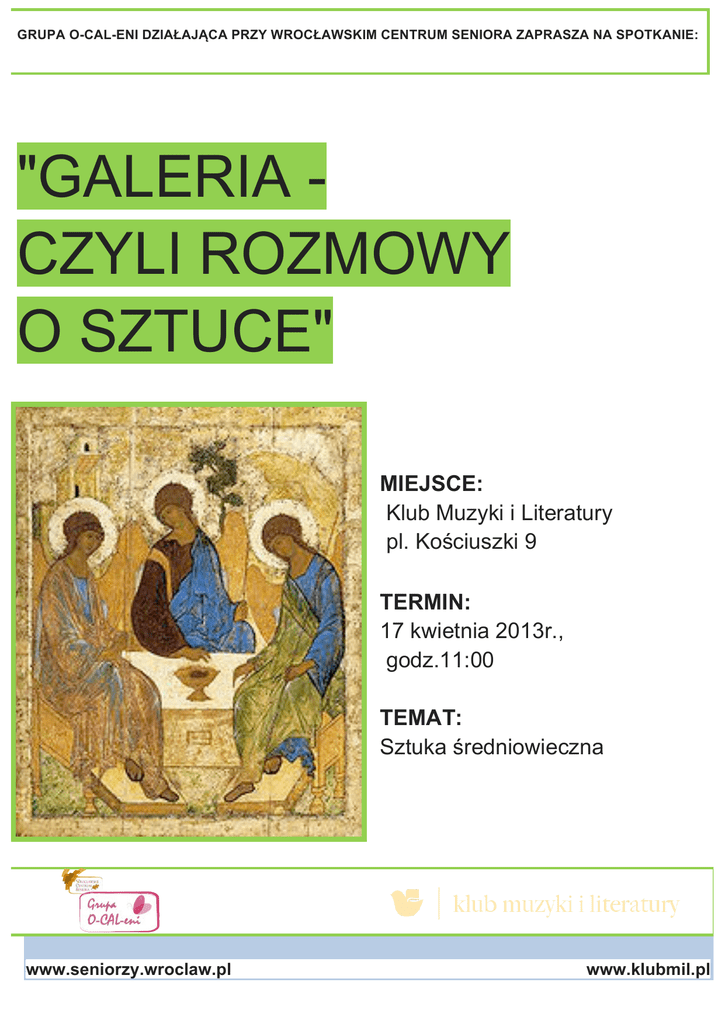 GRUPA O-CAL-ENI DZIAŁAJĄCA PRZY WROCŁAWSKIM CENTRUM SENIORA ZAPRASZA NA SPOTKANIE: "GALERIA CZYLI ROZMOWY O SZTUCE" MIEJSCE: Klub Muzyki i Literatury pl. Kościuszki 9 TERMIN: 17 kwietnia 2013r., godz.11:00 TEMAT: Sztuka średniowieczna www.seniorzy.wroclaw.pl www.klubmil.pl