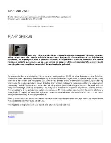 KPP GNIEZNO Źródło: http://www.gniezno.policja.gov.pl/wl3/aktualnosci/9845,Pijany-opiekun.html Wygenerowano: Środa, 8 marca 2017, 12:20 Strona znajduje się w archiwum. PIJANY OPIEKUN Policjanci referatu patrolowo – interwencyjnego zatrzymali pijanego dziadka, który ,,opiekował się’’ swoim 4-letnim wnuczkiem. Badanie przeprowadzone przez policjantów wykazało, że mężczyzna miał 3 promile alkoholu w organizmie. Śledczy postawili mu zarzut narażenia dziecka pozostającego po jego opieką na bezpośrednie niebezpieczeństwo utraty życia lub zdrowia za co grozi kara nawet do 5 lat pozbawienia wolności. Do zdarzenia doszło w niedzielę, 29 czerwca br. około godziny 11.30 na ulicy Budowlanych w Gnieźnie. Funkcjonariusze z Komendy Powiatowej Policji w Gnieźnie otrzymali zgłoszenie o pijanym mężczyźnie, który wchodzi z dzieckiem pod nadjeżdżające samochody. Stróże prawa niezwłocznie pojechali sprawdzić tę informację. Na miejscu policjanci zastali świadka, który widział mężczyznę mającego problemy z utrzymaniem równowagi, wchodzącego wraz z dzieckiem na ulicę wprost pod nadjeżdżające pojazdy. Świadek wskazał miejsce do którego udał się nietrzeźwy. Na miejscu w mieszkaniu znajdował się również babcia dziecka. Przeprowadzone przez policjantów badanie wykazało, że 56-letni opiekun dziecka miał 3 promile alkoholu w organizmie. Z uwagi na jego stan 4-letnim chłopcem zaopiekowała się jego babcia, mężczyzna został zatrzymany i osadzony w policyjnym areszcie. Śledczy przedstawili mu zarzut narażenia dziecka pozostającego bezpośrednio pod jego opieką na bezpośrednie niebezpieczeństwo utraty życia lub zdrowia. Przestępstwo to zagrożone jest karą nawet do 5 lat pozbawienia wolności. Ocena: 0/5 (0) Tweetnij
